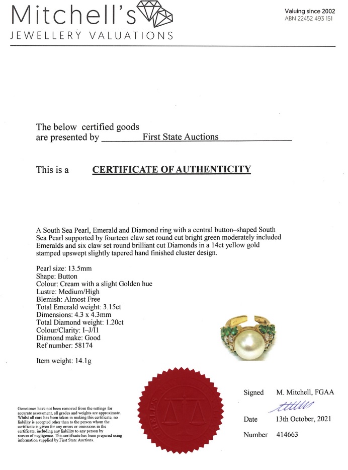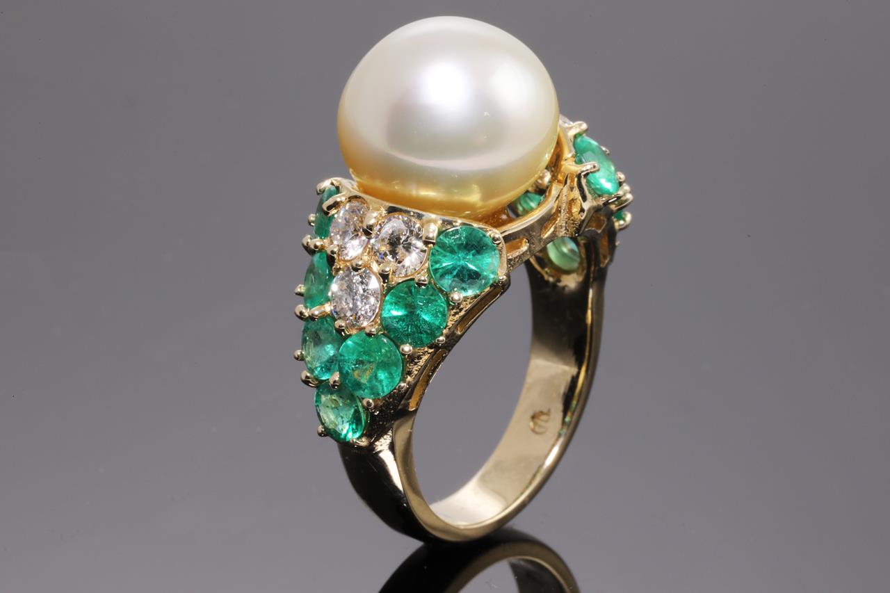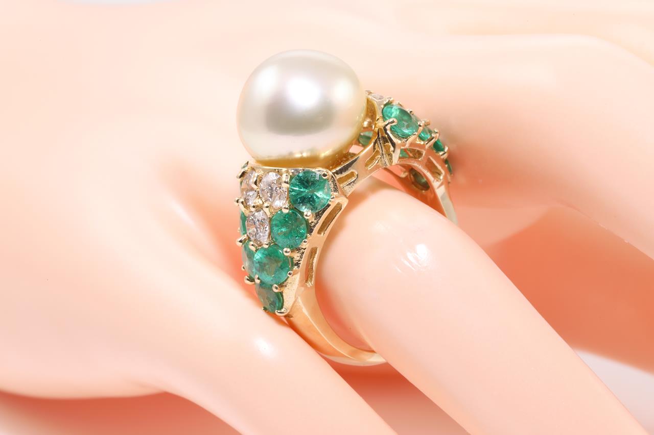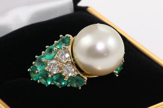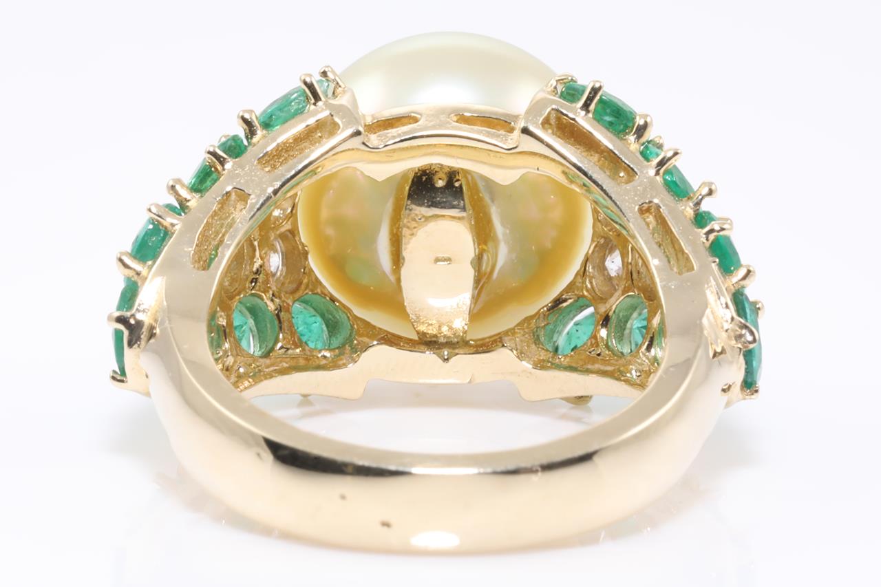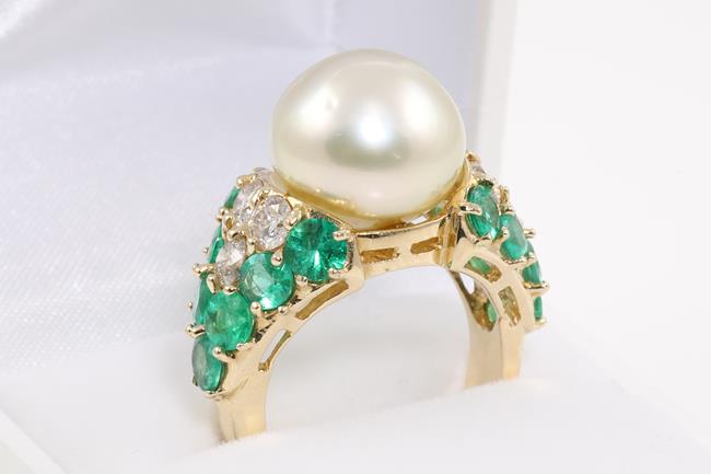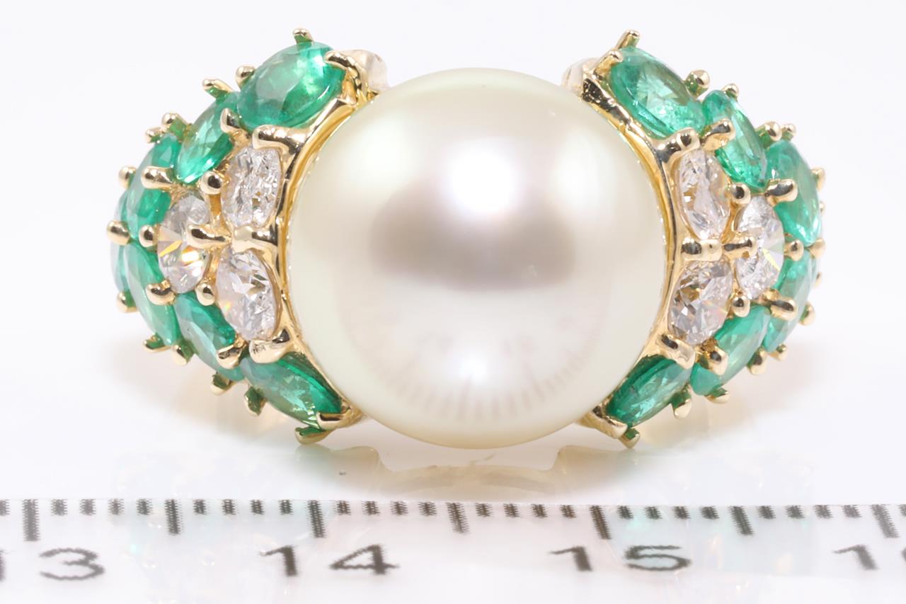 Pearl, Emerald and Diamond ring with South Sea Pearl of 13.5mm, round Diamonds totalling approximately 1.20cts (Estimated grading: I-J P1) and round Emeralds totalling approximately 3.15cts. 14ct yellow gold. Ring size P1/2. Weight 14.1g. With certificate #414663. (Pre-owned)