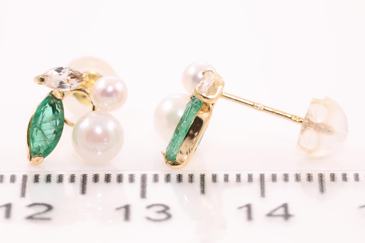 Pearl earrings with Akoya pearls of 3.1mm-4.6mm, marquise cut Emeralds totalling 0.60cts and white marquise cutTopaz totalling 0.20cts. 18ct yellow gold. Weight: 1g. (As new)
