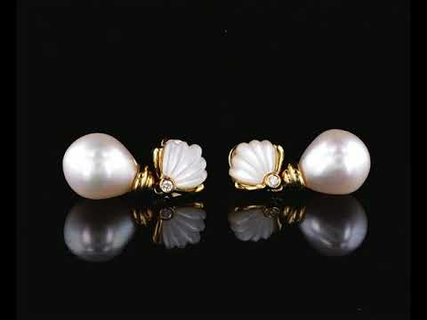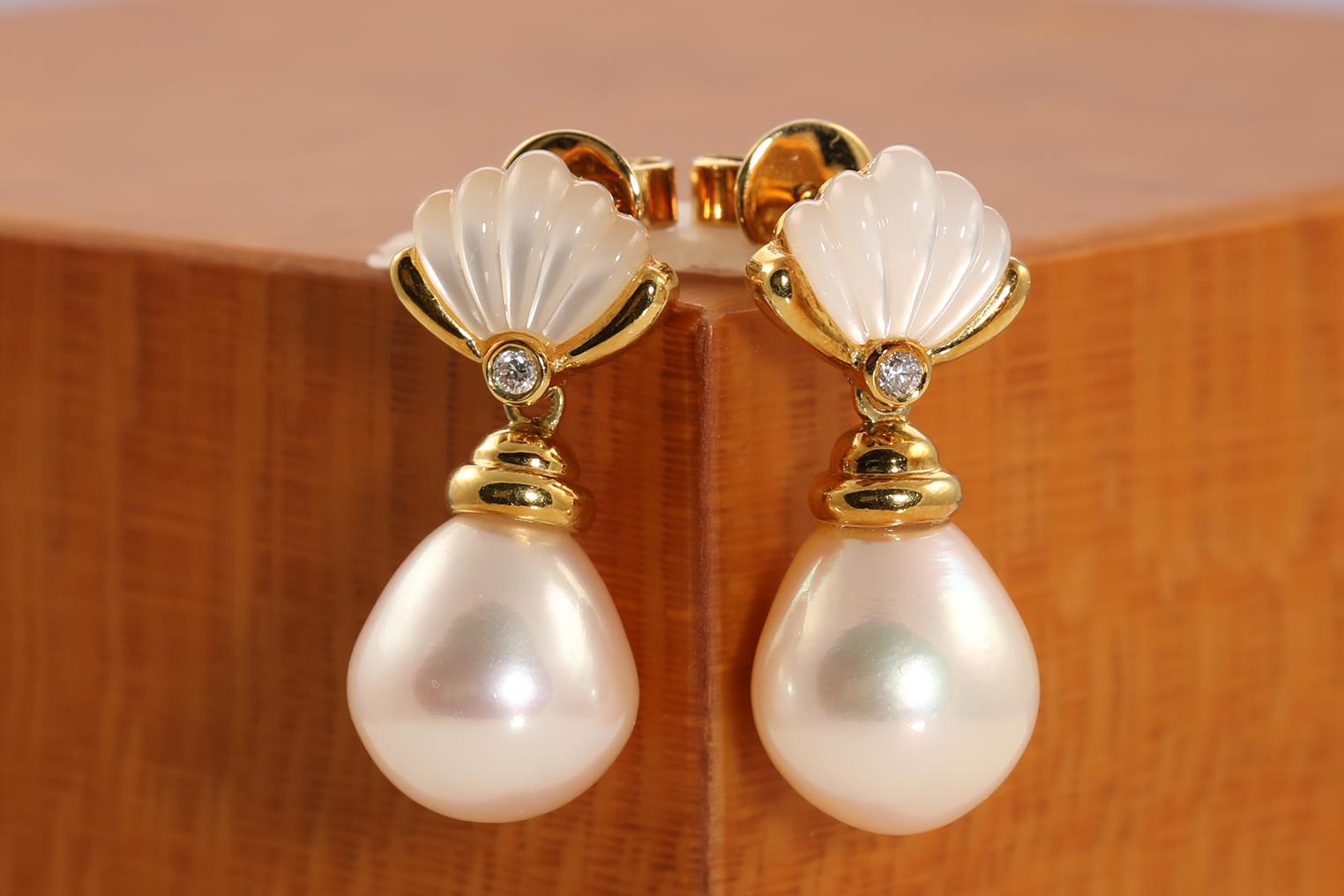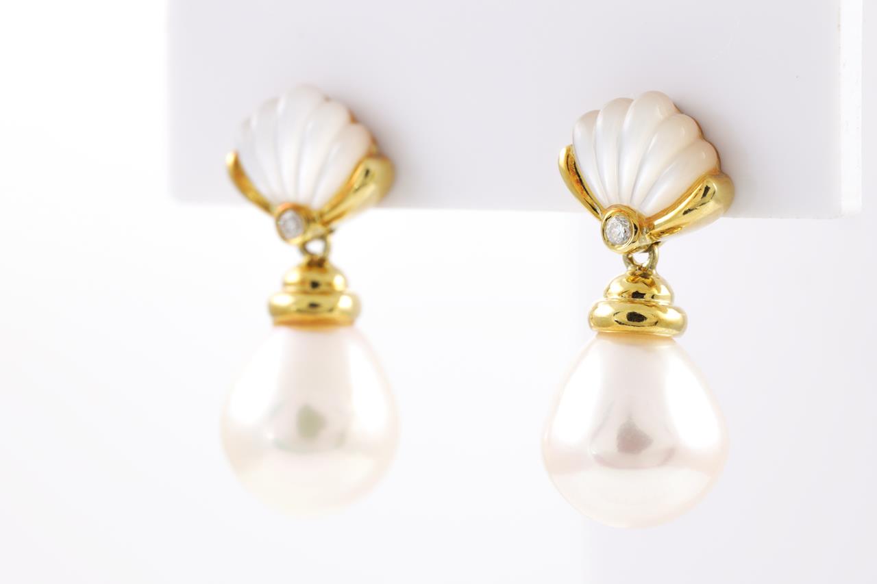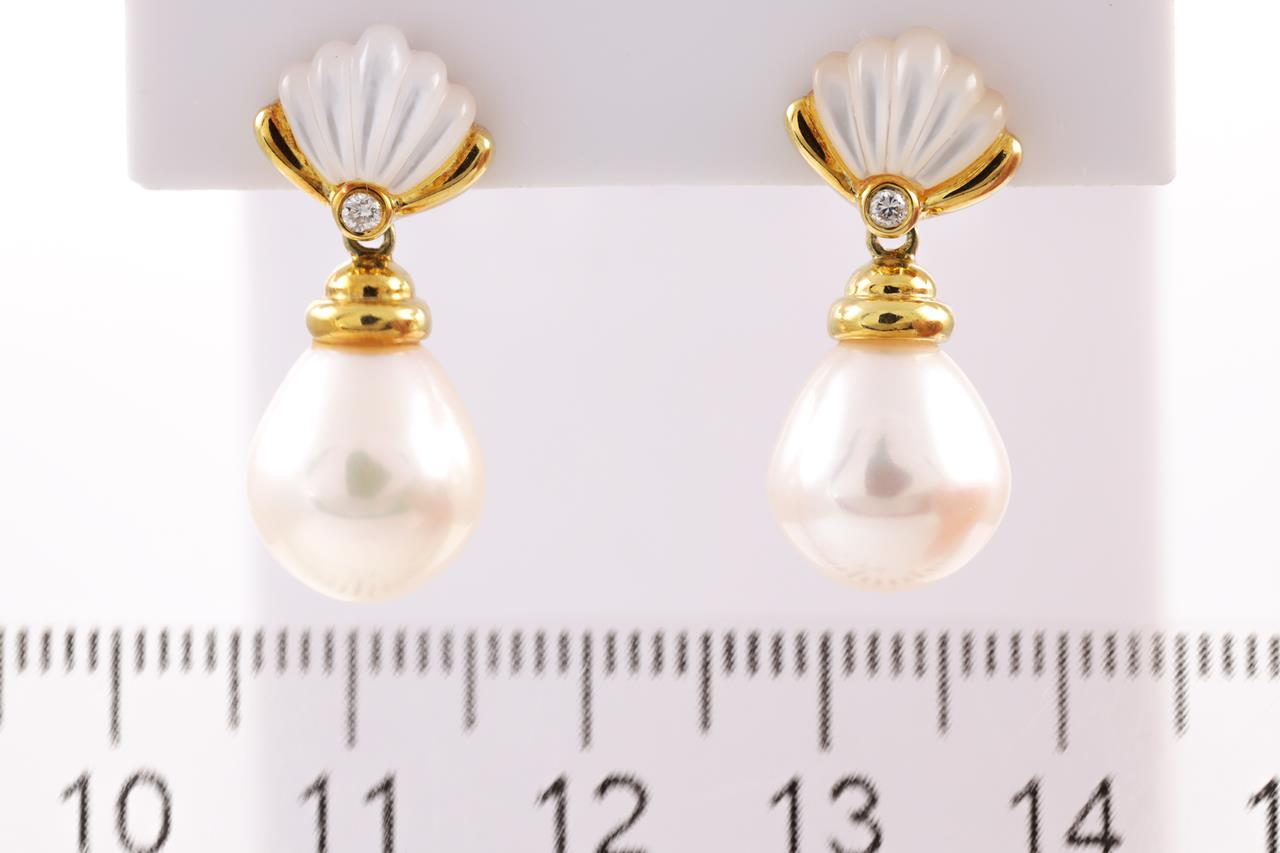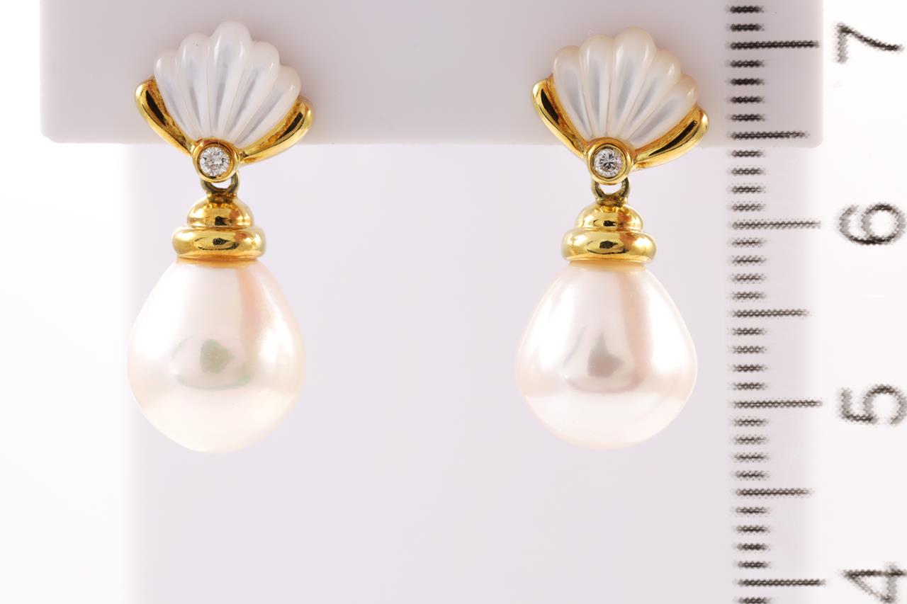 Pearl, Mother of Pearl and Diamond Earrings with drop shape cultured pearls of 10.1-10.2mm, Diamonds totalling 0.04cts. 18ct yellow gold. Weight: 7.5g (Pre-owned)
