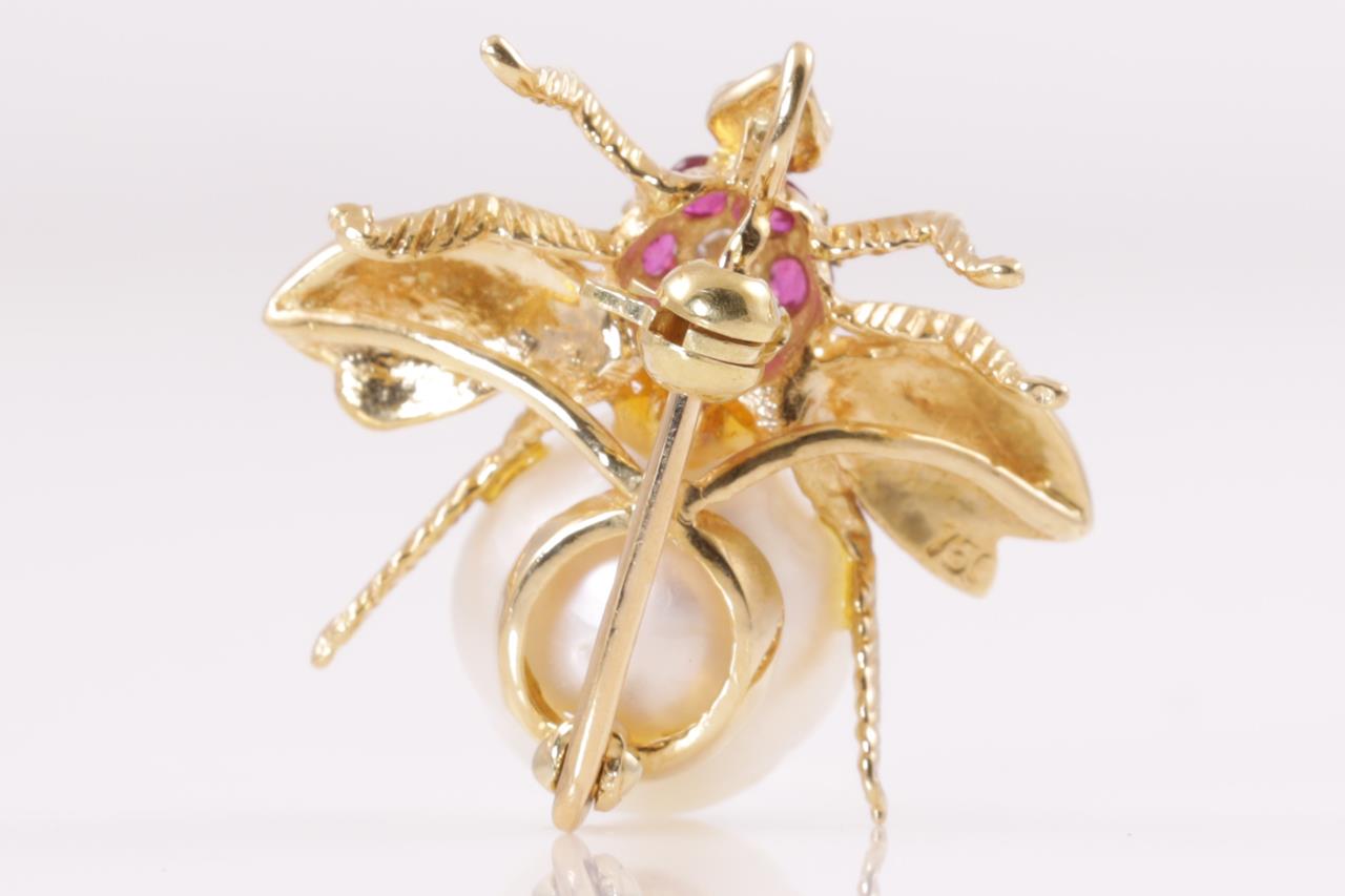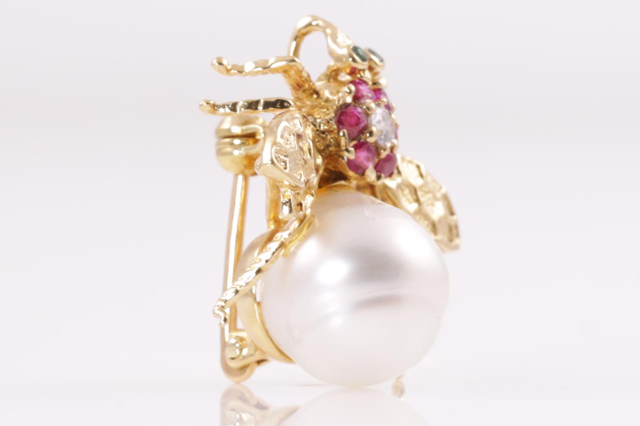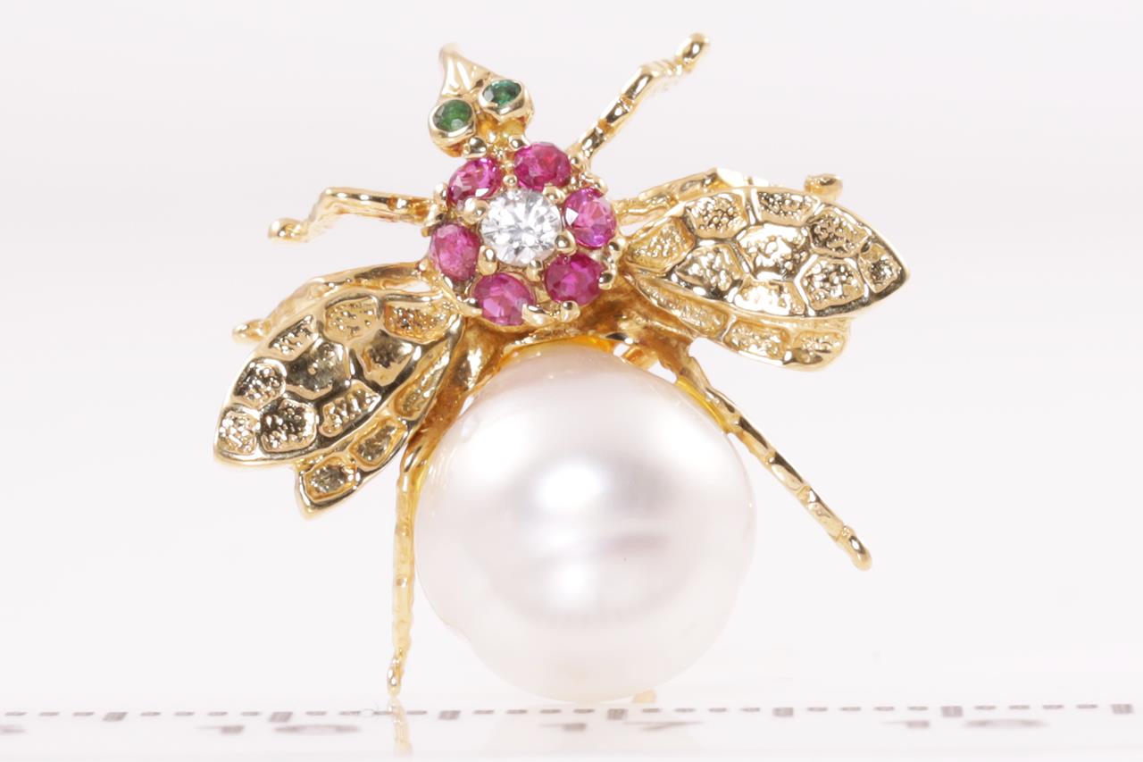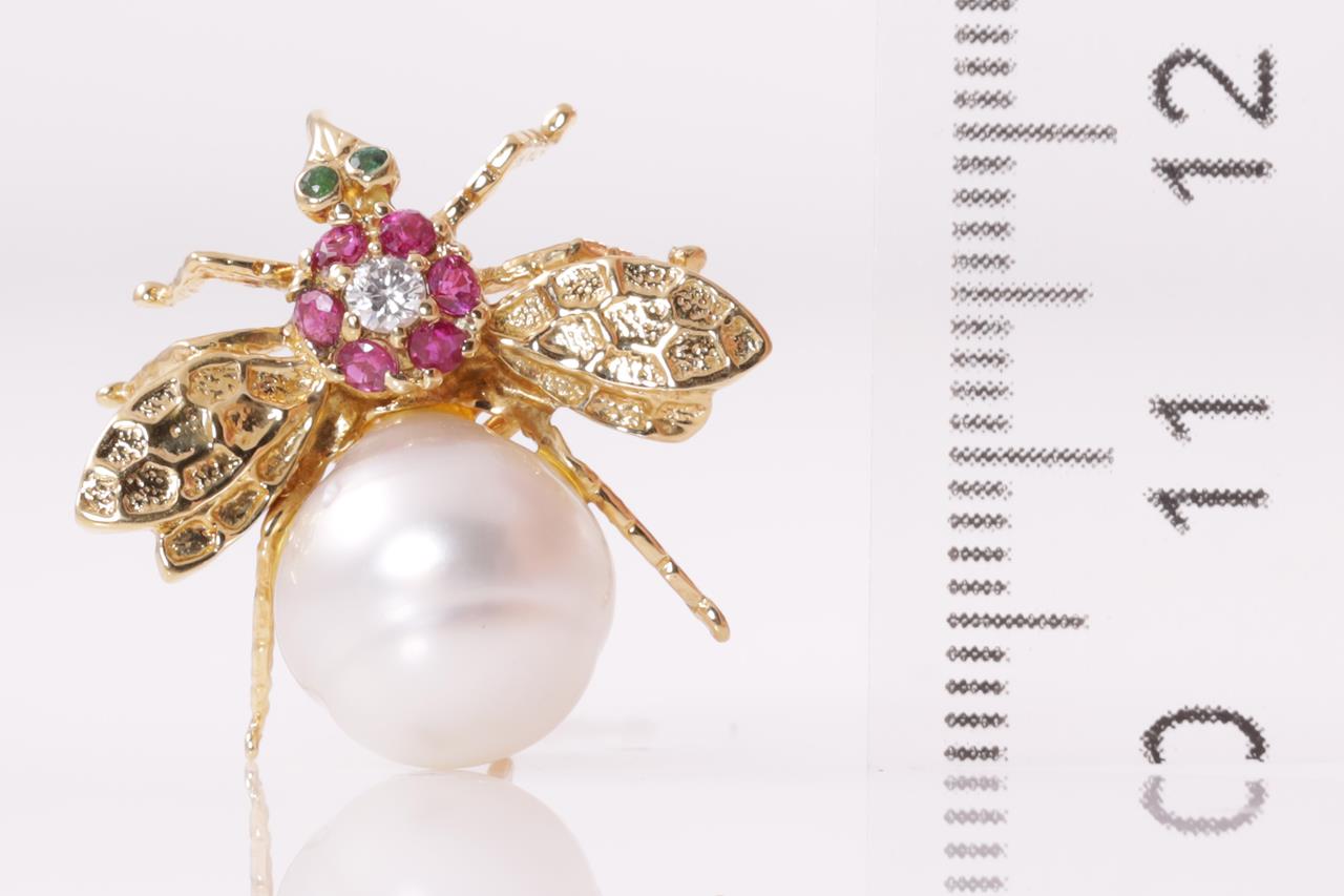 Multi Gemstone and Diamond fly design brooch/pendant with ringed South Sea Pearl of 10.4mm, round Diamond of 0.05ct, Rubies and Emeralds. 18ct yellow gold. Weight 4.8g. (Pre-owned)