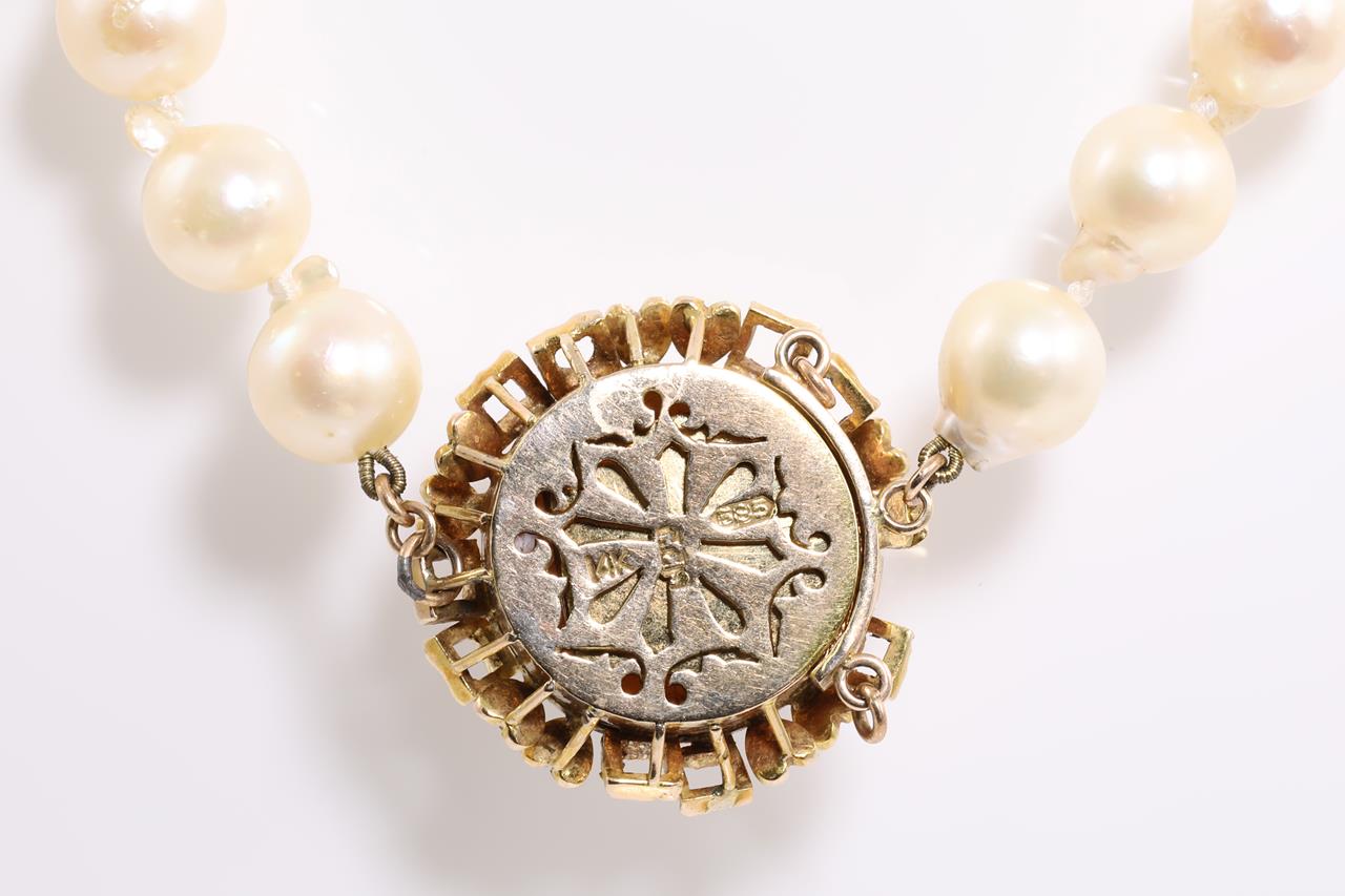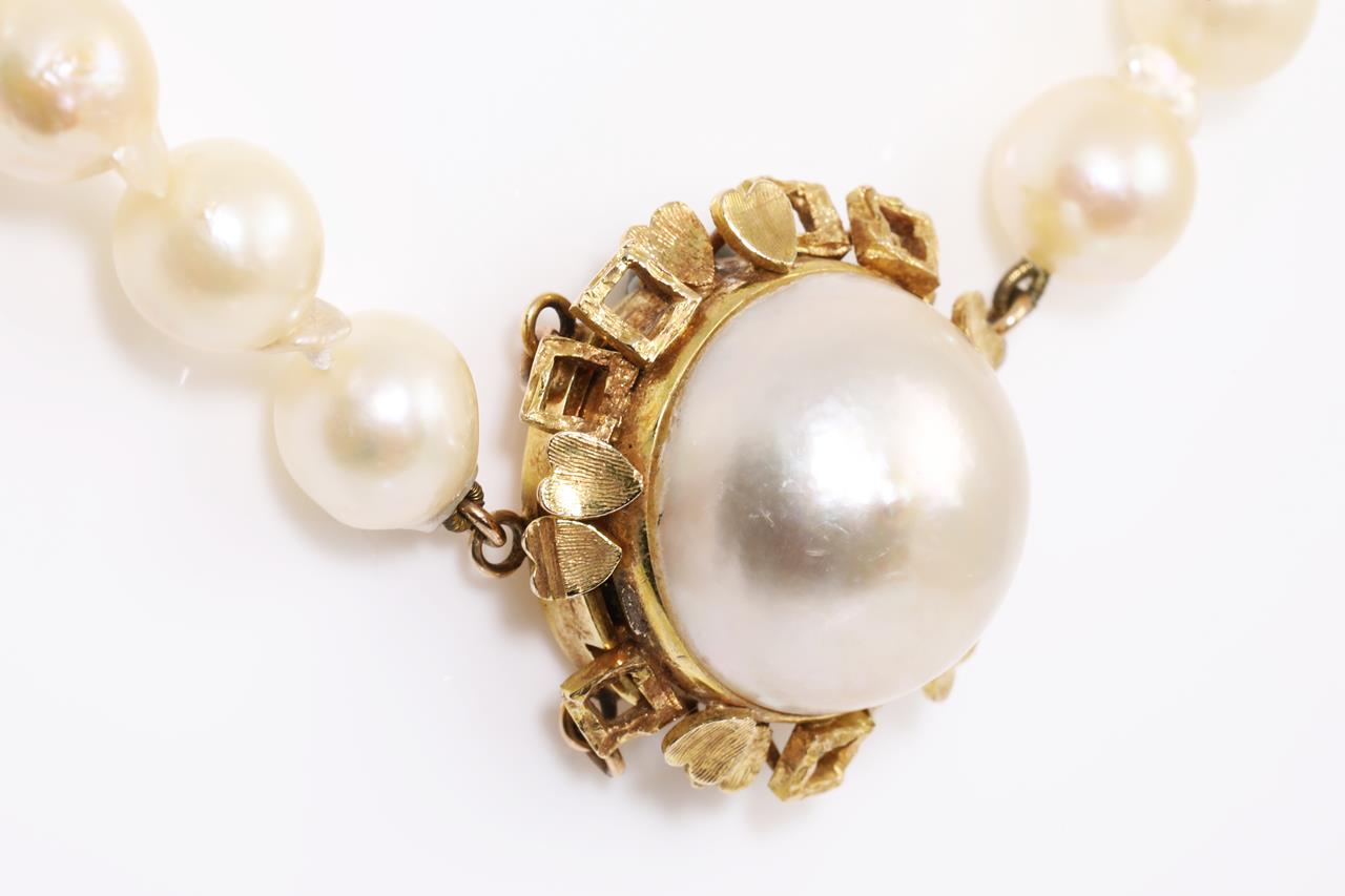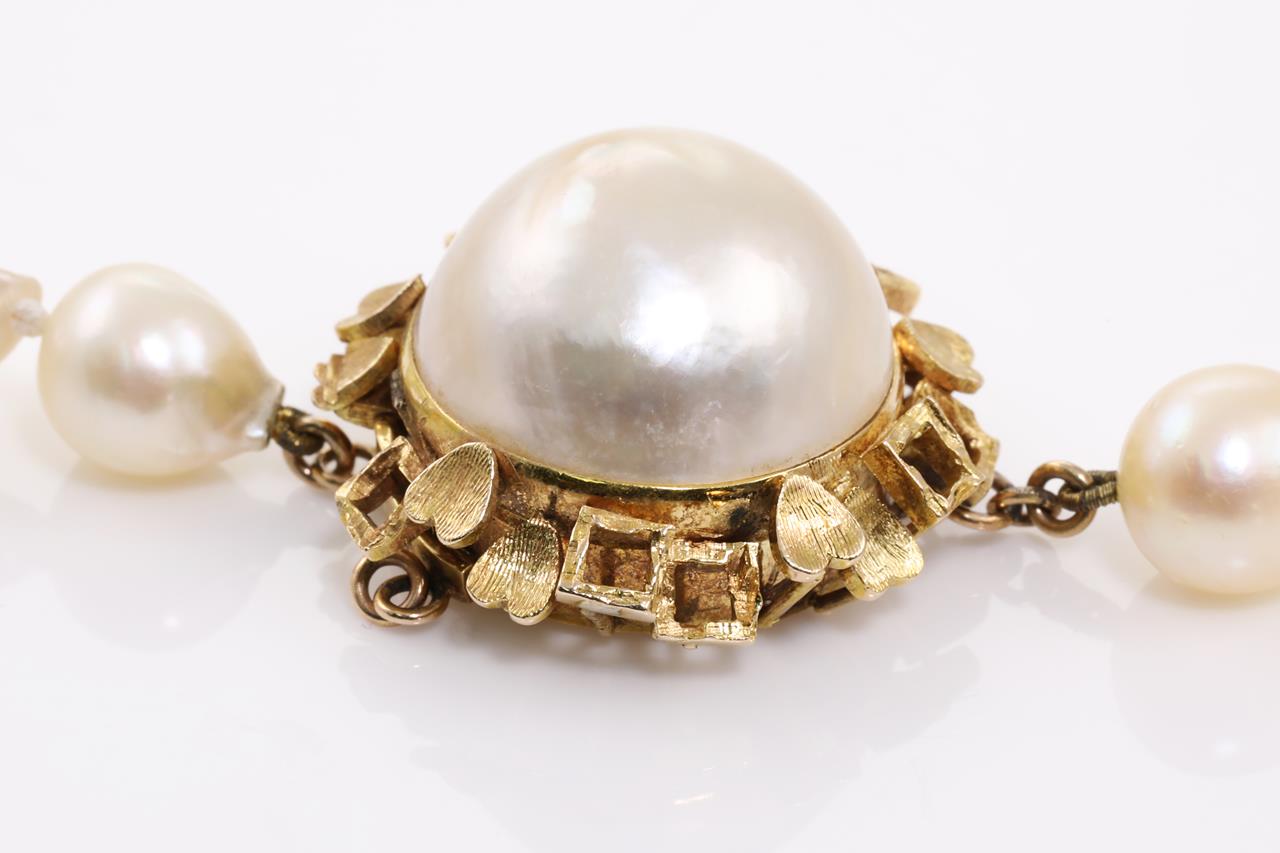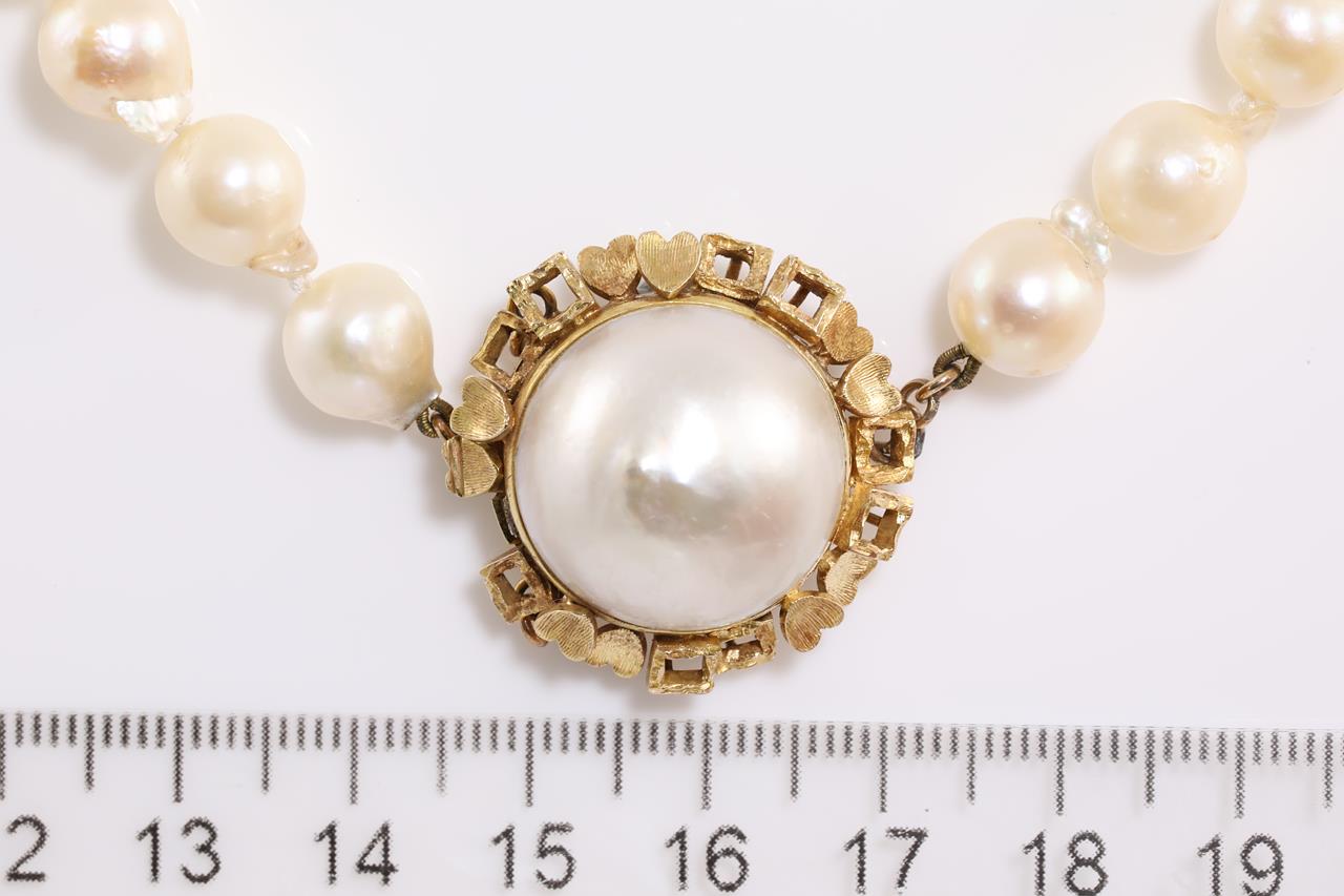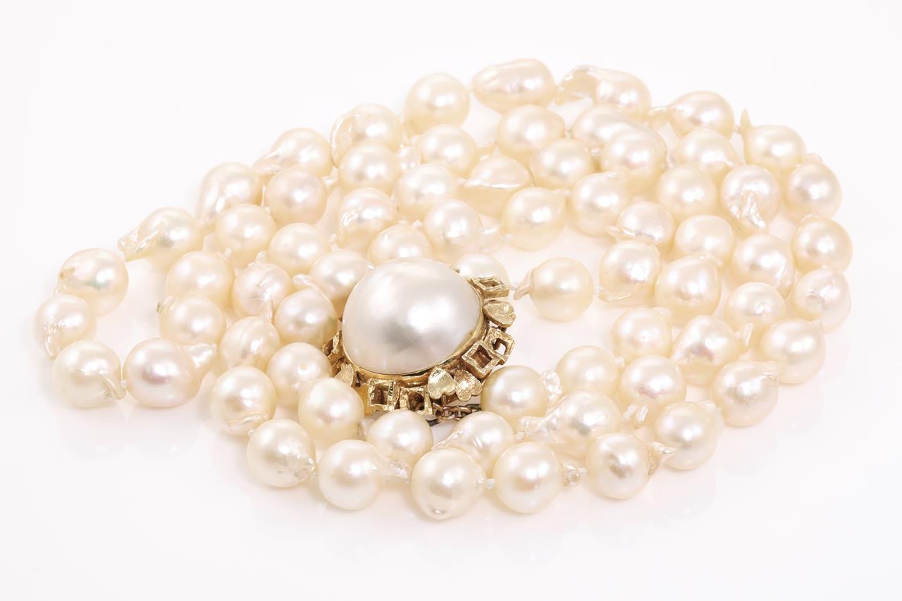A Pearl Necklace with Freshwater Pearls of approximately 8.3mm with 14ct yellow gold clasp with a Mabe Pearl of 18.5mm. Length 80cm. Weight 77.9g. (Pre-owned)