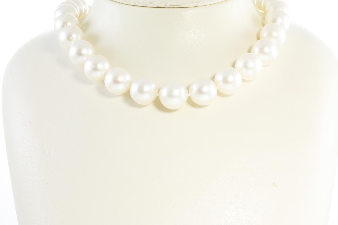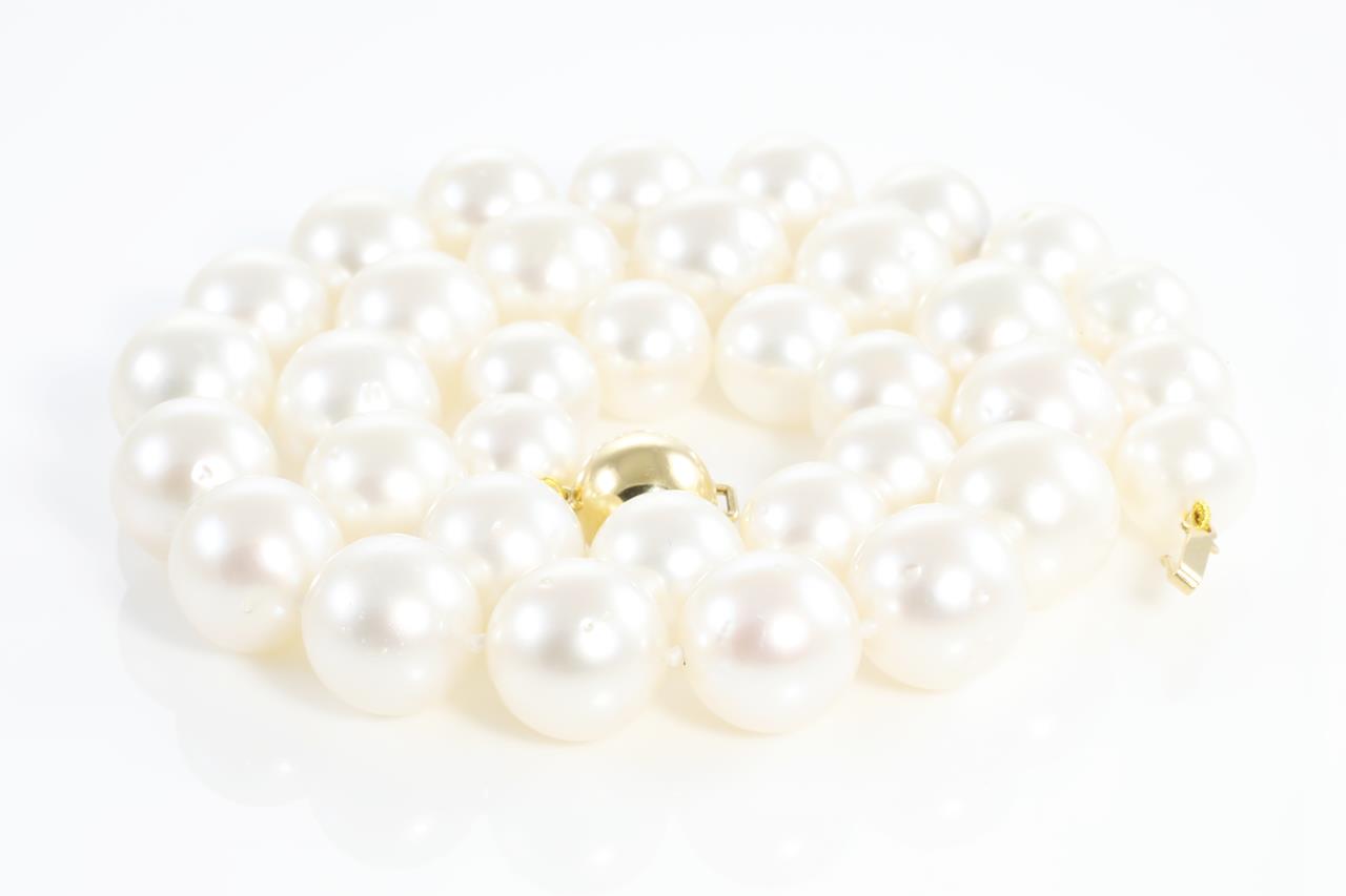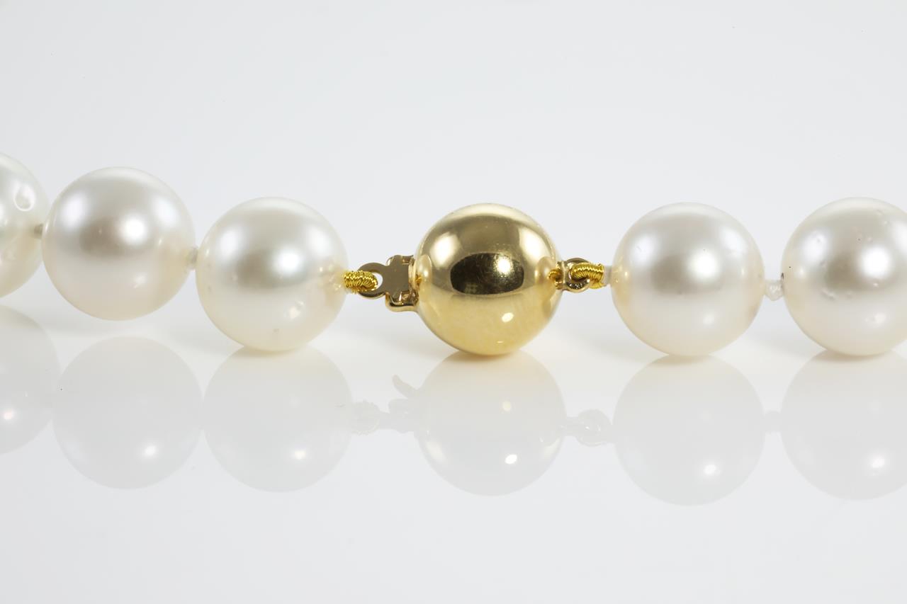 Pearl necklace with 35 graduated Australian South Sea Pearl of 10.0mm - 12.9mm. 18ct yellow gold plain ball clasp. Length: 44cm. Weight: 77.3g (New)