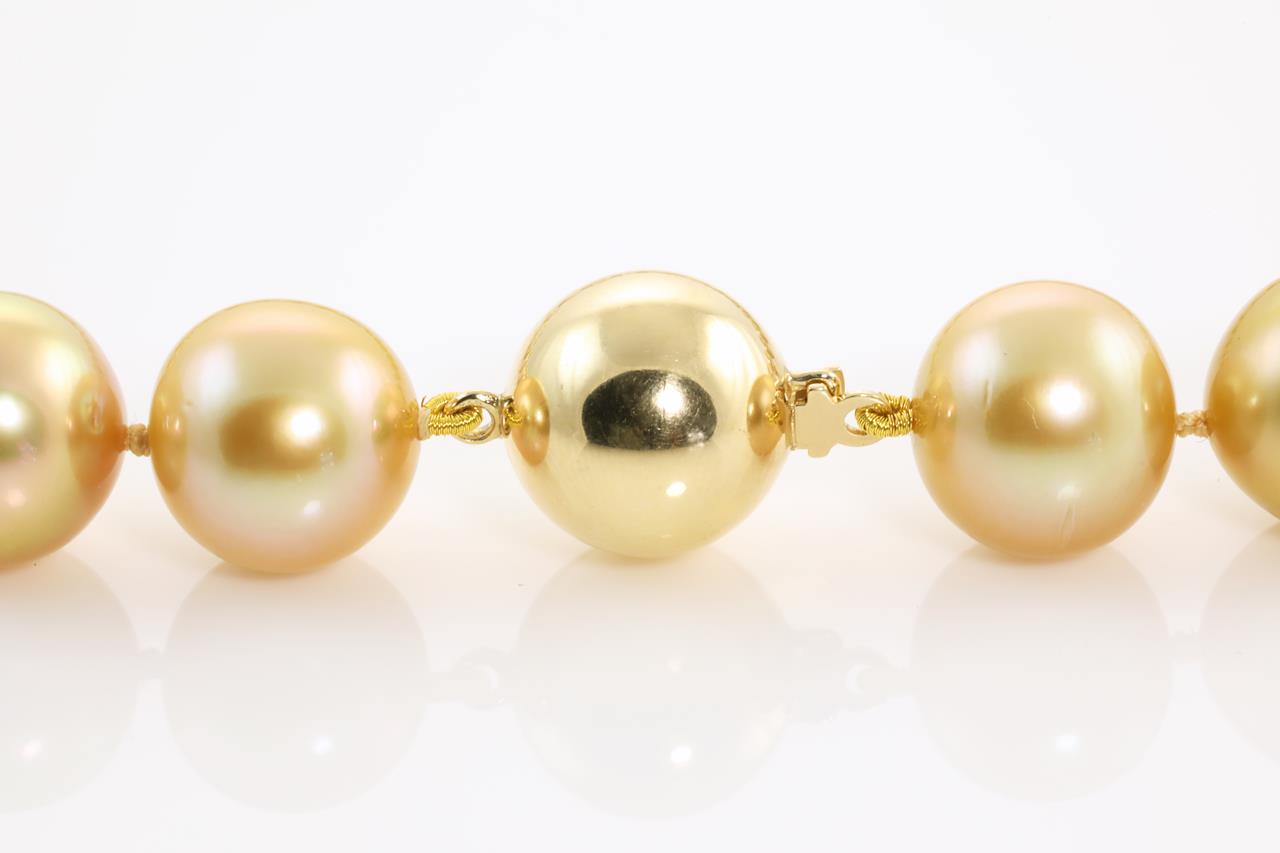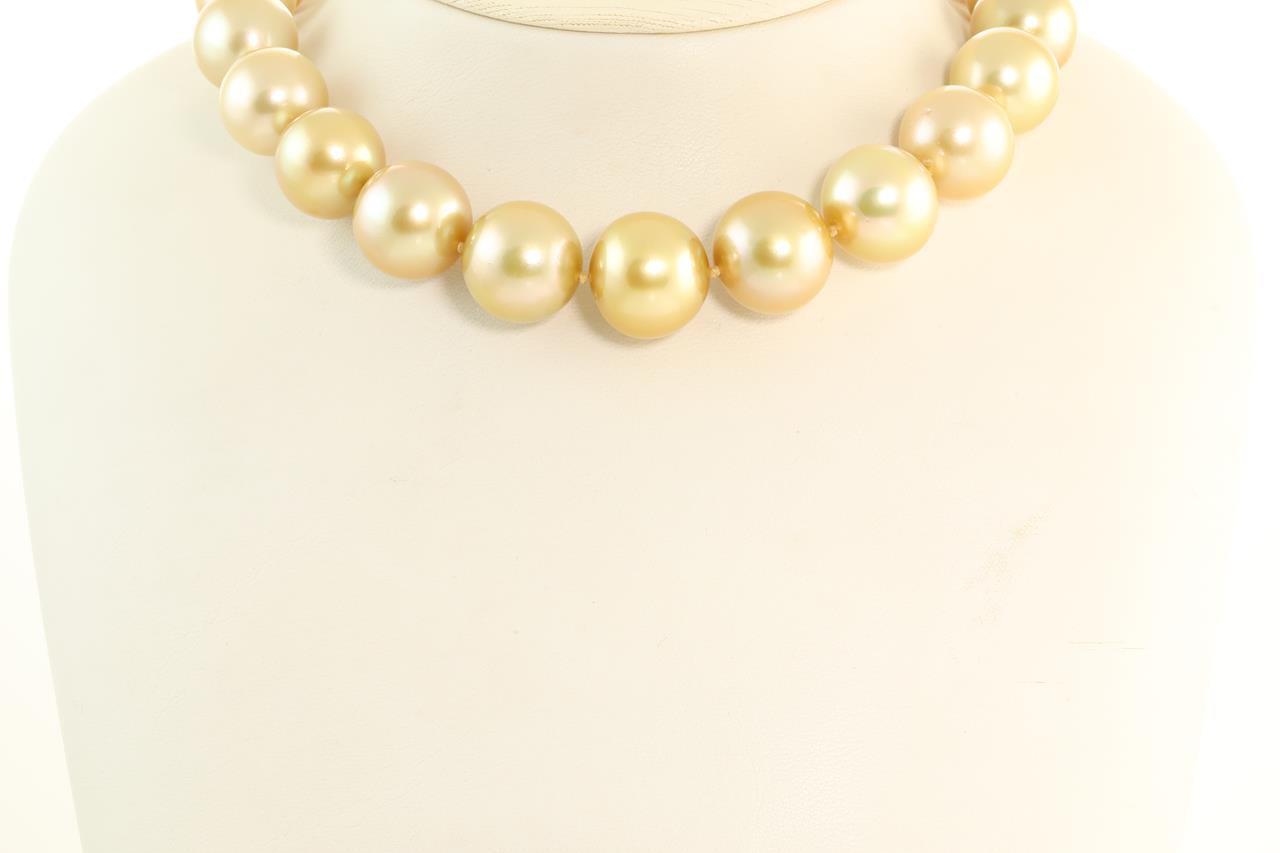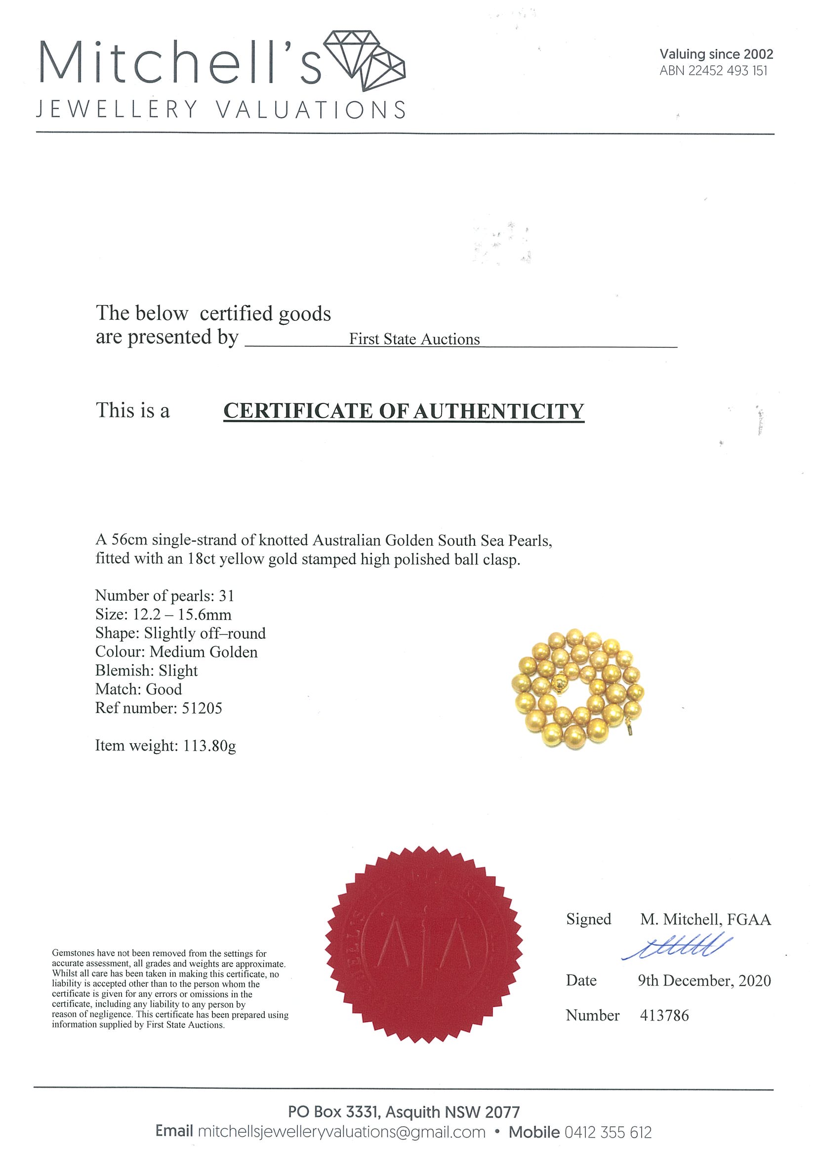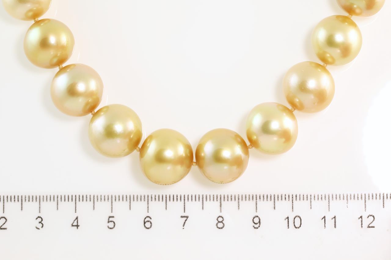 Pearl necklace with golden South Sea Pearl of 12.2mm-15.6mm. 18ct yellow gold clasp. Length: 56cm. Weight: 113.8g. With Certificate #413786. (Pre-owned)