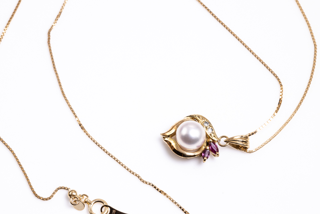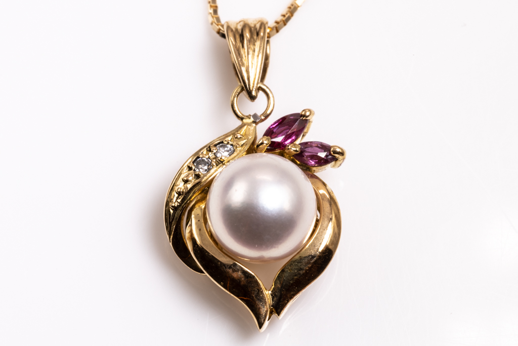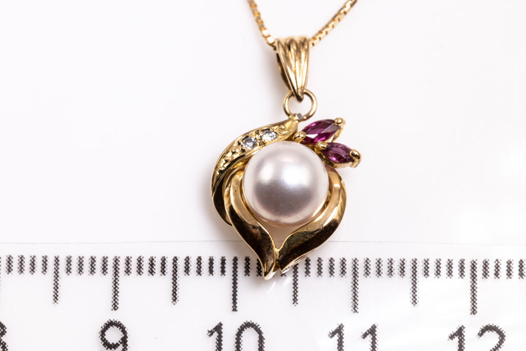 Pearl, Ruby and Diamond pendant with round pink Akoya Pearl of 7.0mm, marquise cut Rubies totalling 0.06cts and Diamonds totalling 0.10cts. 18ct yellow gold with 18ct yellow gold adjustable 44cm chain. Weight: 3.9g. (Pre-owned)