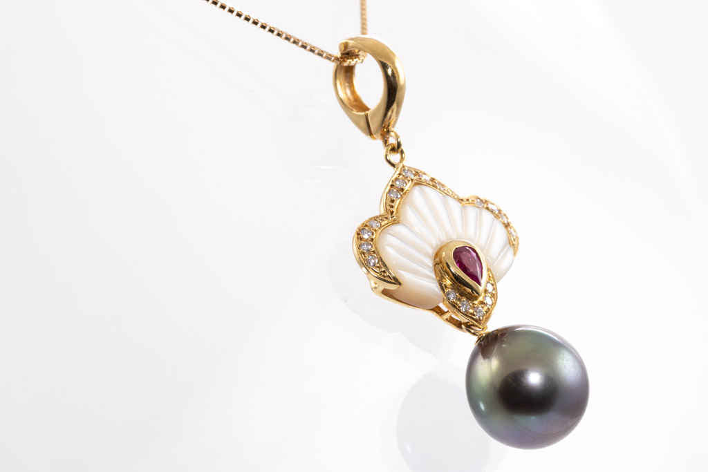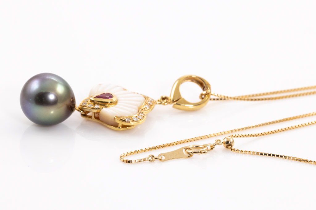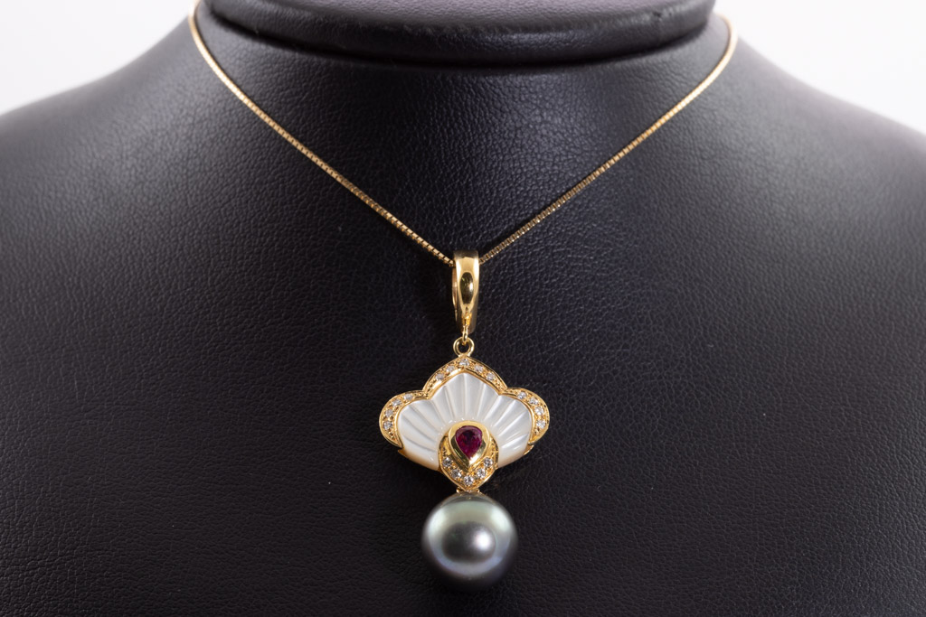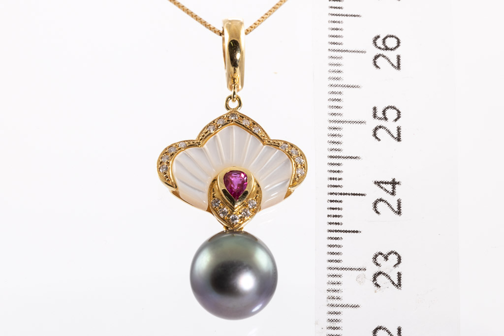 Pearl, Ruby and Diamond pendant/enhancer with Tahitian Pearl of 11.2mm, Ruby of 0.10cts, Diamonds totalling 0.12cts and Mother of Pearl. 18ct yellow gold with 44cm 18ct yellow gold adjustable chain. Weight: 8.4g. (Pre-owned)