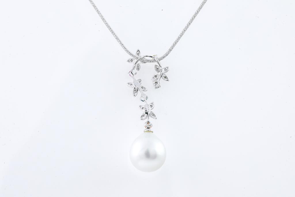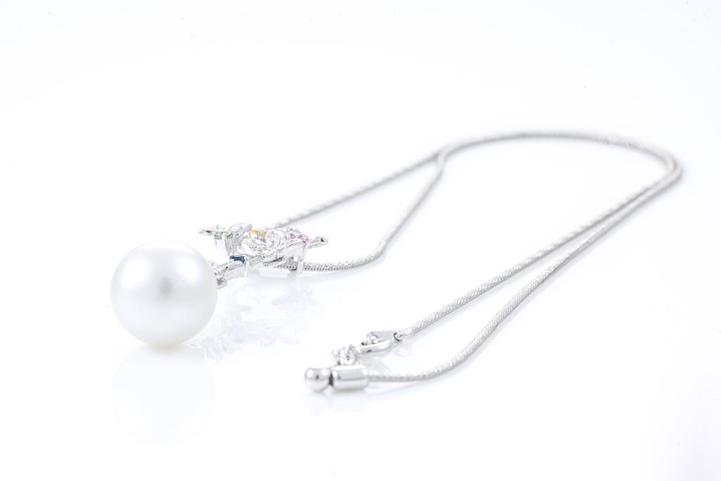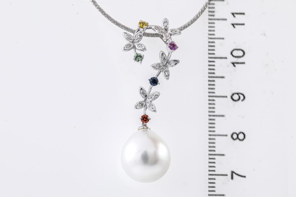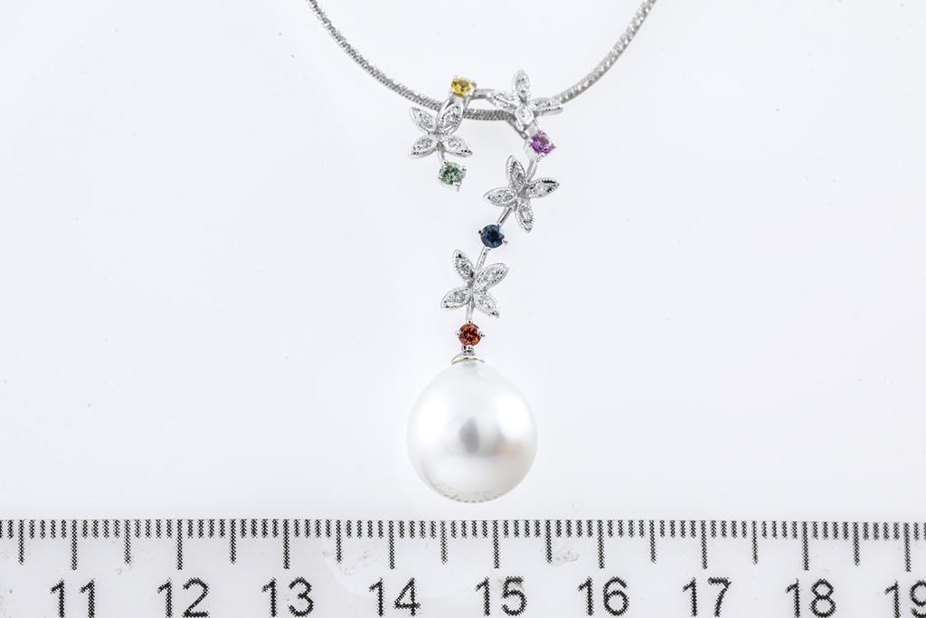 Pearl and Mixed Gemstone pendant with a drop shape South Sea Pearl of 12.4mm, multi-colour Sapphires totalling 0.28cts and round Diamonds totalling 0.12cts. 18ct white gold with 42cm adjustable 18ct gold chain. Weight: 10.9g. (Pre-owned)