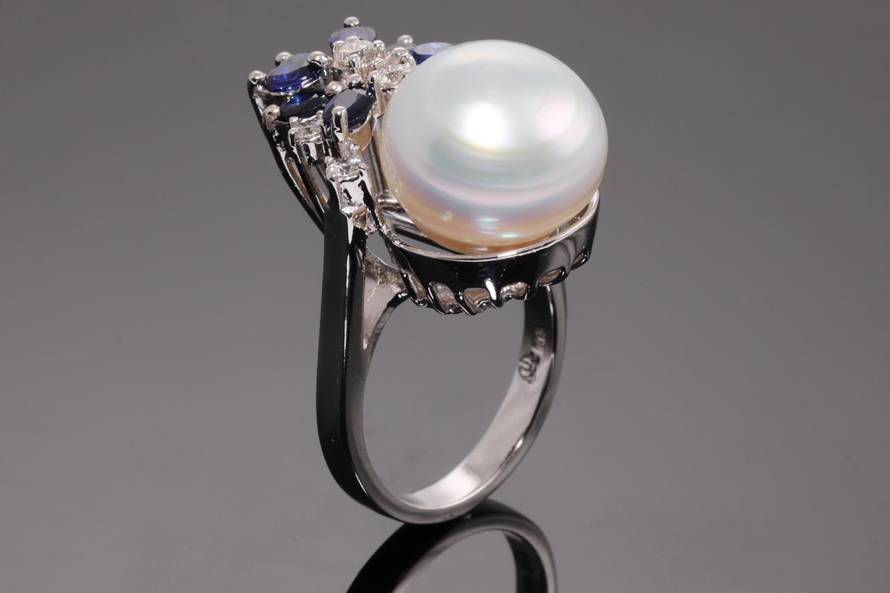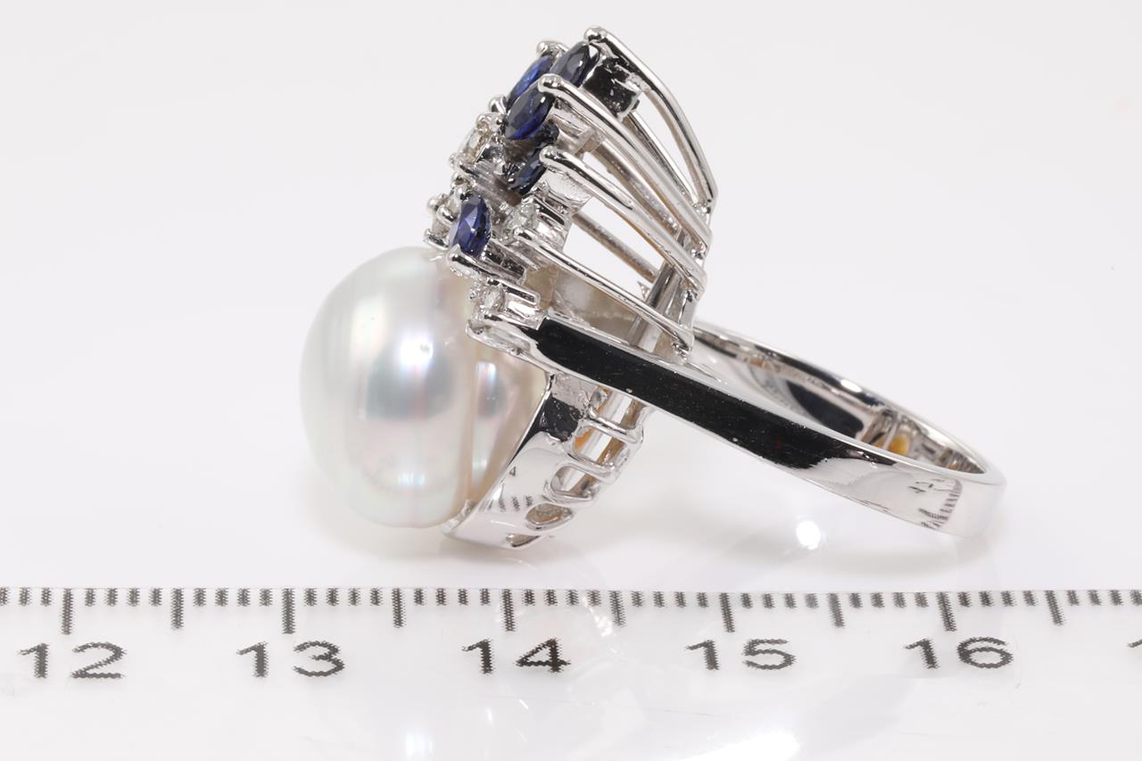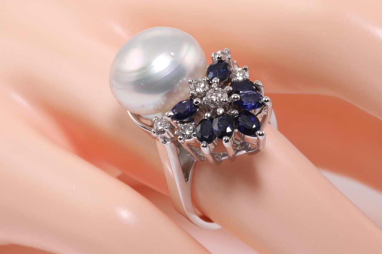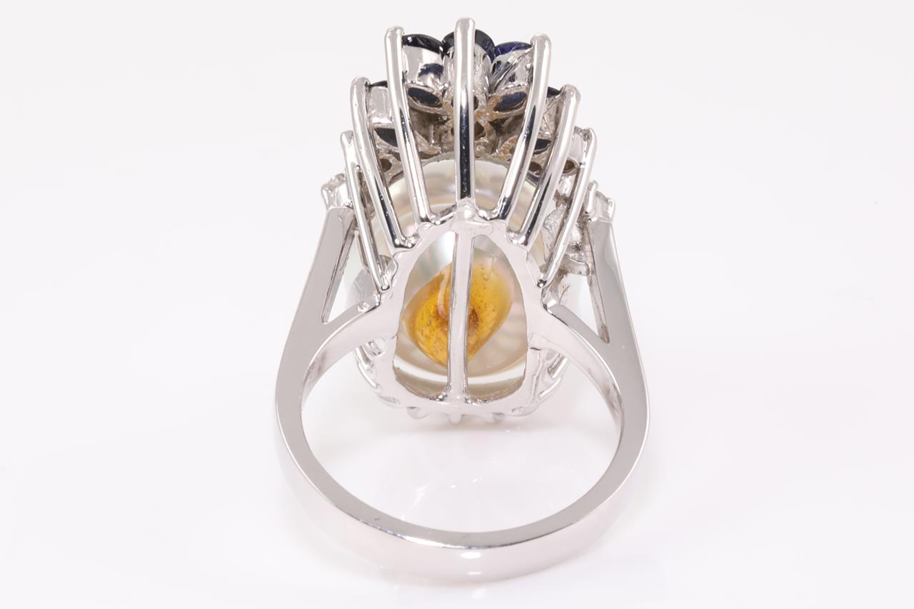 Pearl, Sapphire and Diamond ring with semi-round ringed South Sea Pearl of 13.1mm ,oval blue Sapphires totalling approximately 1.13cts and round Diamonds totalling approximately 0.37cts (Estimated grading: H SI-P1), 14ct white gold. Ring size L. Weight 10.2g. (Pre-owned)