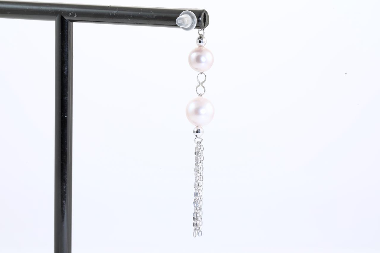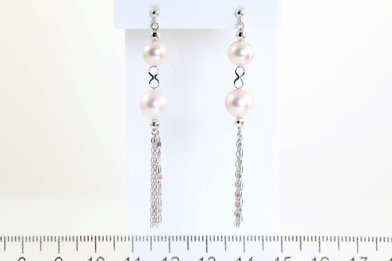 Pearl tassel earrings with Akoya pearls of 6.8mm-7.7mm. 18ct white gold with silicon backs. Weight: 3.2g. (Pre-owned)