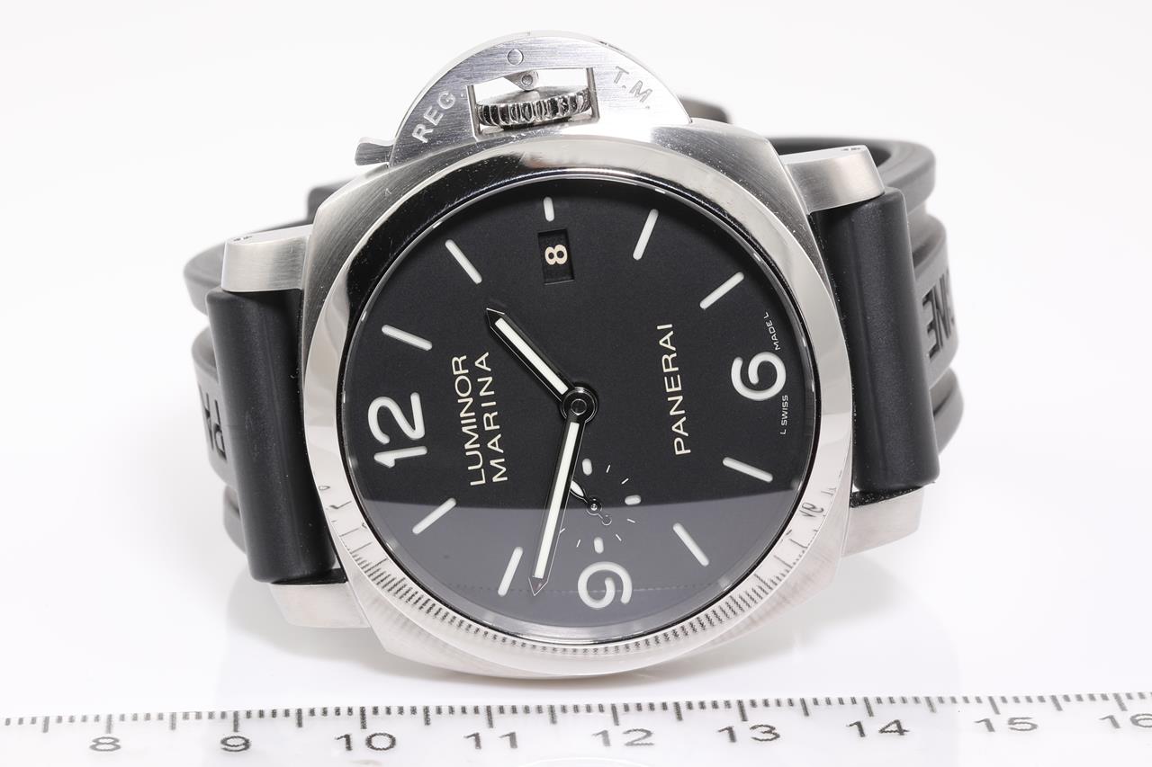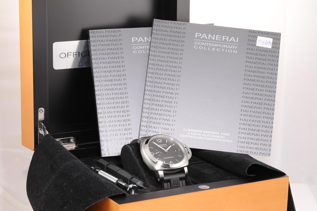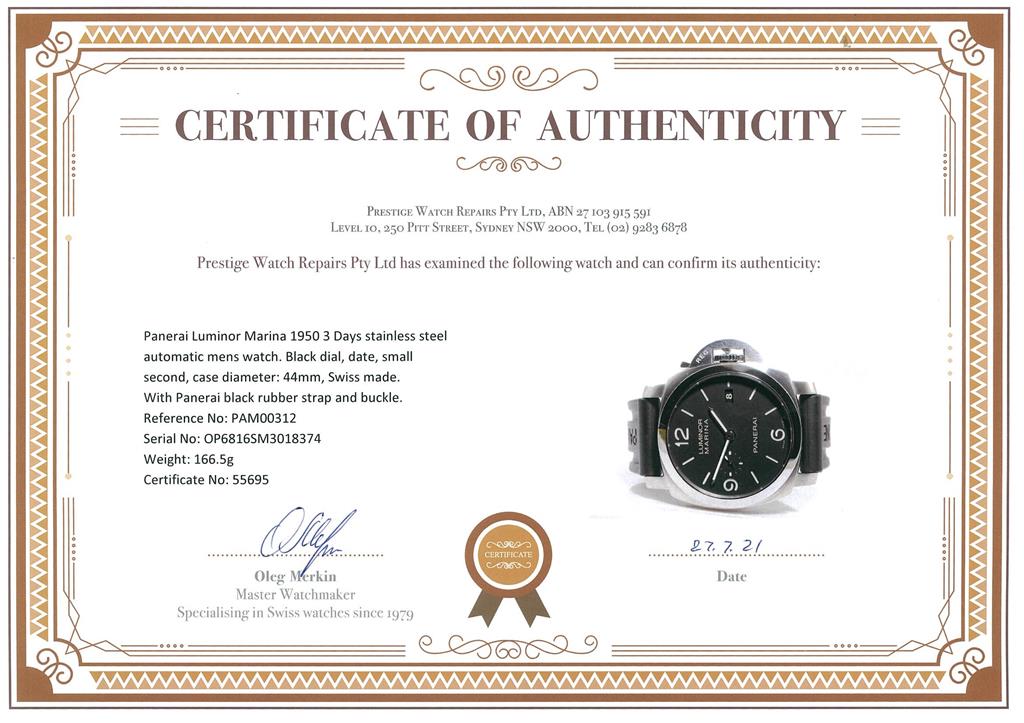 Panerai Luminor Marina 1950 3 Days stainless steel automatic mens watch. Black dial, date, small second, case diameter: 44mm, length: 22cm, Swiss made. Ref# PAM00312. With Panerai black rubber strap and buckle. With Certificate of Authenticity, Panerai International warranty booklet dated 05/05/2012 and Panerai box. 3 month FSA Warranty. (Pre-owned).