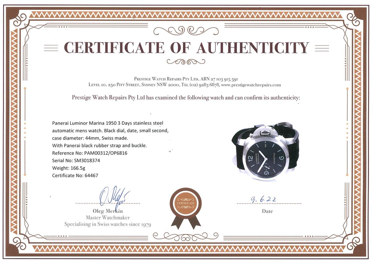 Panerai Luminor Marina 1950 3 Days stainless steel automatic mens watch. Black dial, date, small second, case diameter: 44mm, length: 22cm, Swiss made. Ref# PAM00312/OP6816. With Panerai black rubber strap and buckle. With Certificate of Authenticity, Panerai International warranty booklet dated 05/05/2012 and Panerai box. 3 month FSA Warranty. (Pre-owned).