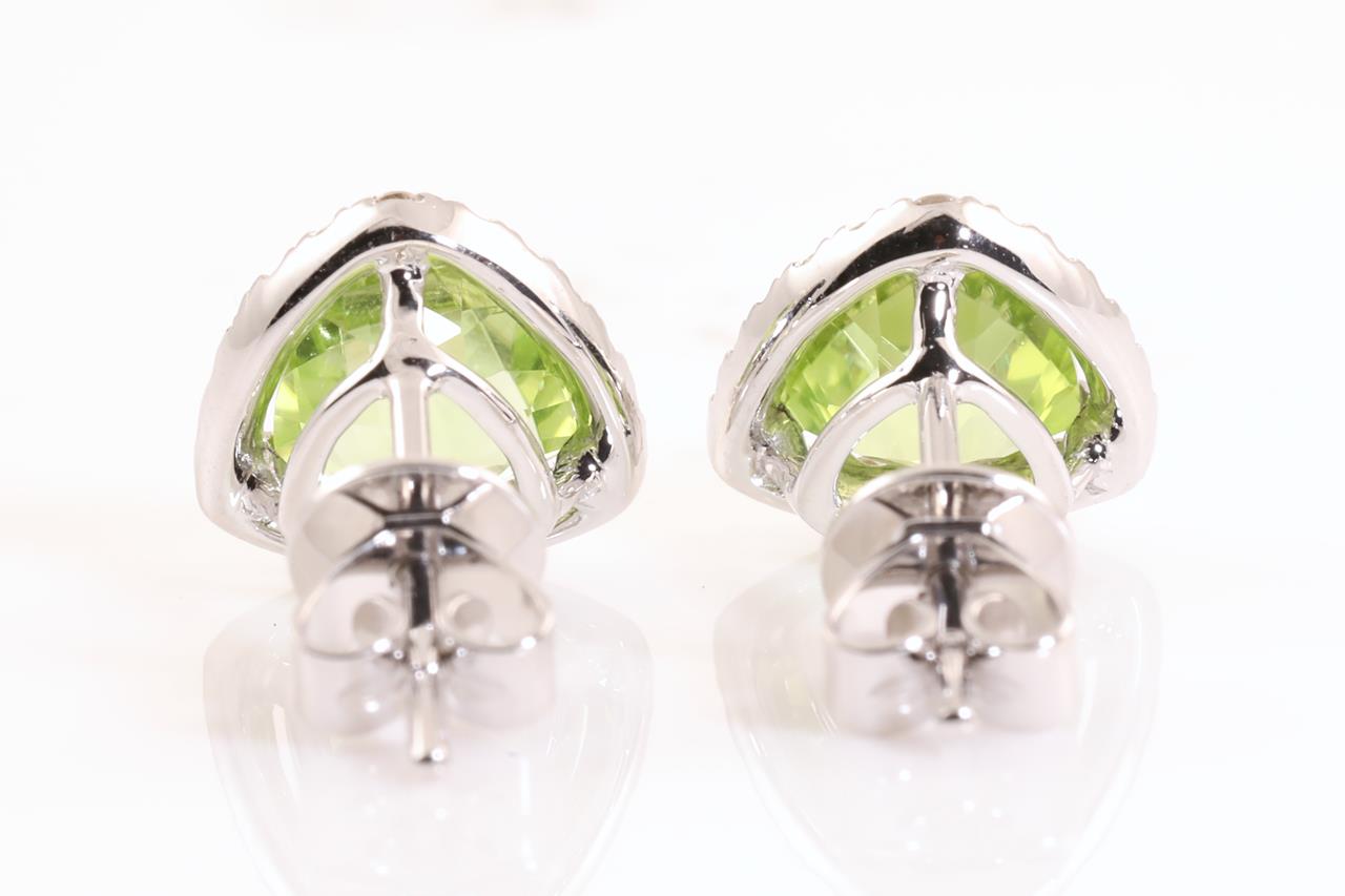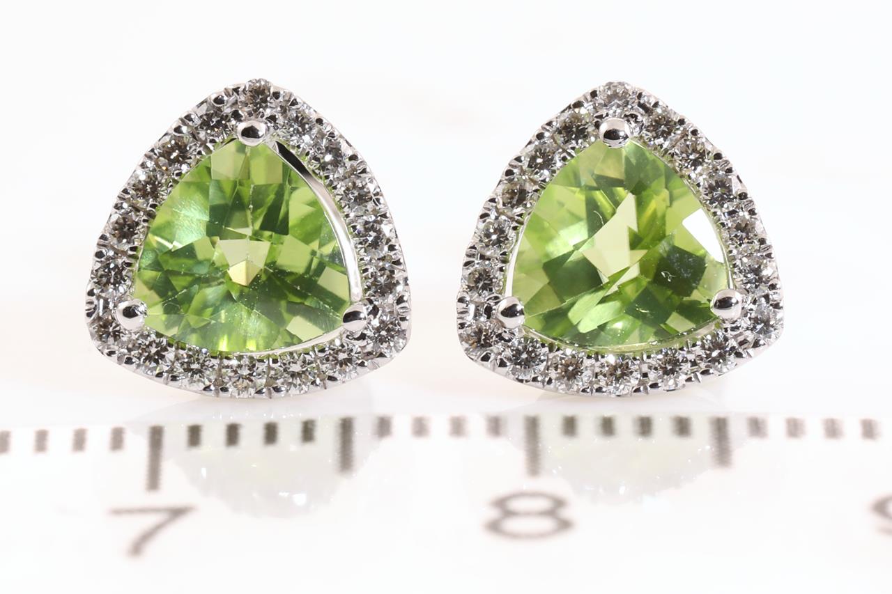 Peridot and Diamond earrings with trilliant shape, checkerboard cut Peridots totalling 1.62cts and Diamonds totalling 0.25cts. 14ct white gold. Weight: 1.7g. (New)