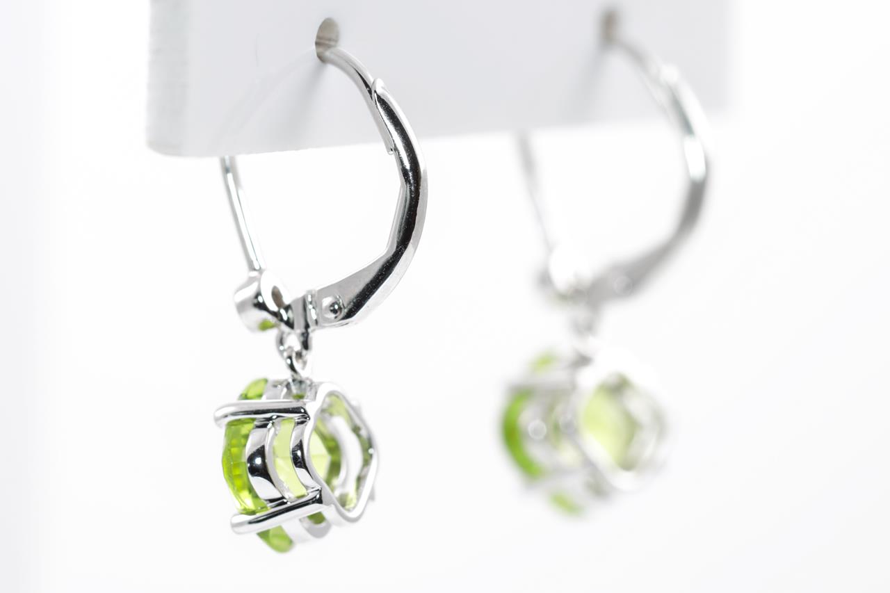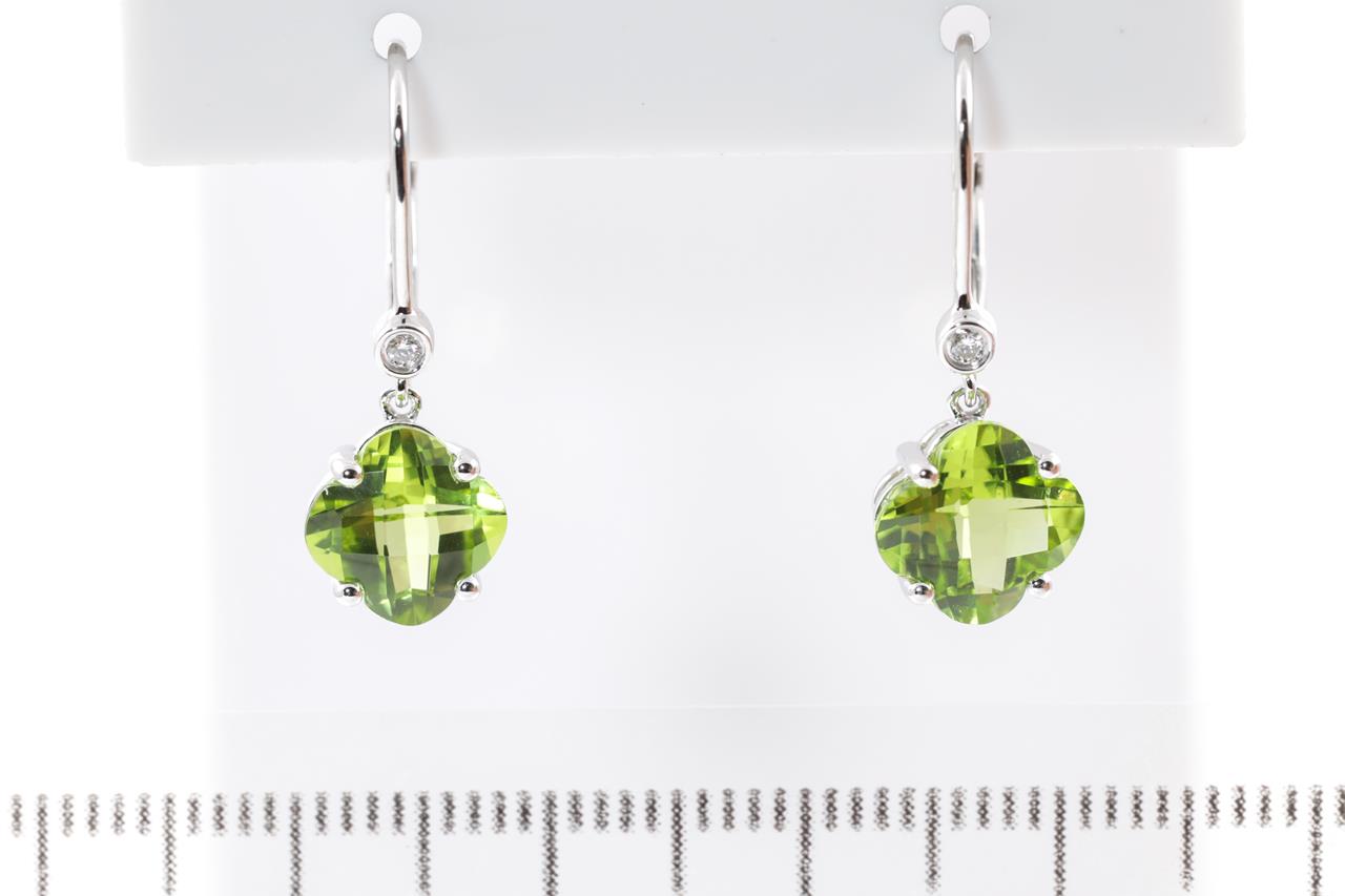 Peridot and Diamond leverback earrings with fancy cut Peridot totalling 3.50cts and Diamonds totalling 0.03cts. 14ct white gold. Weight: 2.4g. (New)