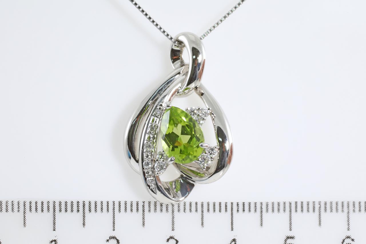 Peridot and Diamond pendant with pear shape Peridot of 2.40ct and Diamonds totalling 0.22cts. Platinum with 45cm platinum adjustable chain. Weight: 11.1 grams (New)