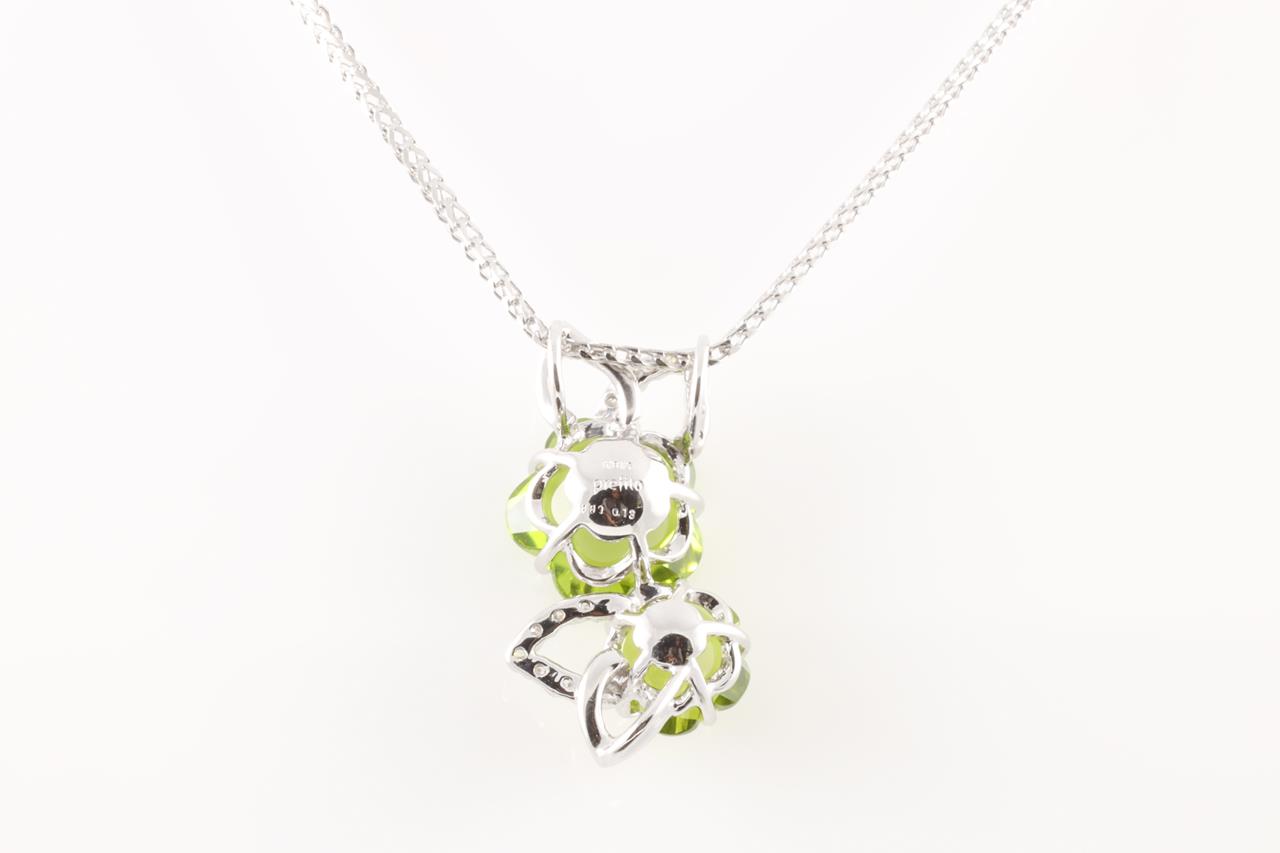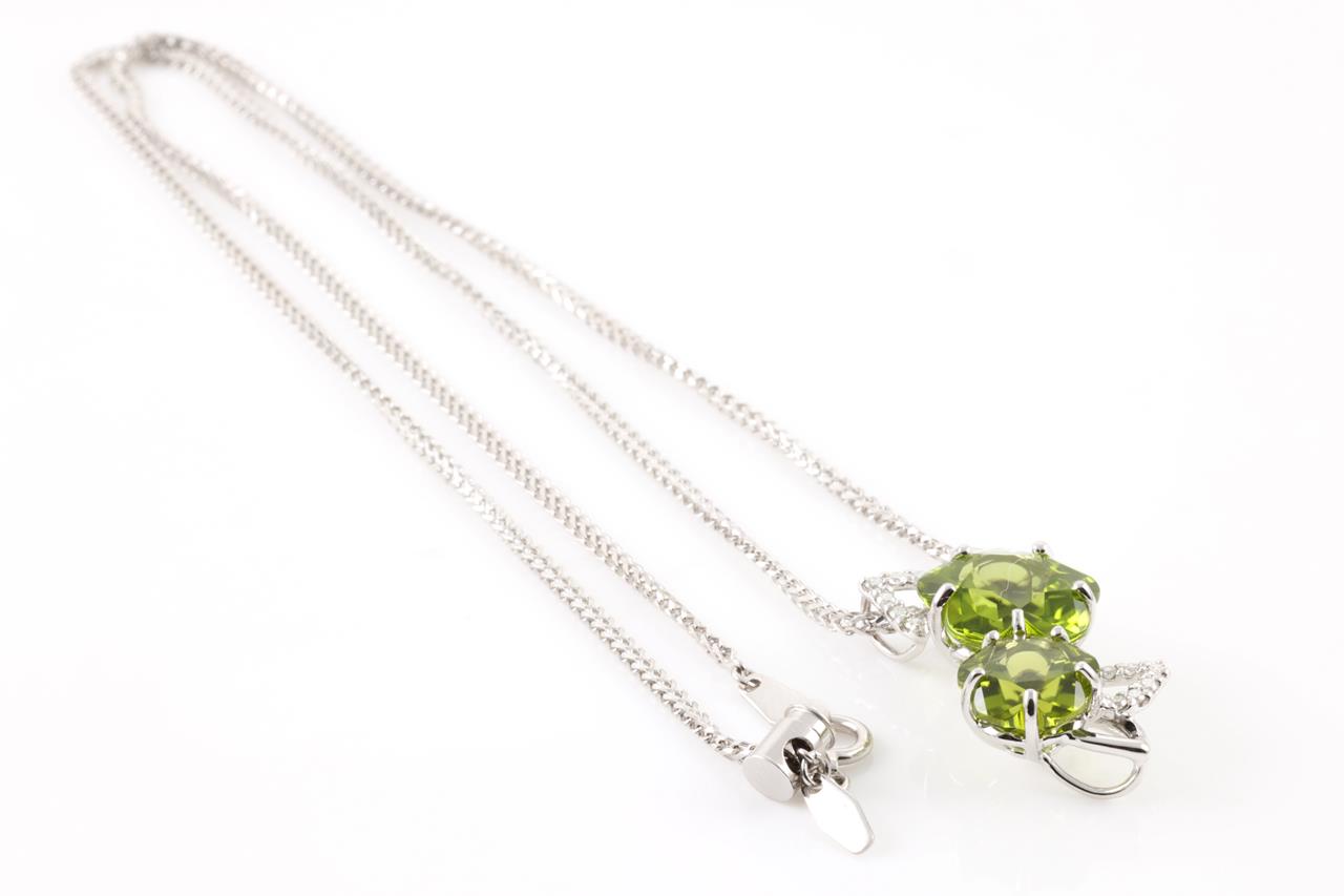 Peridot and Diamond pendant with 2 fancy shape peridots totalling 8.80cts and Diamonds totalling 0.13cts. 18ct white gold with 50cm adjustable chain. Weight: 10.9g (Pre-owned).