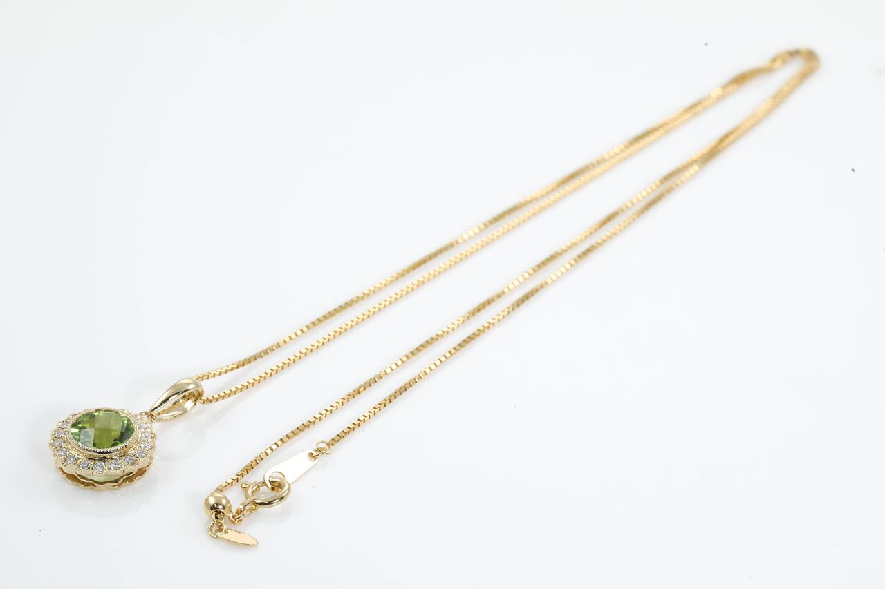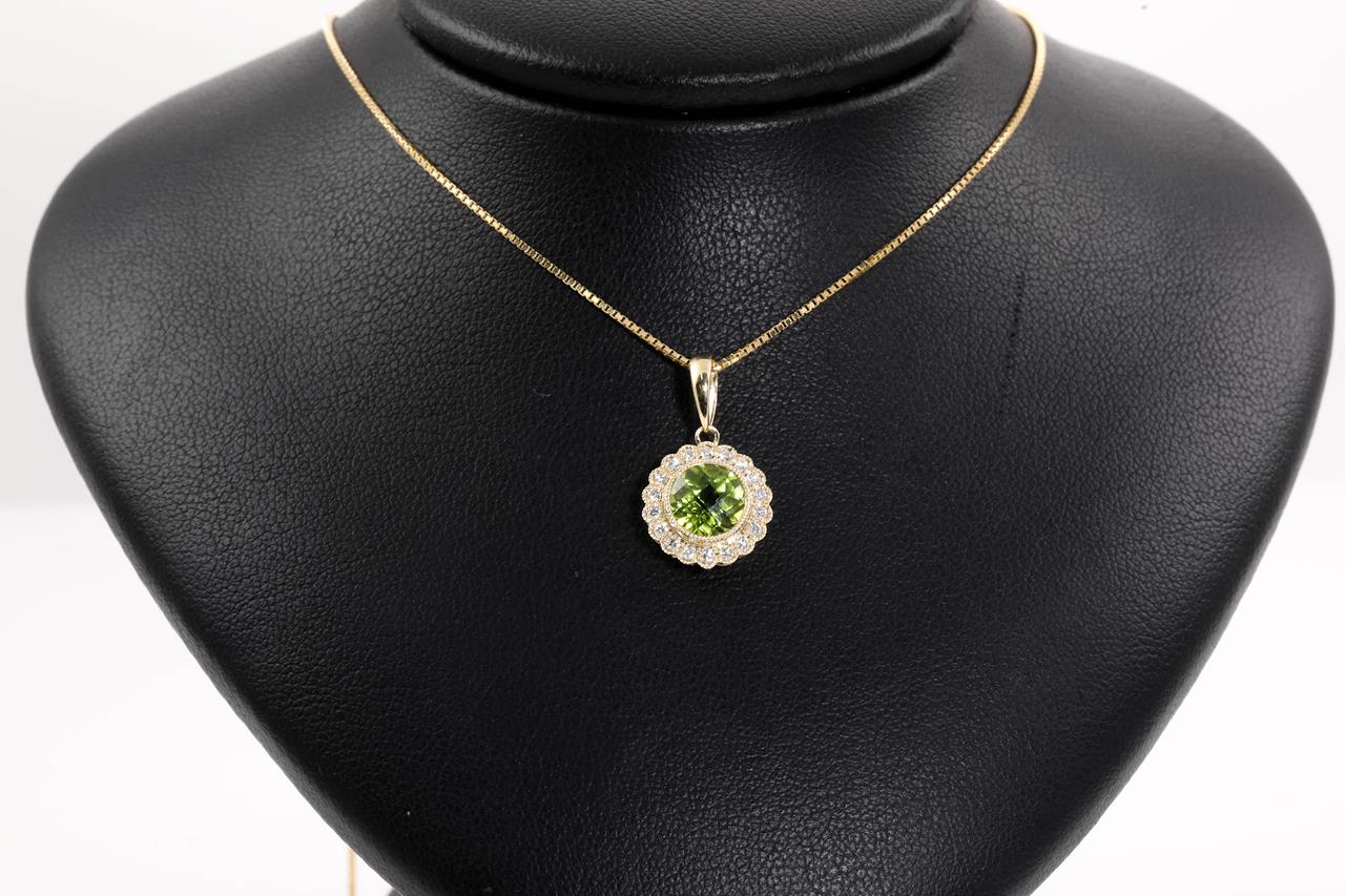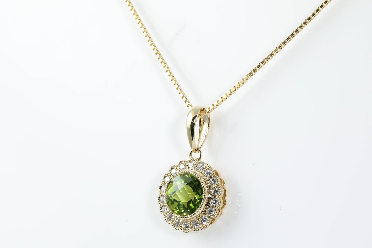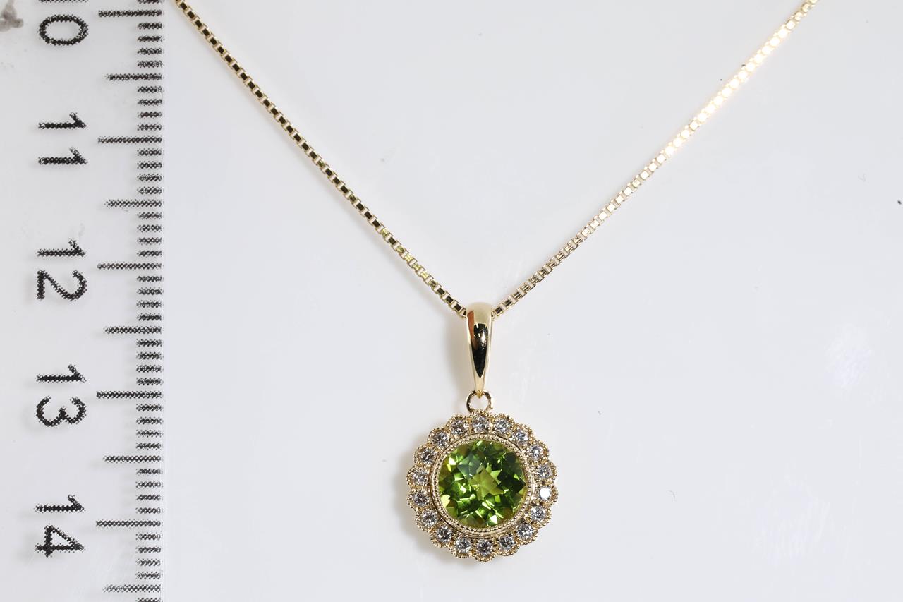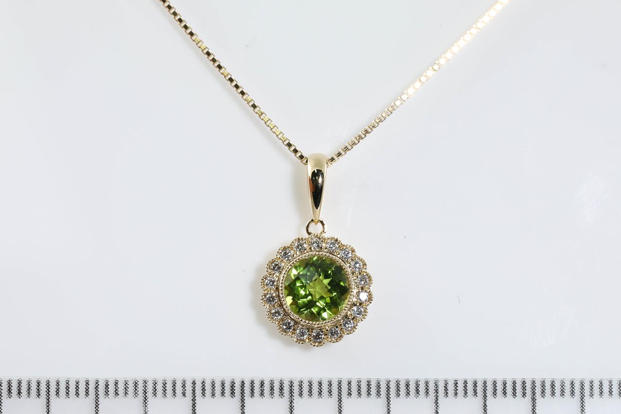 Peridot and Diamond pendant with a round Peridot of 1.50ct and Diamonds totalling 0.16cts. 14ct yellow gold with 18ct gold 44cm adjustable chain. Weight: 3.6g. (New)