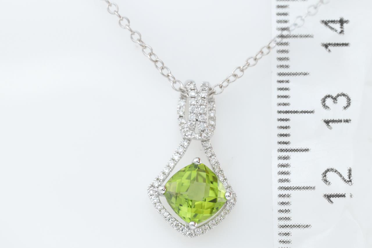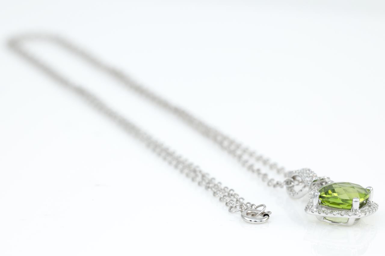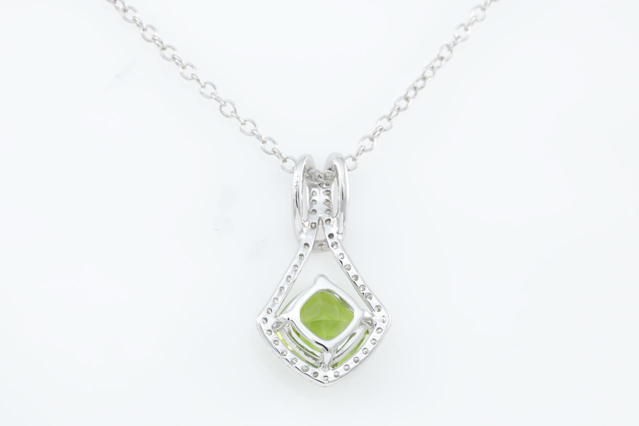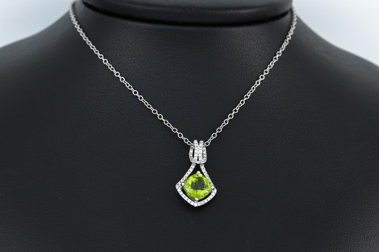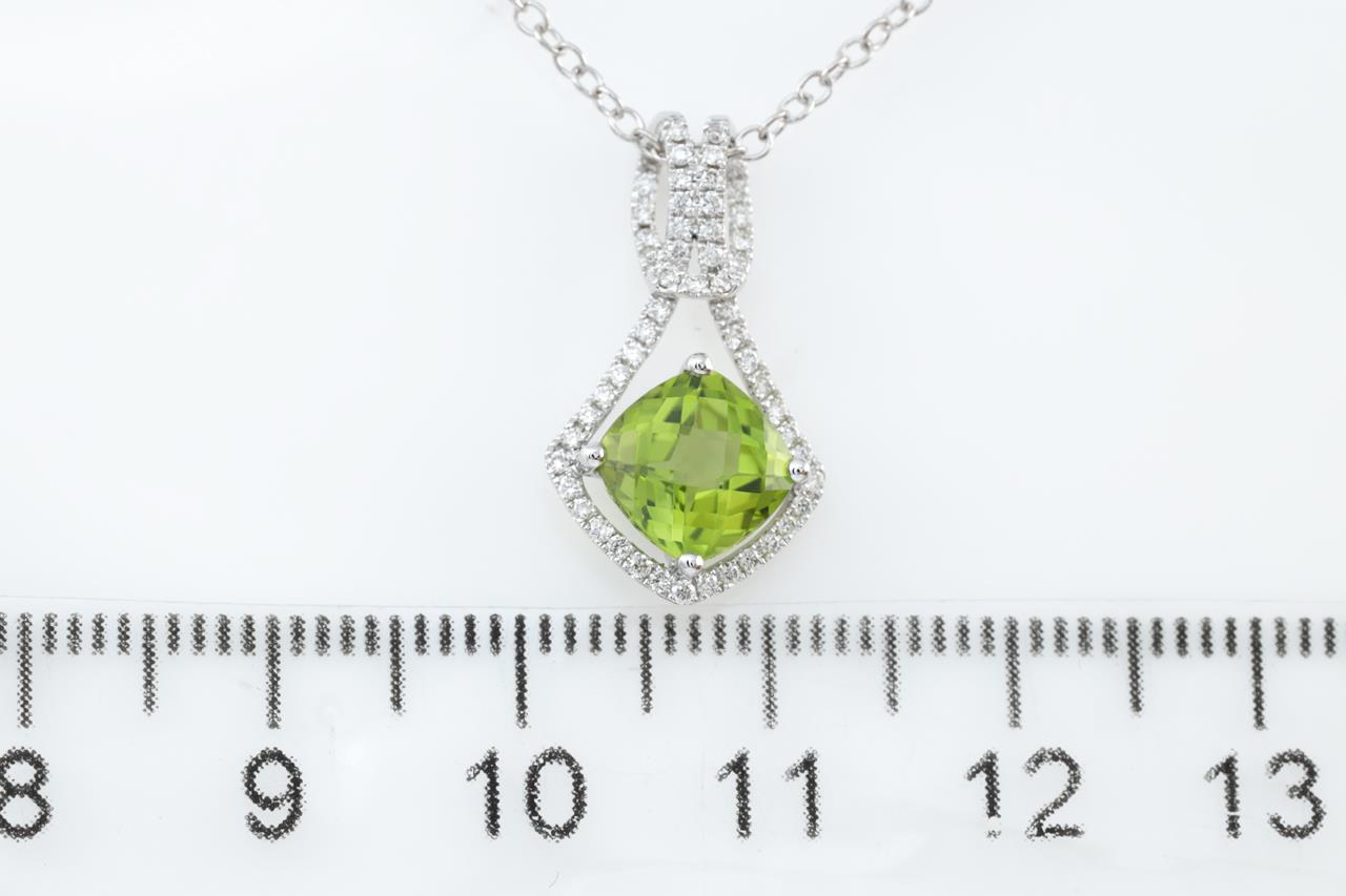 Peridot and Diamond pendant with a cushion cut Peridot of 1.55ct and Diamonds totalling 0.20cts. 14ct white gold with 14ct gold 44cm 14ct chain. Weight: 2.5g. (New)