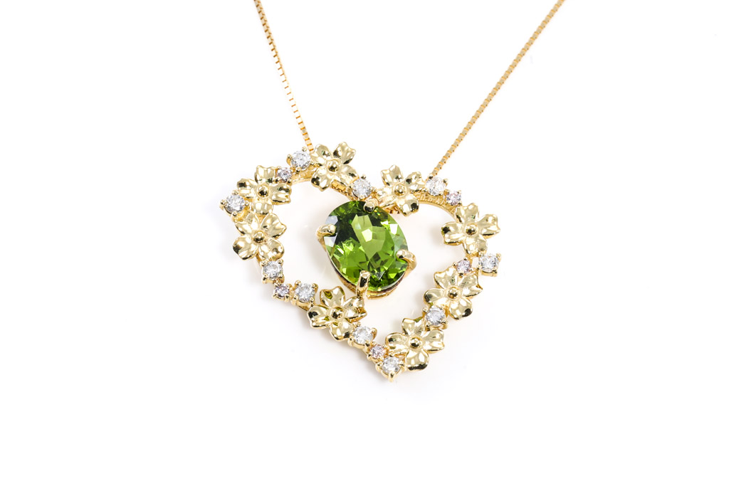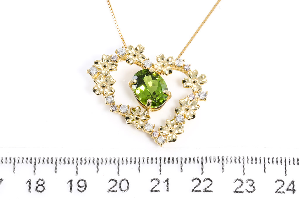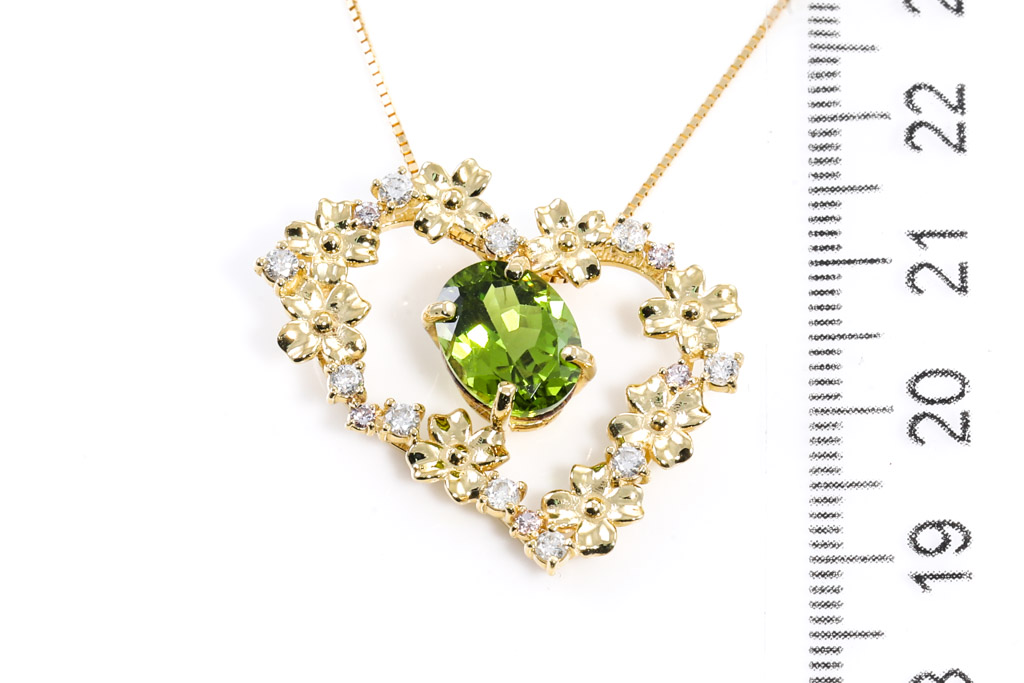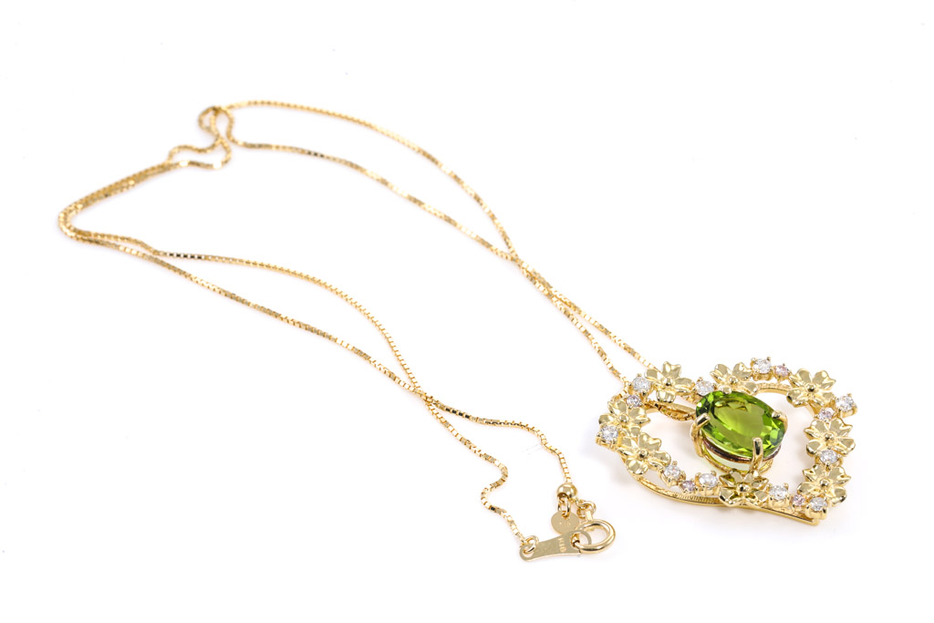 Peridot and Diamond pendant with Peridot of 3.19cts and Diamonds totalling 0.43cts (Estimated grading: H P1-2). 18ct yellow gold with 44cm adjustable yellow gold chain. Weight: 7.9g. (Pre-owned)