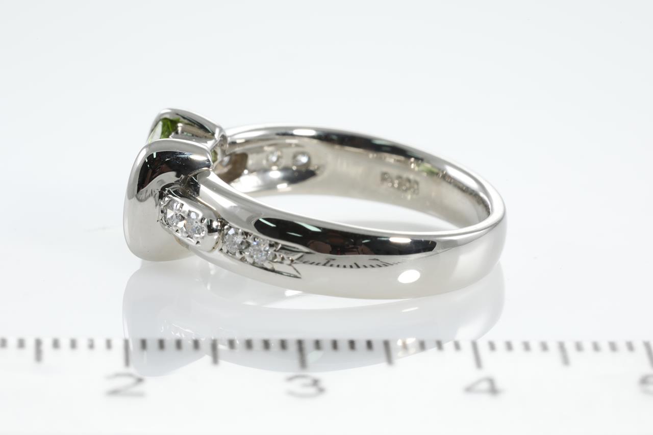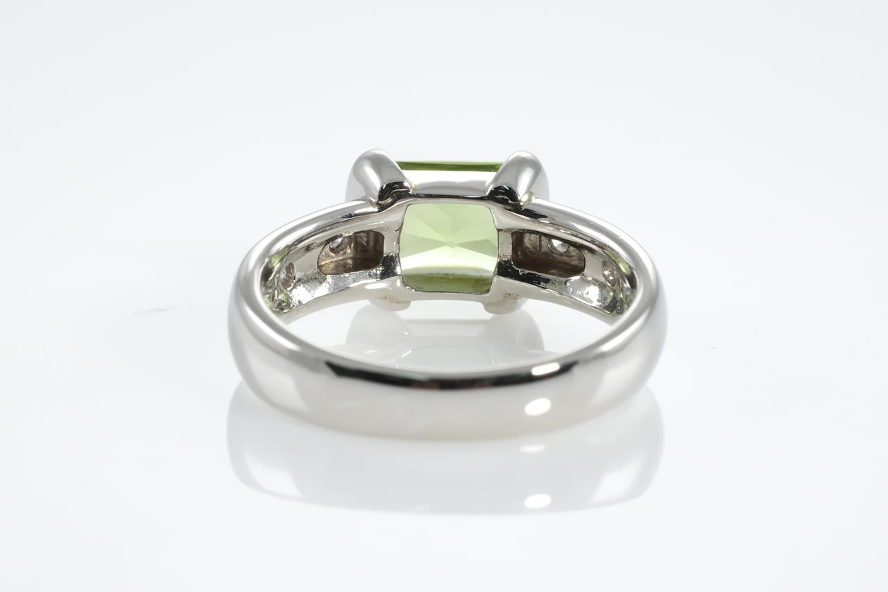 Peridot and Diamond ring with rectangular cabochon cut Peridot of approximately 1.70cts and Diamonds totalling 0.14cts. Platinum. Ring size M. Weight: 8.2g (Pre-owned)