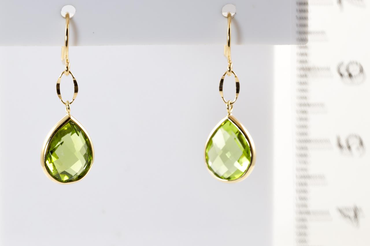 Peridot shepherds hook earrings with pear checkerboard cut Peridot of 9mm x 7mm. 18ct yellow gold. Weight: 1.3g (Pre-owned)