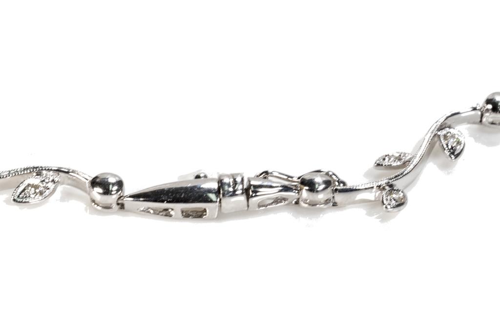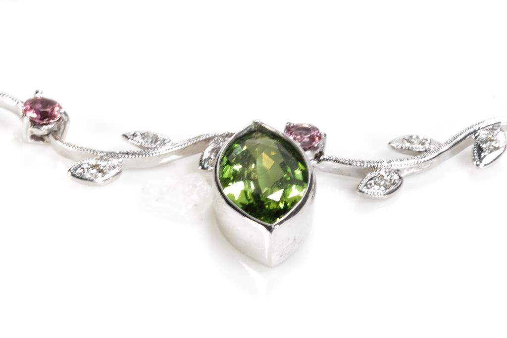 Peridot, Tourmaline and Diamond Necklace with marquise cut Peridot of 2.03ct, round Pink Tourmaline totalling 0.85cts and round Diamonds totalling 0.66cts (Estimated grading: H-J SI-P1). 18ct white gold. Length: 38cm. Weight: 15.5g. (Pre-owned)