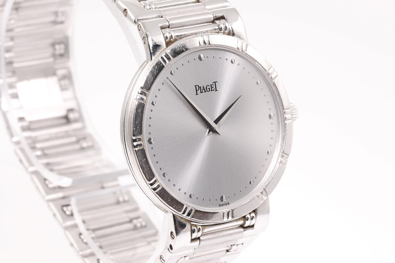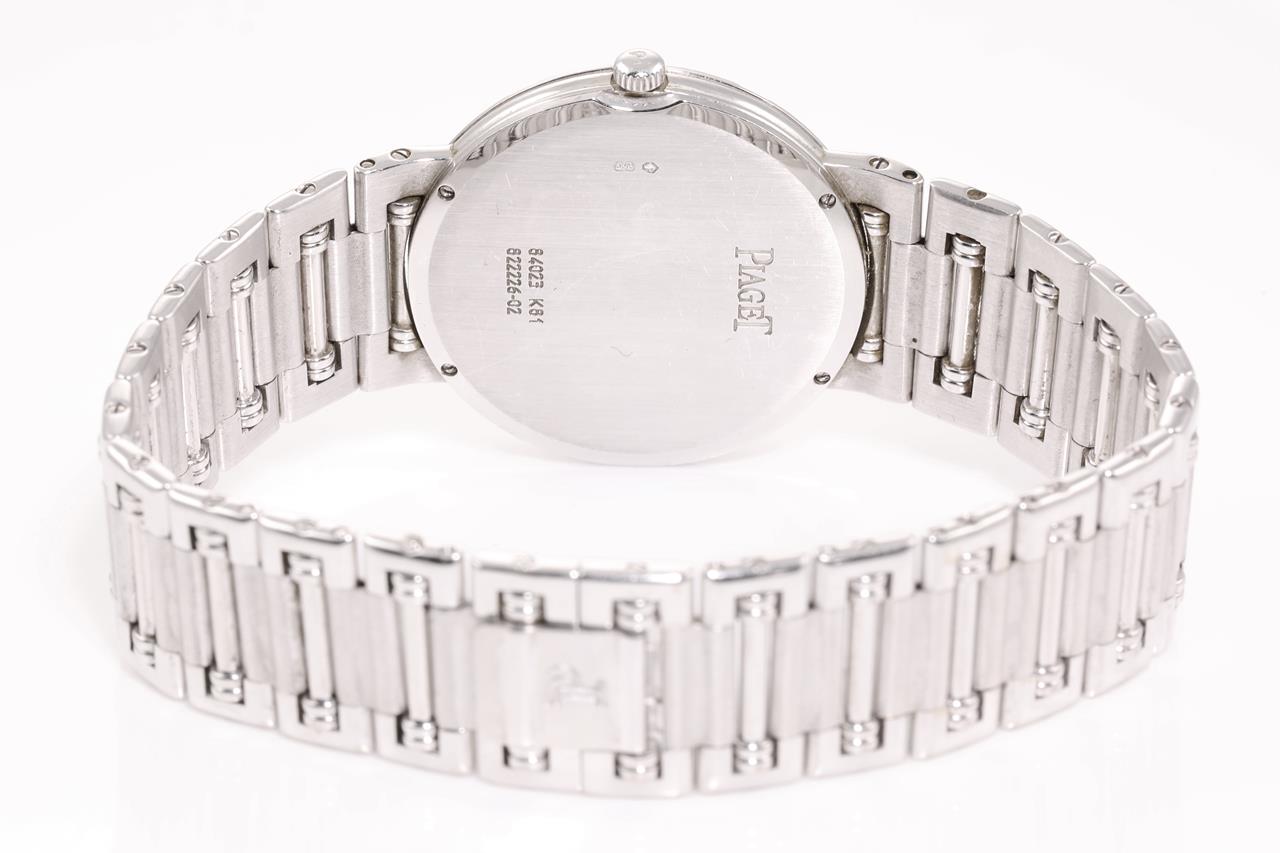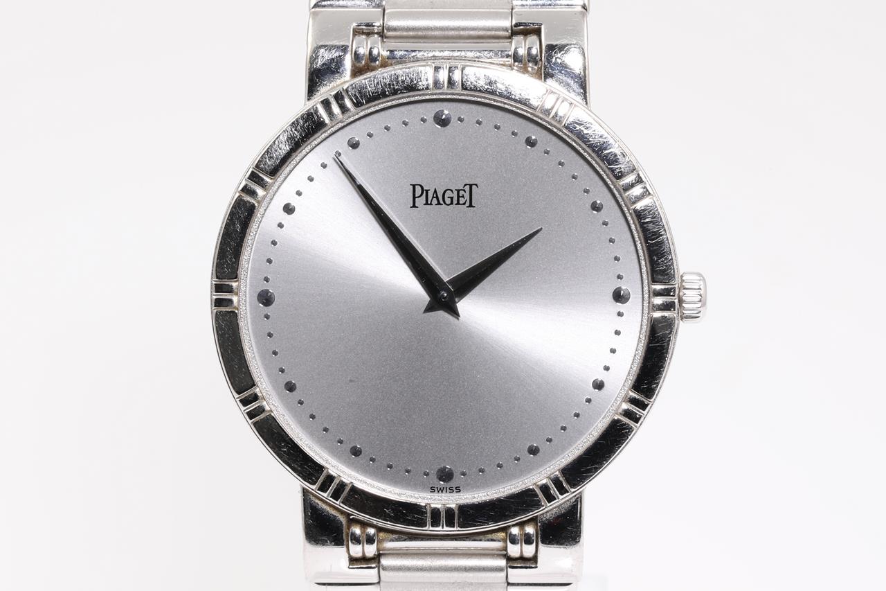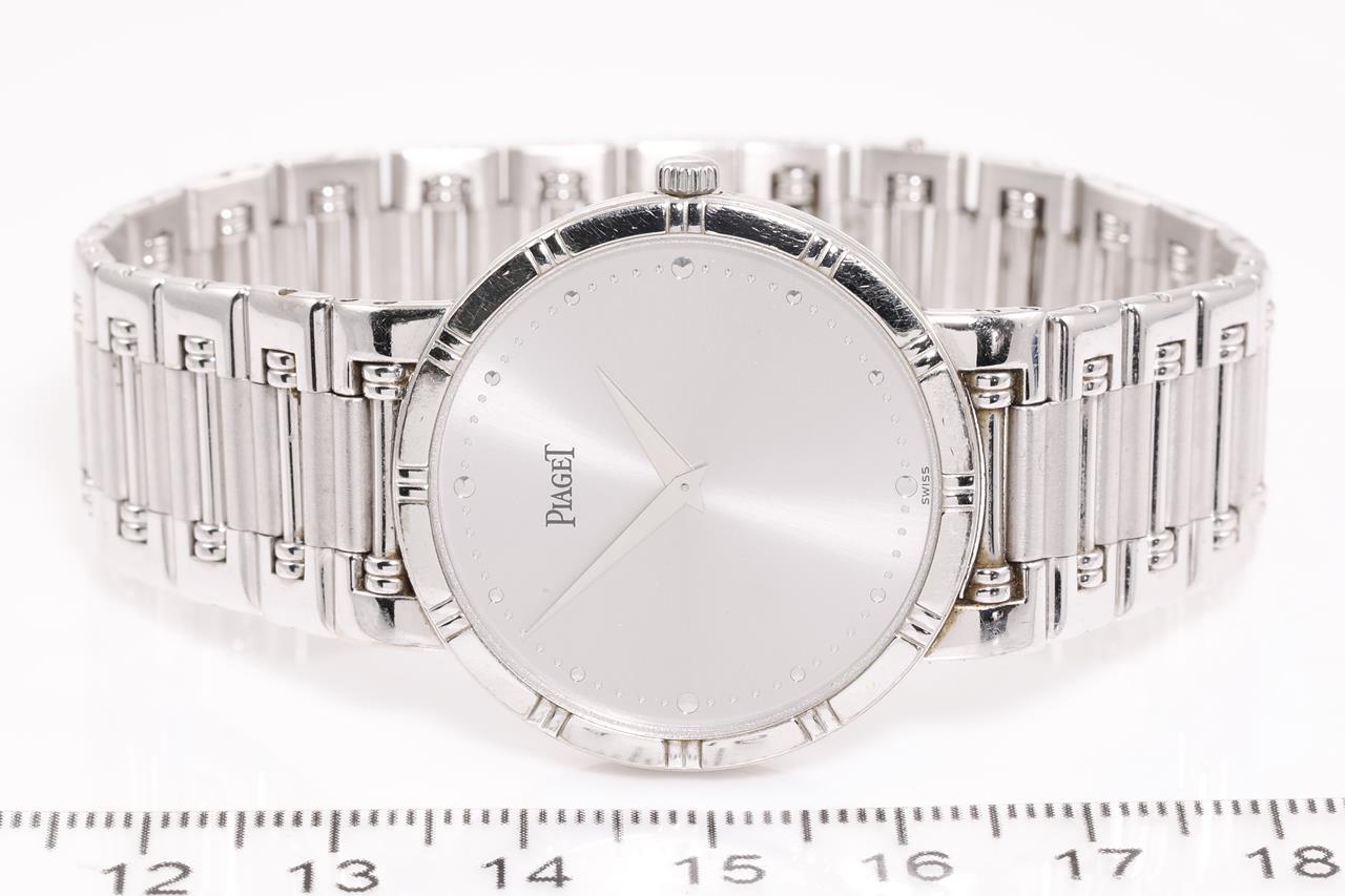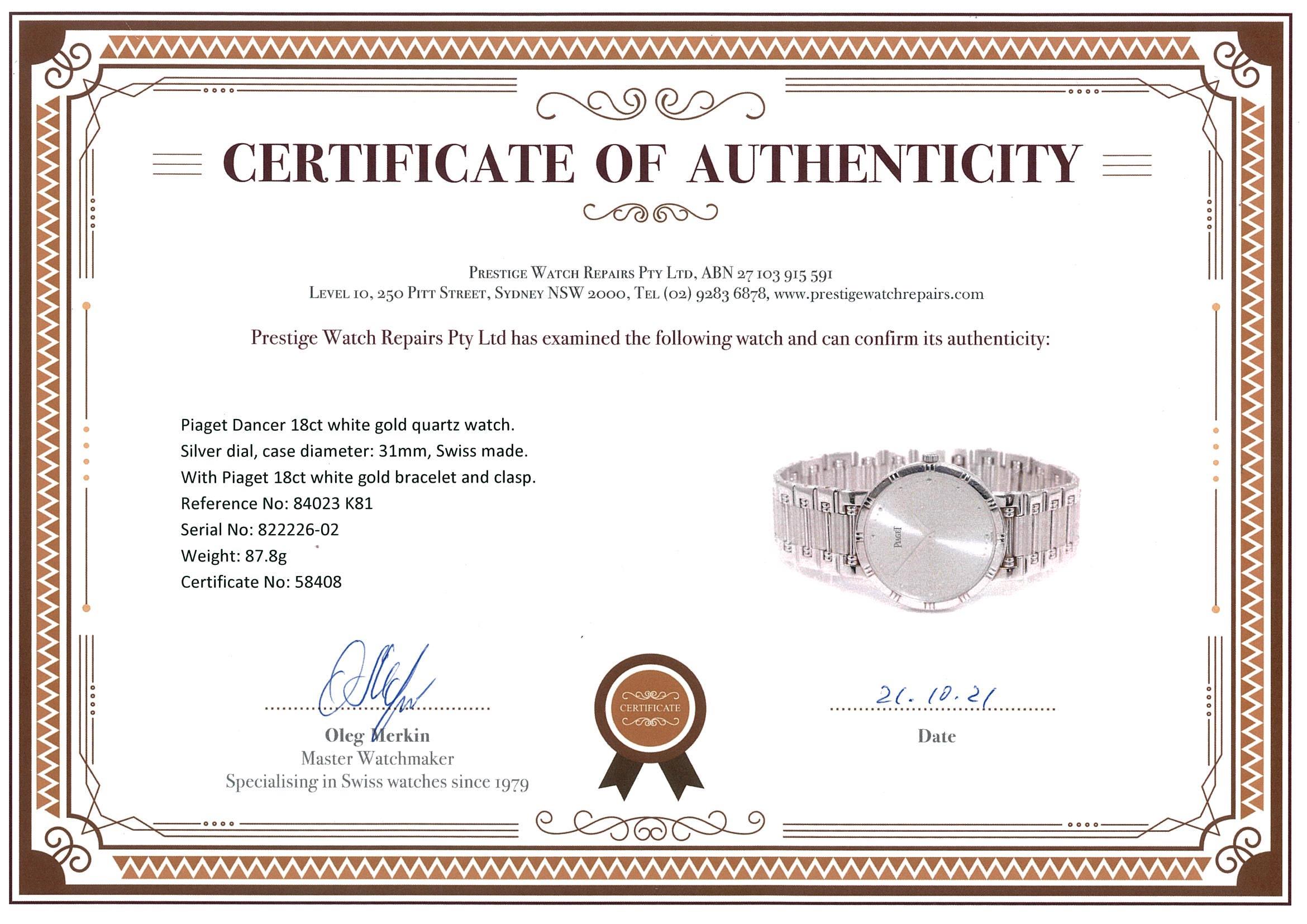 Piaget Dancer 18ct white gold quartz watch. Silver dial, case diameter: 31mm, wrist size: 17cm, Swiss made. Ref# 84023 K81. With Piaget 18ct white gold bracelet and clasp. With certificate of authenticity. 3 month FSA warranty. (Pre-owned)