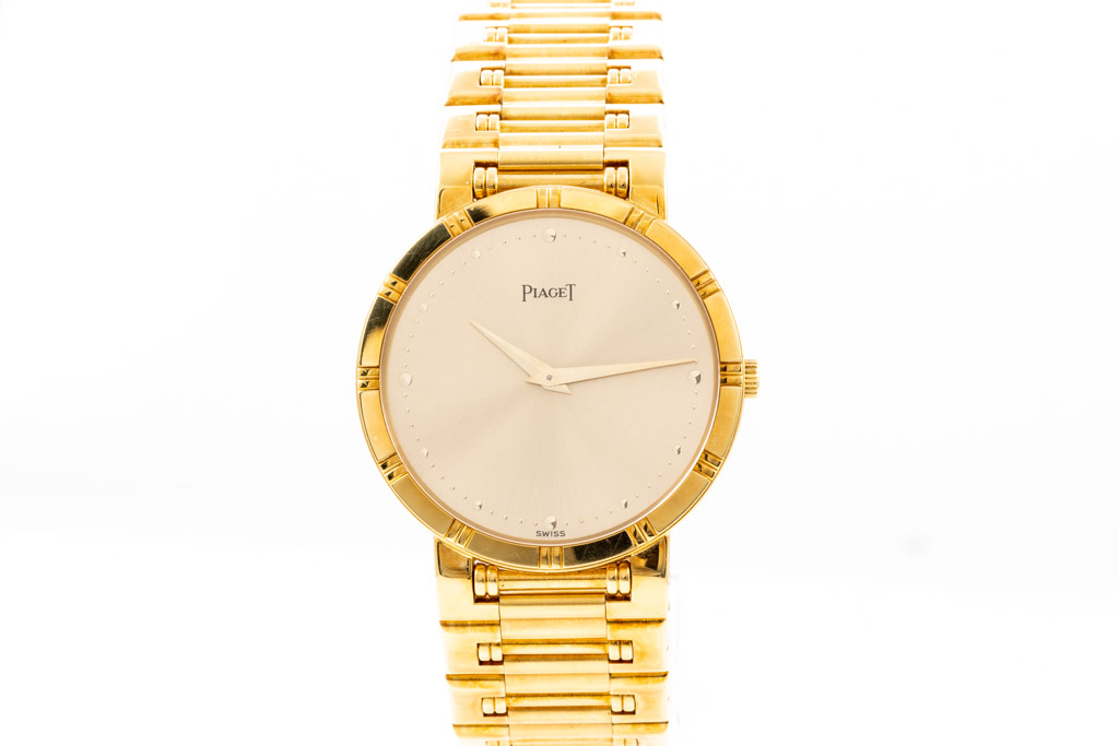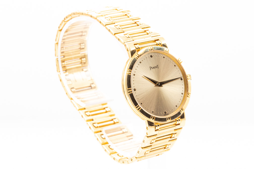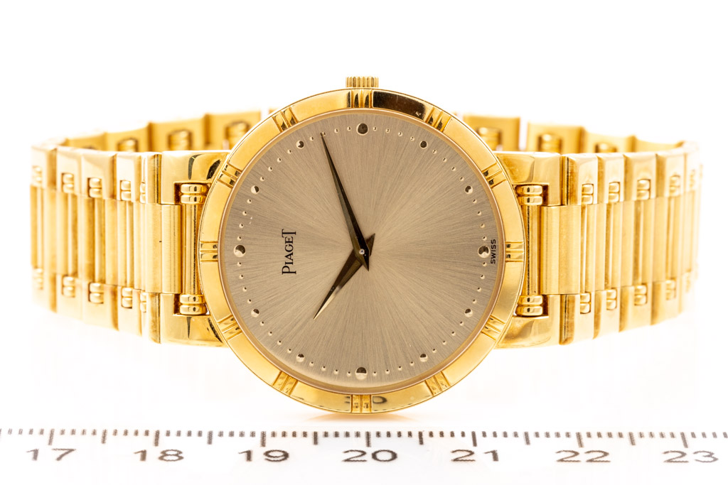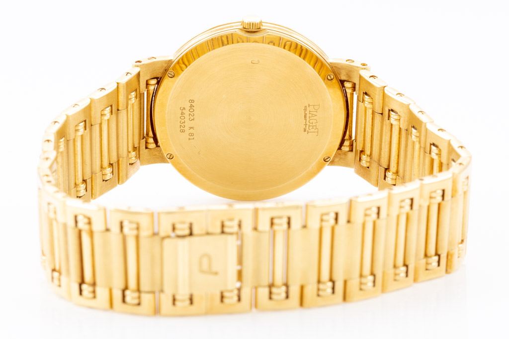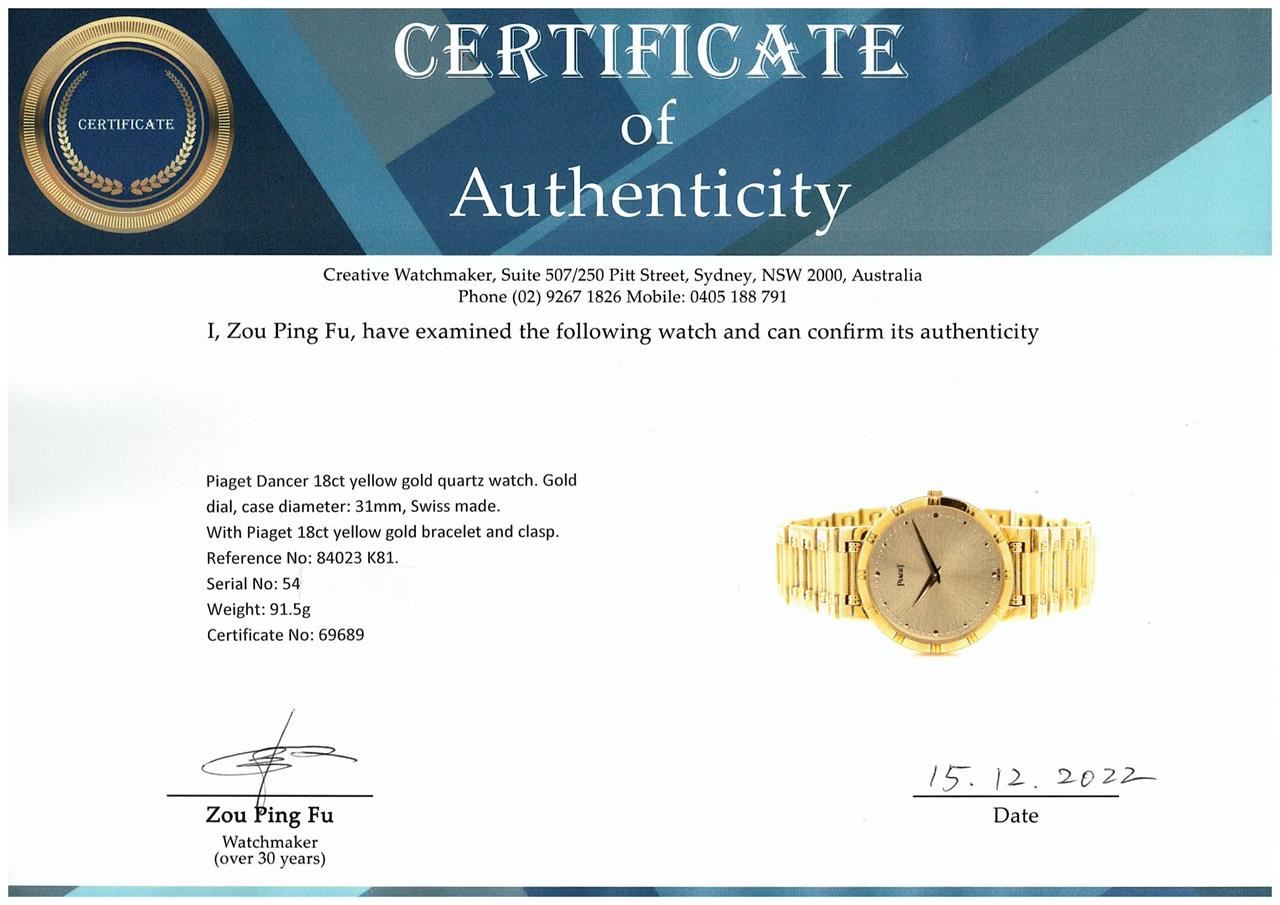 Piaget Dancer 18ct yellow gold quartz watch. Gold dial, case diameter: 31mm, wrist size: 18cm, Swiss made. Ref# 84023 K81. With Piaget 18ct yellow gold bracelet and clasp. With Certificate of Authenticity and Piaget box. 3 month FSA warranty. (Pre-owned)