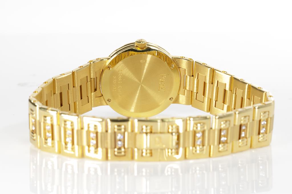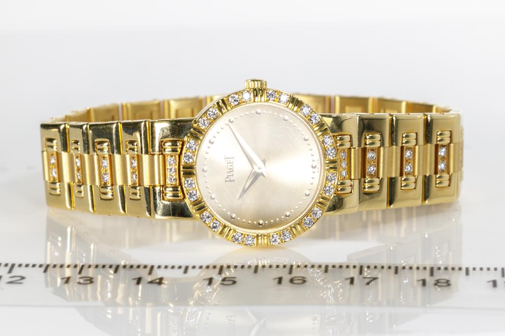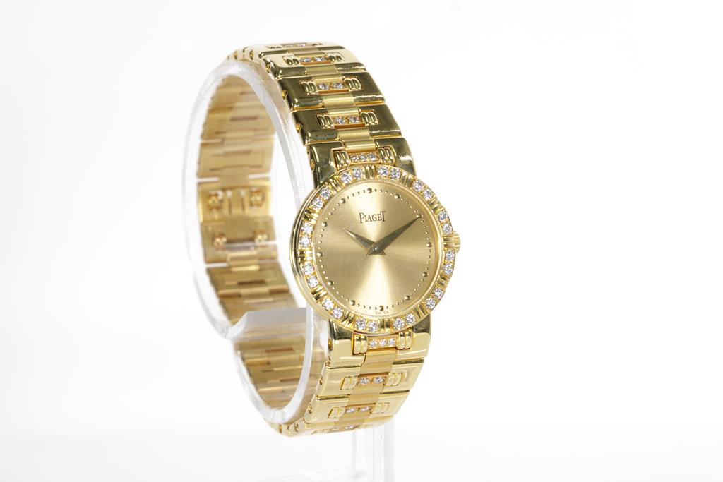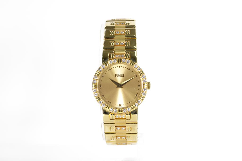 Piaget Dancer 18ct yellow gold ladies quartz watch. Gold dial, Diamond set bezel, case diameter: 23mm, length: 15.5cm, Swiss made. Ref# 80564 K818. With Piaget 18ct gold bracelet with Diamonds and clasp. With Certificate of Authenticity. 3 month FSA warranty. (Pre-owned)