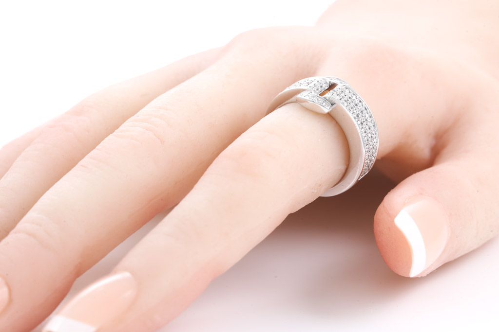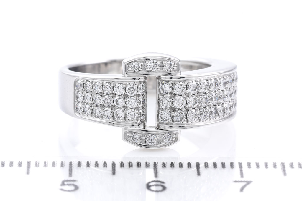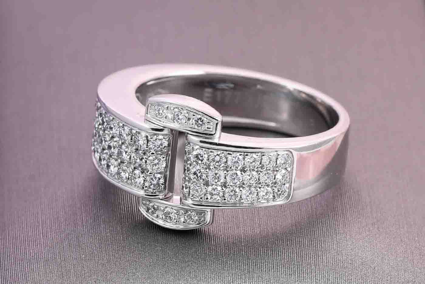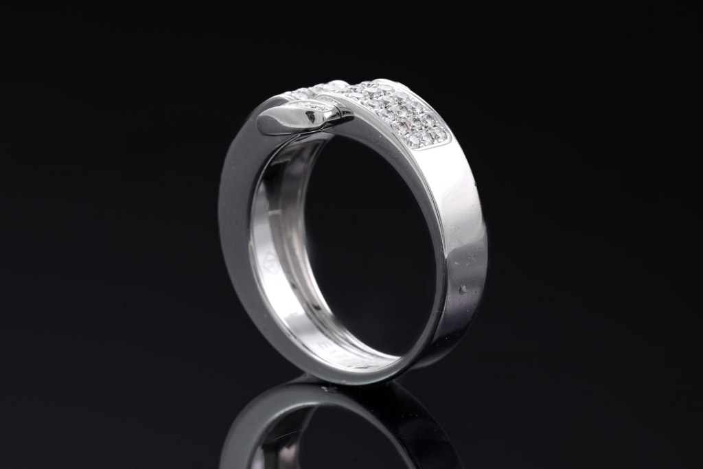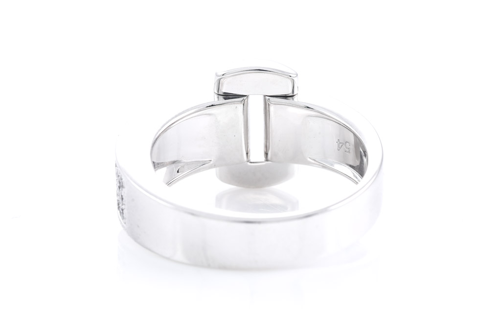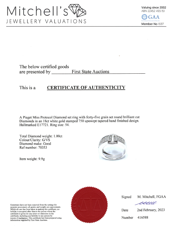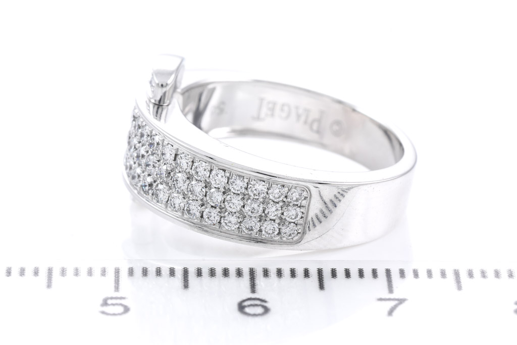 Piaget Miss Protocol Diamond ring with round Diamonds totalling aaproximately 1.00cts (Estimated grading: G VS). 18ct white gold. Piaget stamp size 54, N - ring resizing is not recommended. Weight: 9.9g. With certificate #416588. (Pre-owned)