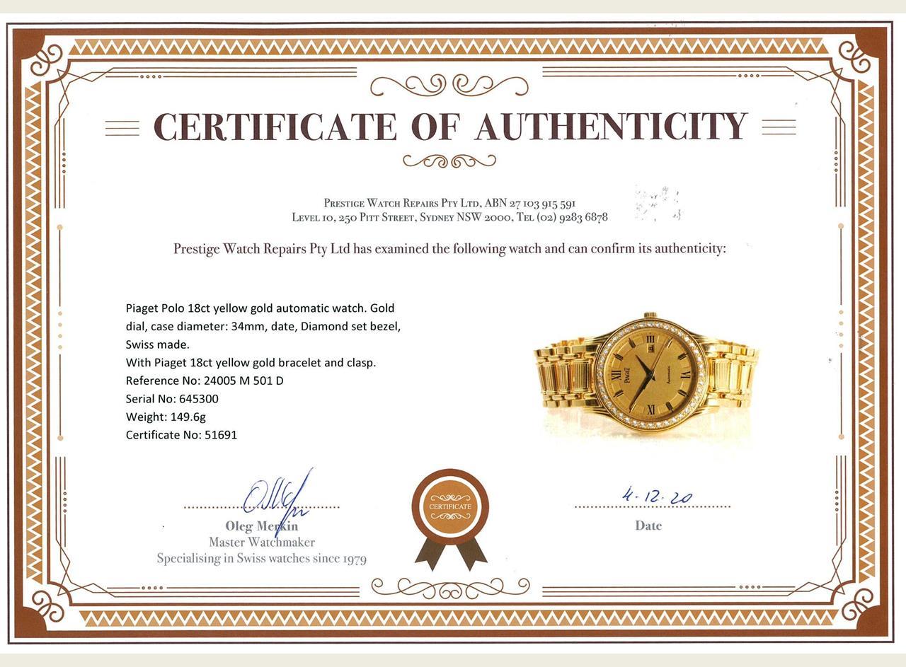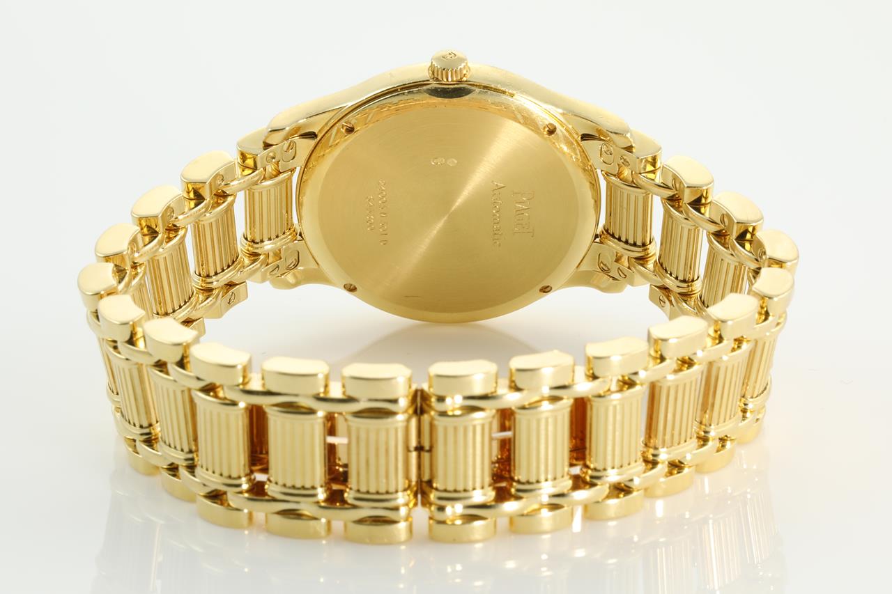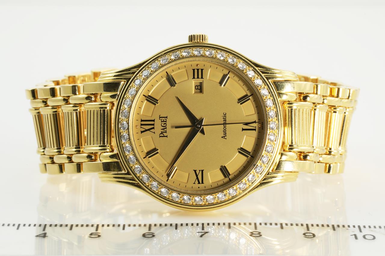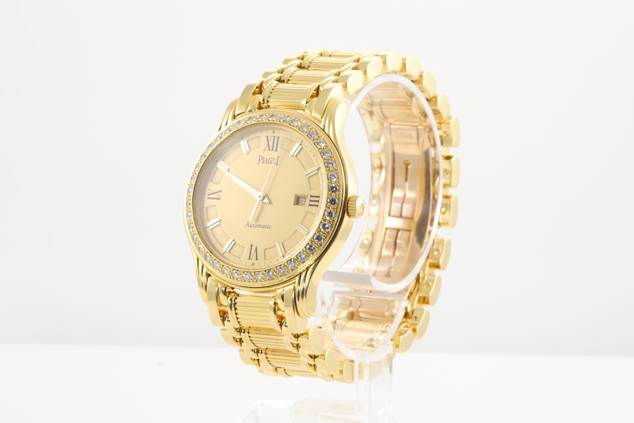 Piaget Polo 18ct yellow gold automatic watch. Gold dial, case diameter: 34mm, date, Diamond set bezel, wrist size: 17cm, Swiss made. Ref# 24005 M 501 D. With Piaget 18ct yellow gold bracelet and clasp. With certificate of authenticity. 3 month FSA warranty. (Pre-owned)