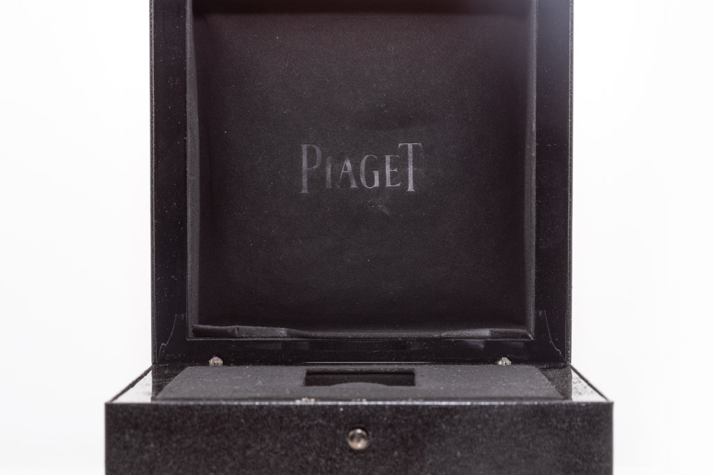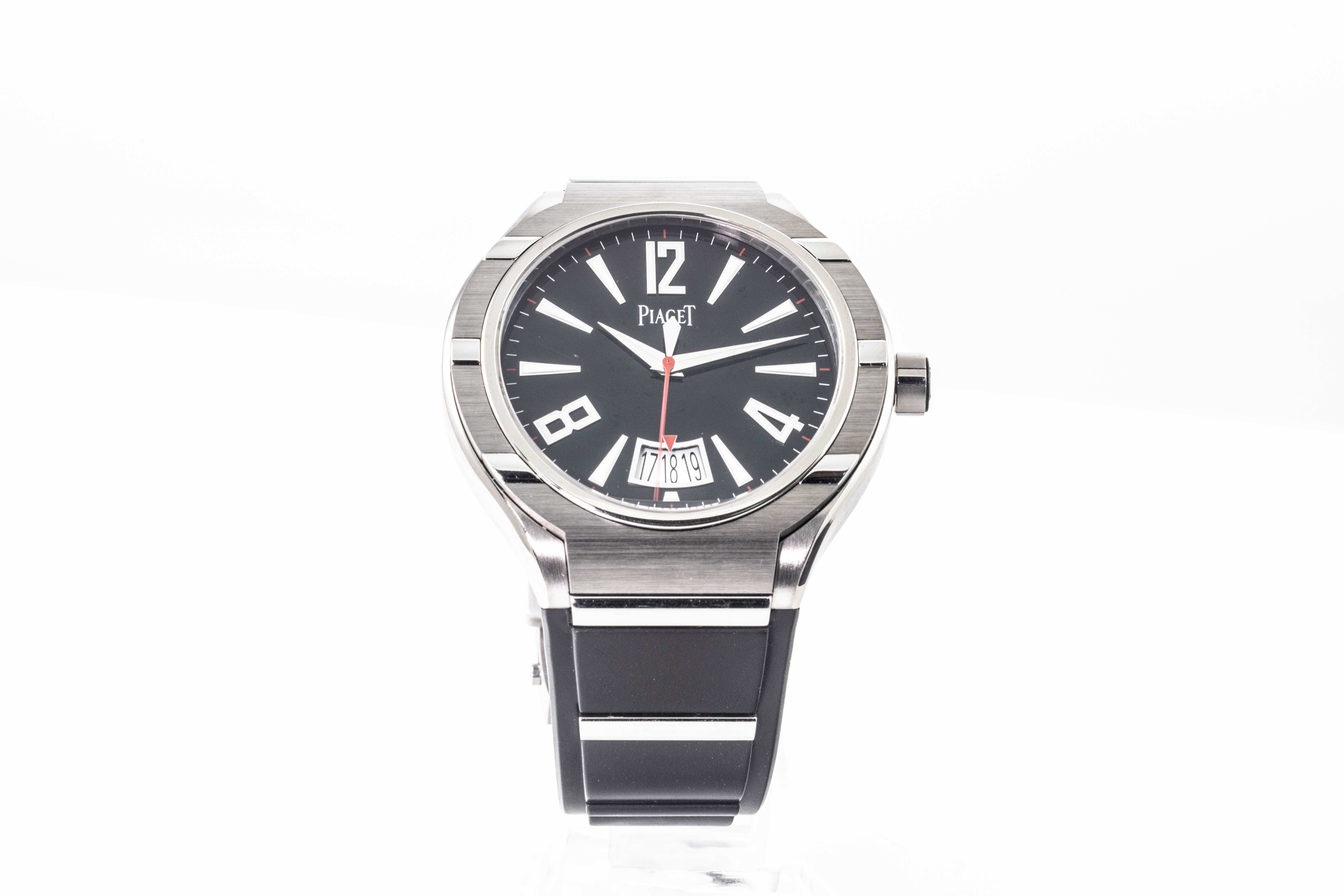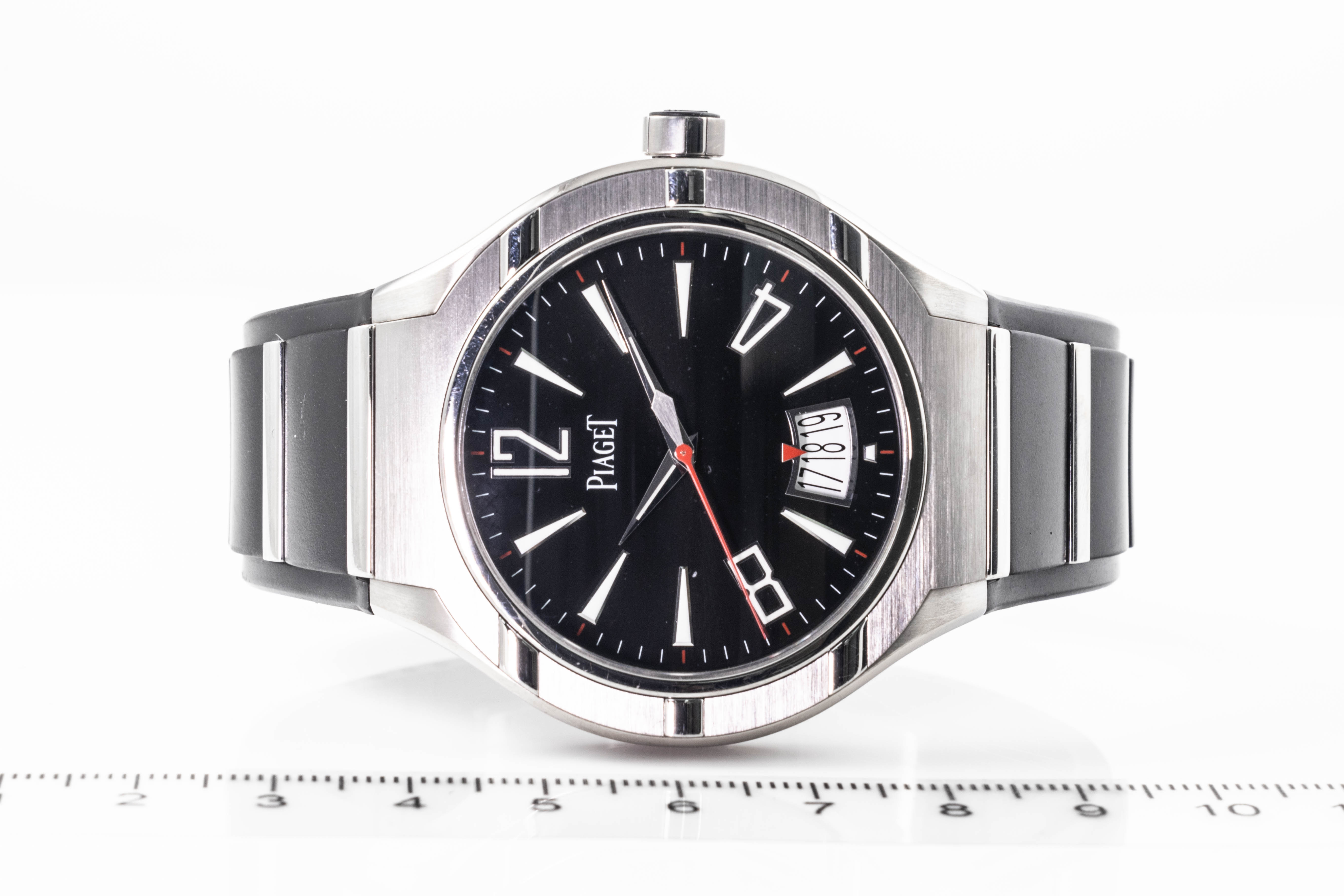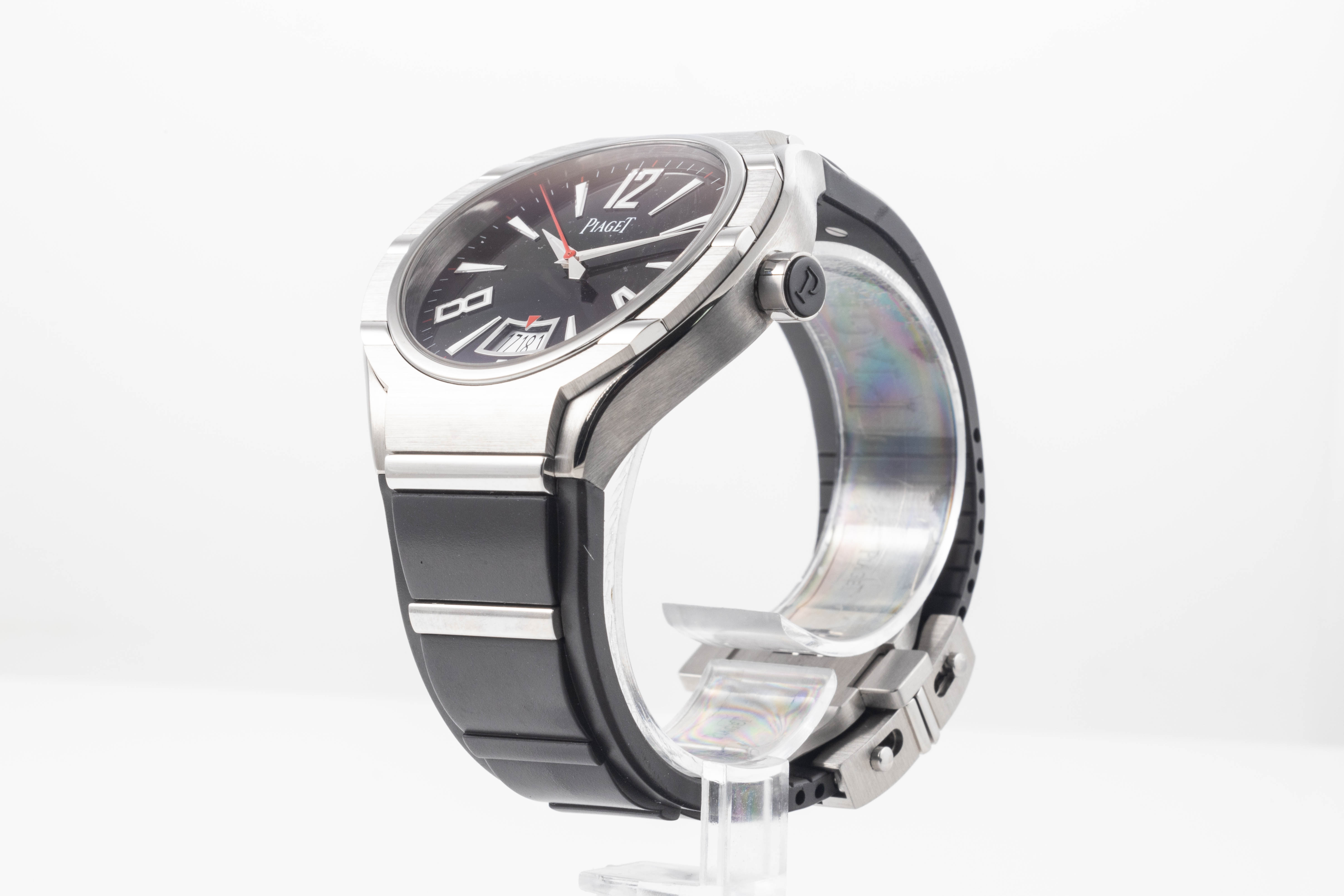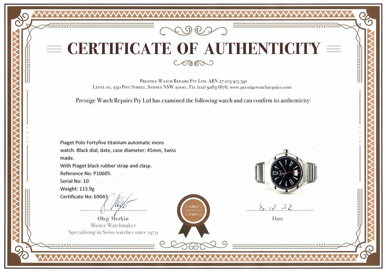 Piaget Polo Fortyfive titanium automatic men's watch. Black dial, date, case diameter: 45mm, wrist size: 16cm, Swiss made. Ref# P10605. With Piaget black rubber strap and clasp. With Certificate of Authenticity, Piaget Warranty Certificate dated 06/07/2010, Piaget spare grey rubber strap and Piaget box. 3 month FSA warranty. (Pre-owned)