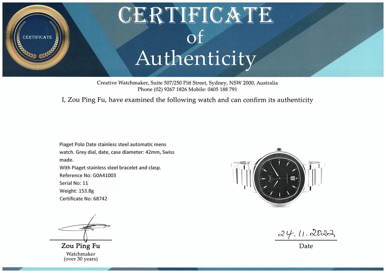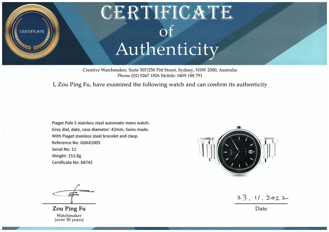 Piaget Polo S stainless steel automatic mens watch. Grey dial, date, case diameter: 42mm, wrist size: 19cm, Swiss made. Ref# G0A41003. With Piaget stainless steel bracelet and clasp. With Certificate of Authenticity, Piaget International Limited Warranty Card dated 31/01/2019 and Piaget box. 3 month FSA warranty. (Pre-owned)
