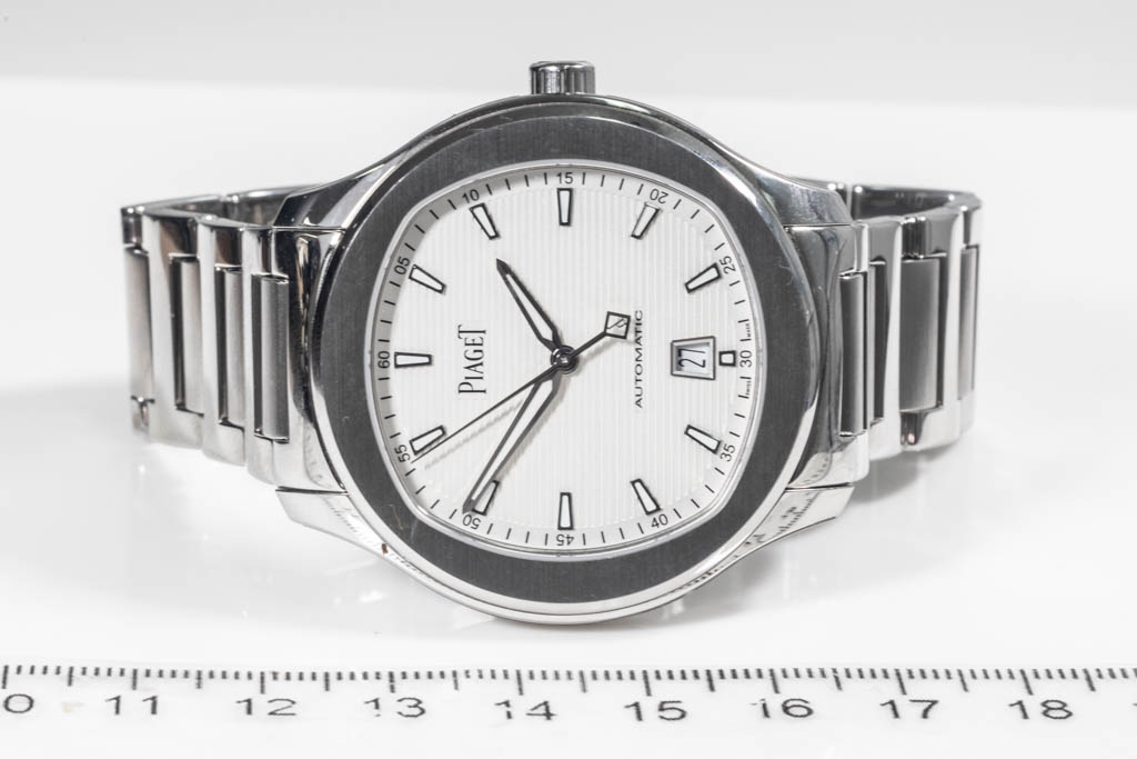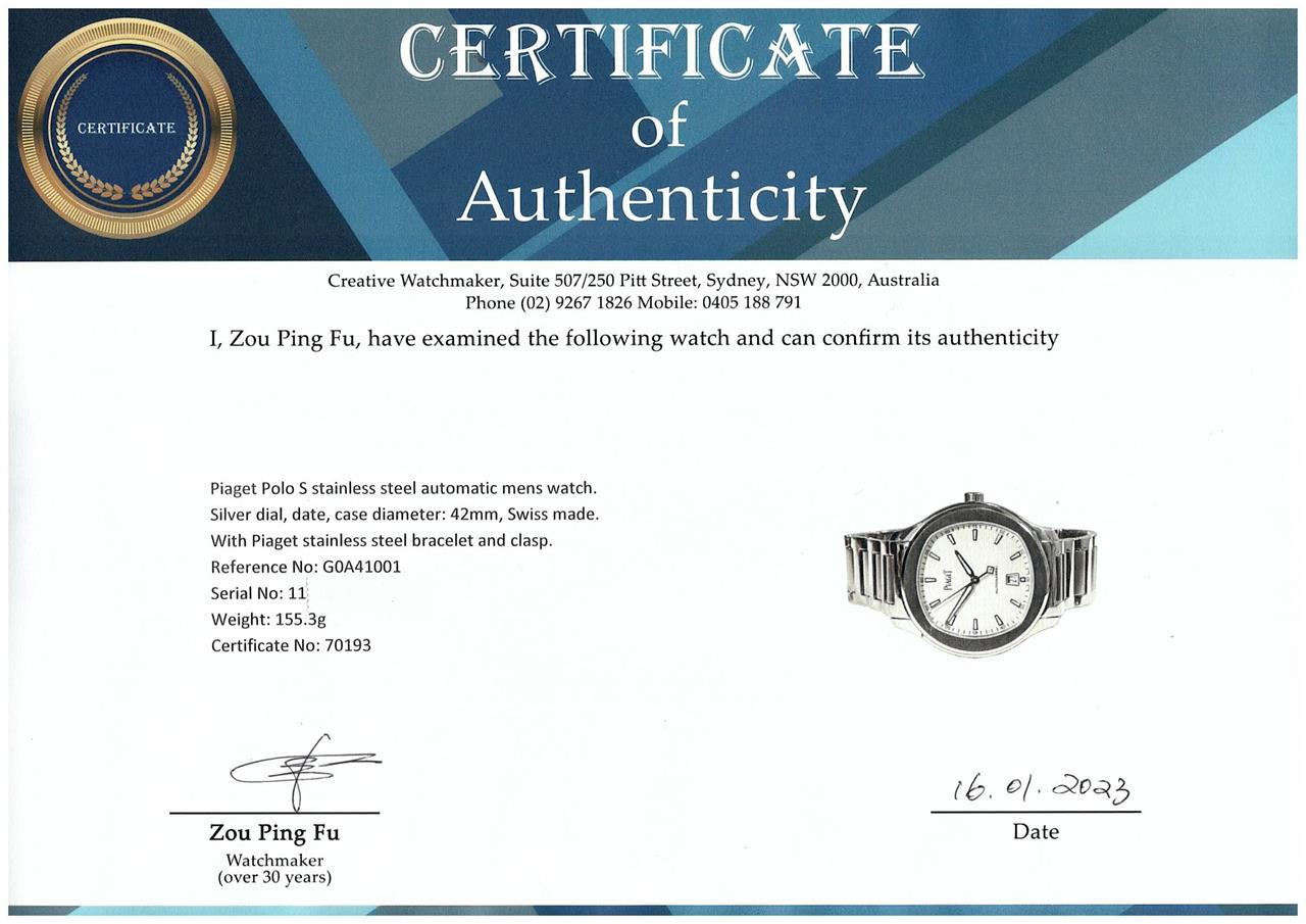 Piaget Polo S stainless steel automatic mens watch. Silver dial, date, case diameter: 42mm, wrist size: 19.5cm, Swiss made. Ref# G0A41001. With Piaget stainless steel bracelet and clasp. With Certificate of Authenticity, Piaget International Limited Warranty Card dated 13/11/2021 and Piaget box. 3 month FSA warranty. (Pre-owned)