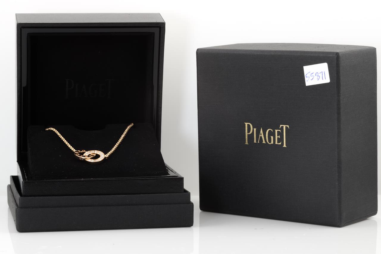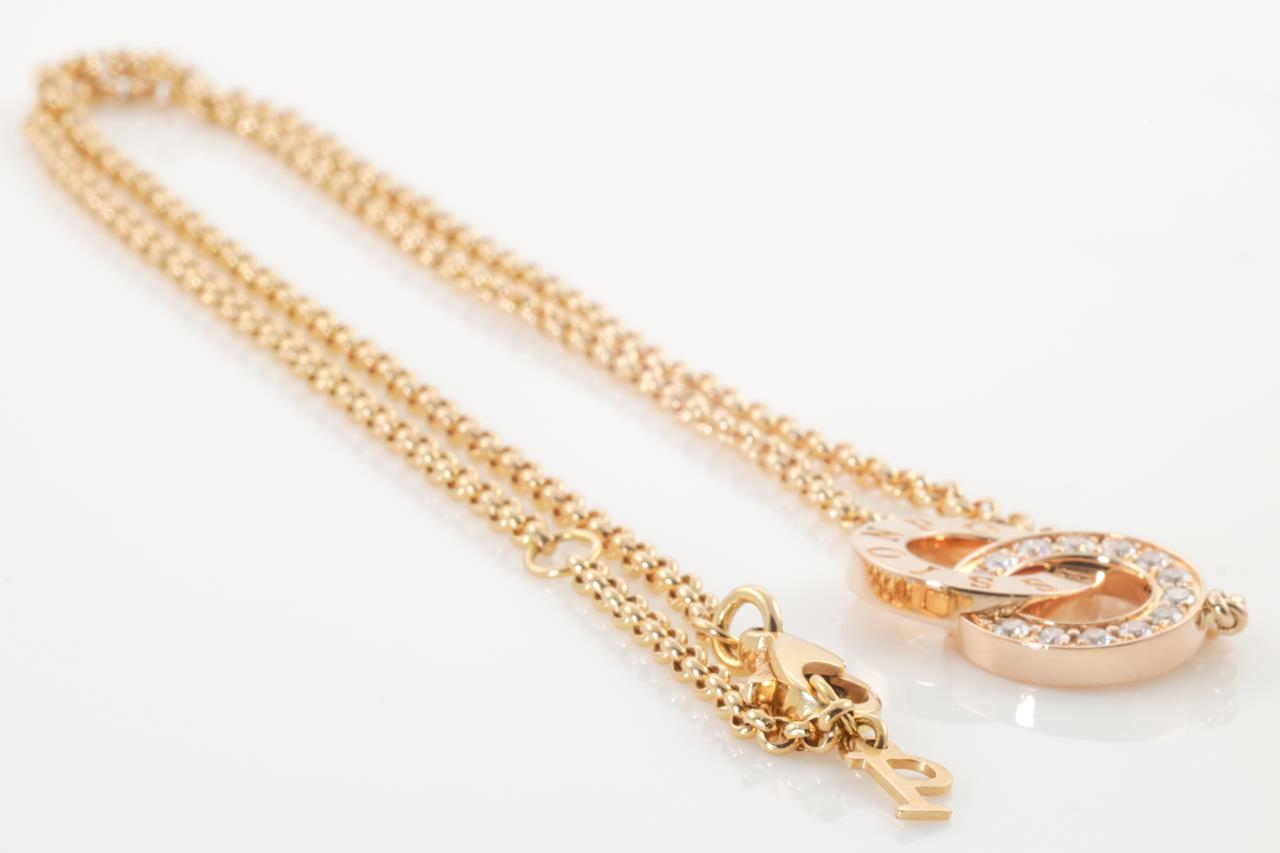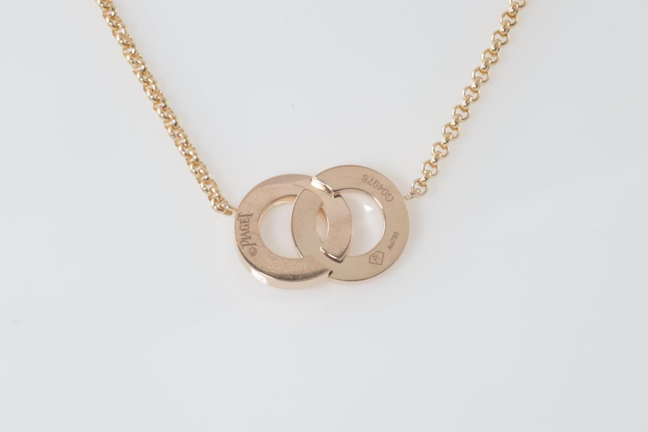 Piaget Possession Diamond pendant with two interlocking circles. 13 round Diamonds totalling 0.23cts. 18ct rose gold with attached chain. Adjustable max length: 42cm. With Piaget box & certificate dated 03/12/2011. Weight: 10.9g (Pre-owned)