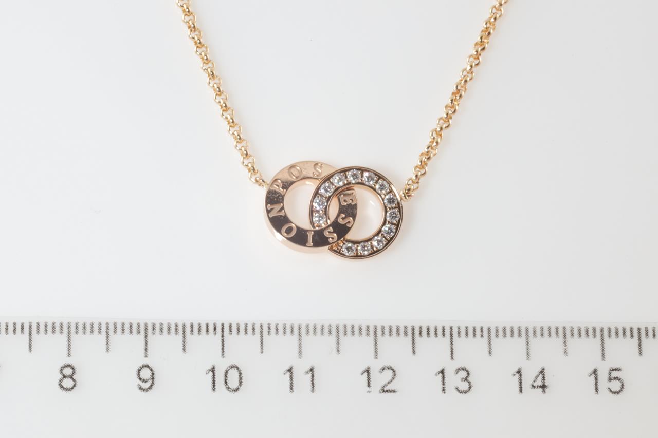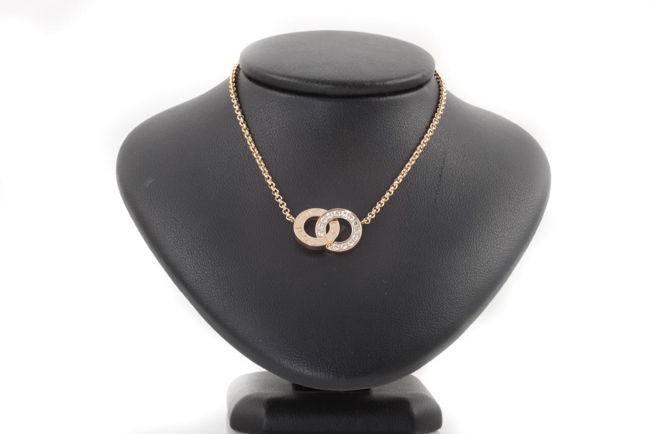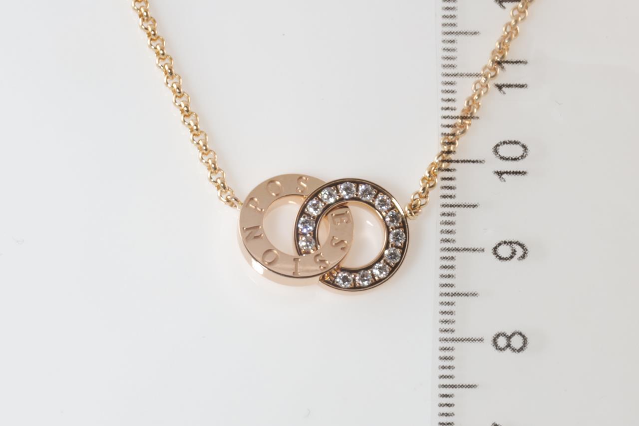Piaget Possession Diamond pendant with two interlocking circles. 13 round Diamonds totalling 0.23cts. 18ct rose gold with attached chain. Adjustable max length: 42cm. With Piaget box & certificate dated 03/12/2011. Weight: 10.9g (Pre-owned)