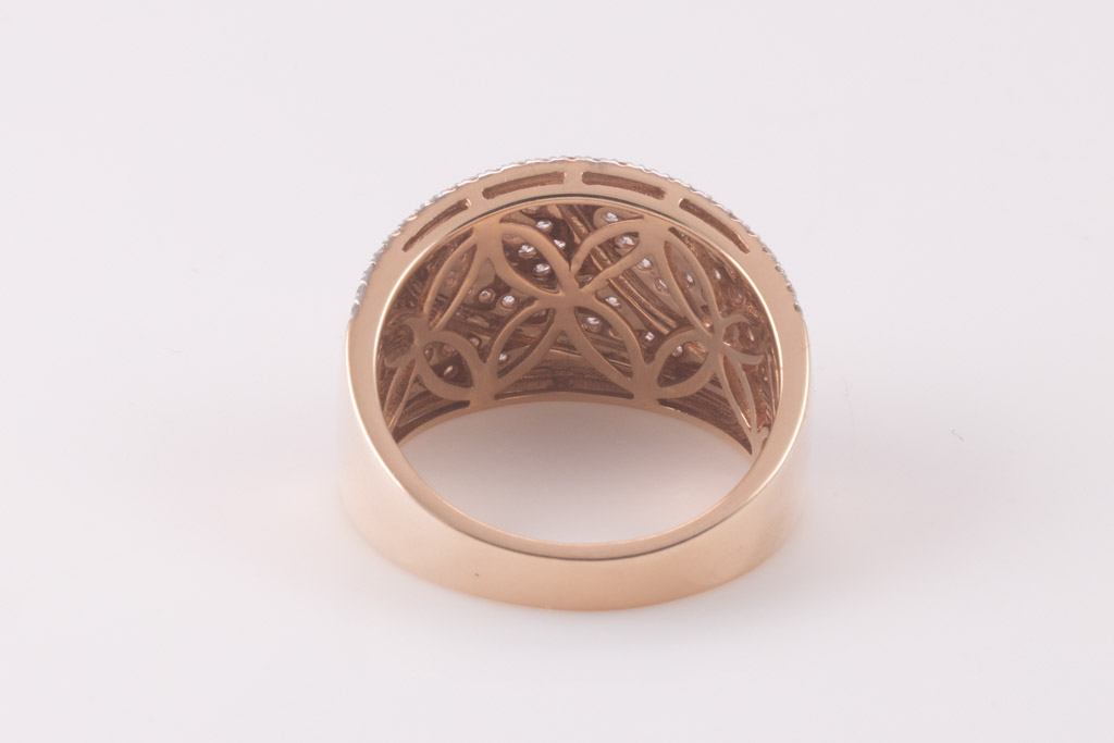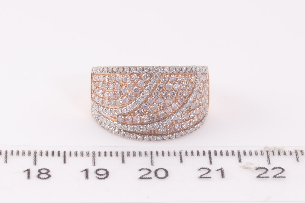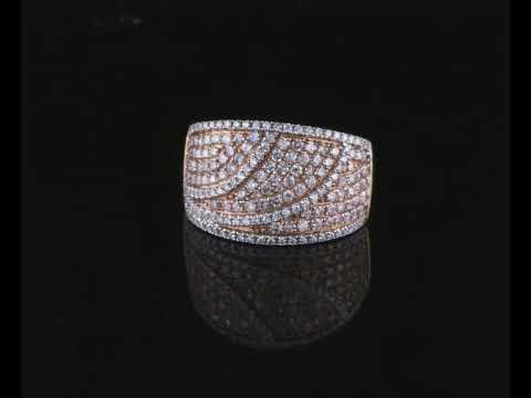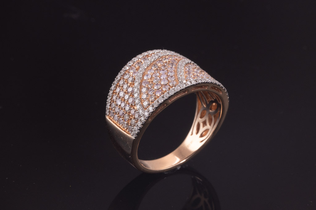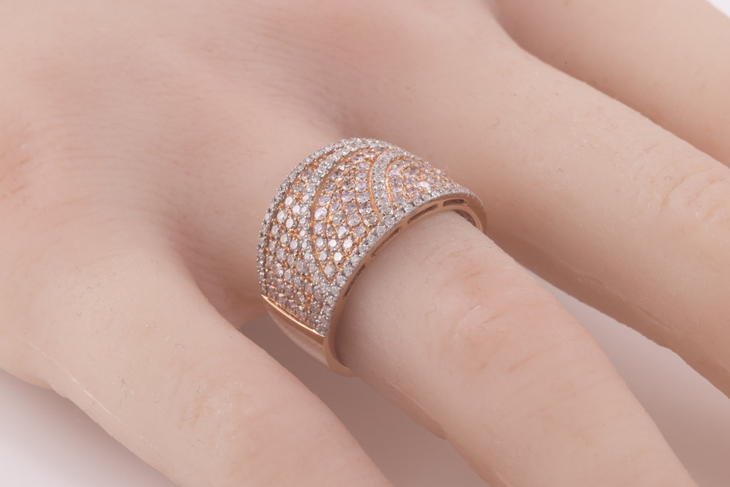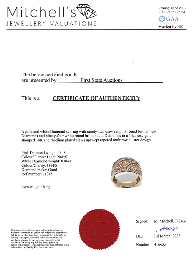 Diamond ring with round pink Diamonds totalling 0.48cts (Estimated grading: Light Pink SI) and round Diamonds totalling 0.86cts (Estimated grading: G-H SI). 14ct rose gold with rhodium plated claws. Ring size N - ring resizing is not recommended. Weight: 6.4g. With certificate #416655. (As New)