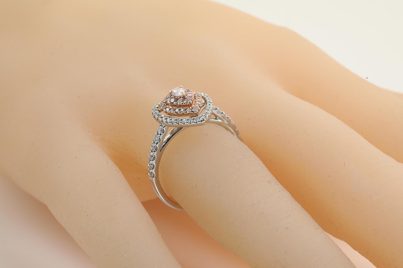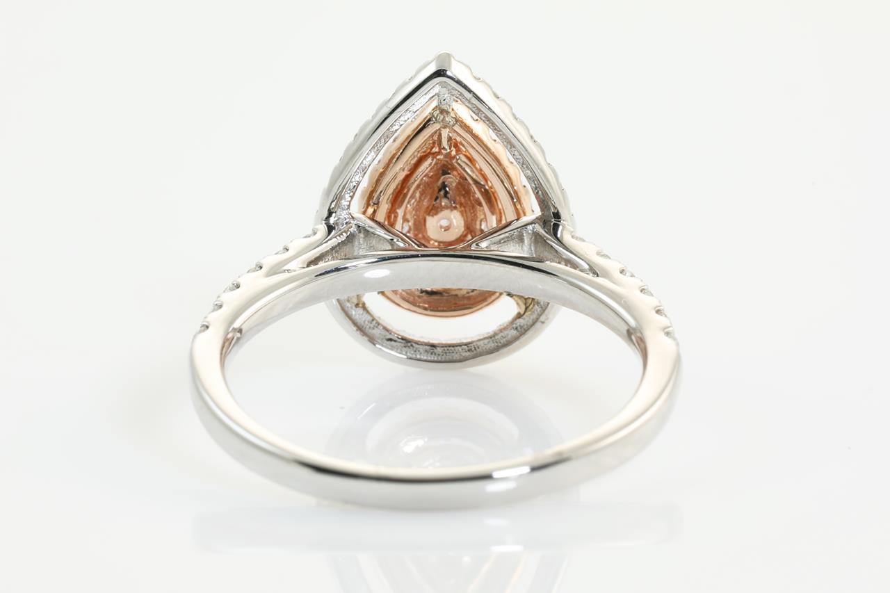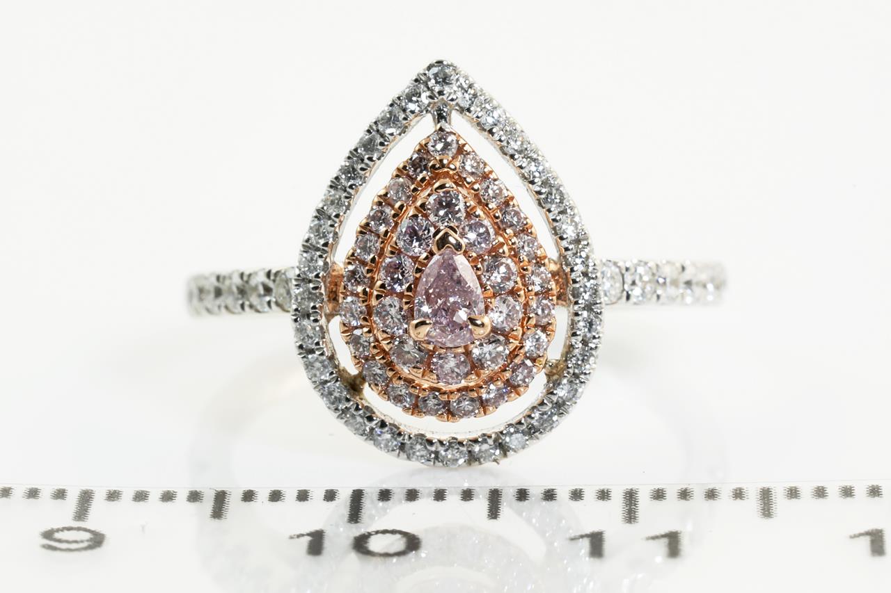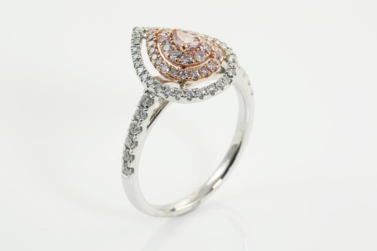 Diamond ring with centre pear shape pink Diamond of 0.10ct and remaining round pink (Estimated grading: SI-P1) and white Diamonds totalling 0.81cts (Estimated grading: H SI). 14ct white and rose gold. Ring size N1/2 - Note this ring cannot be resized. Weight:3.5g (As New)