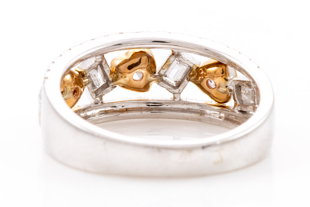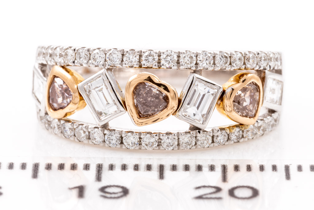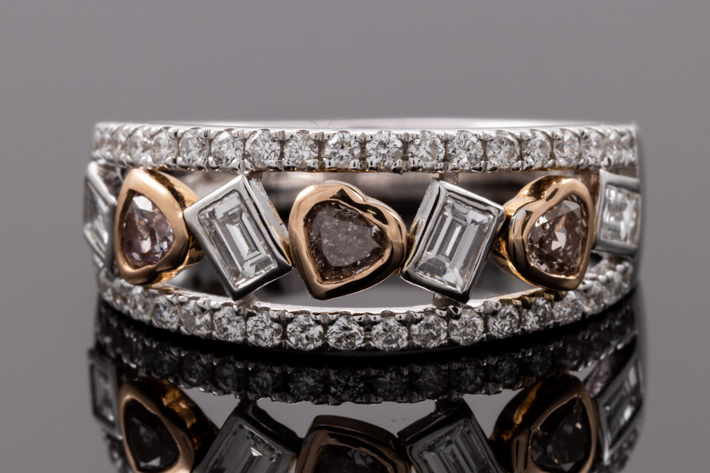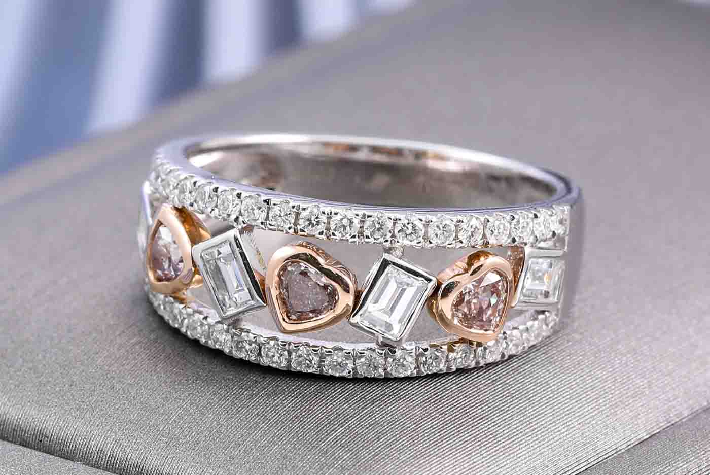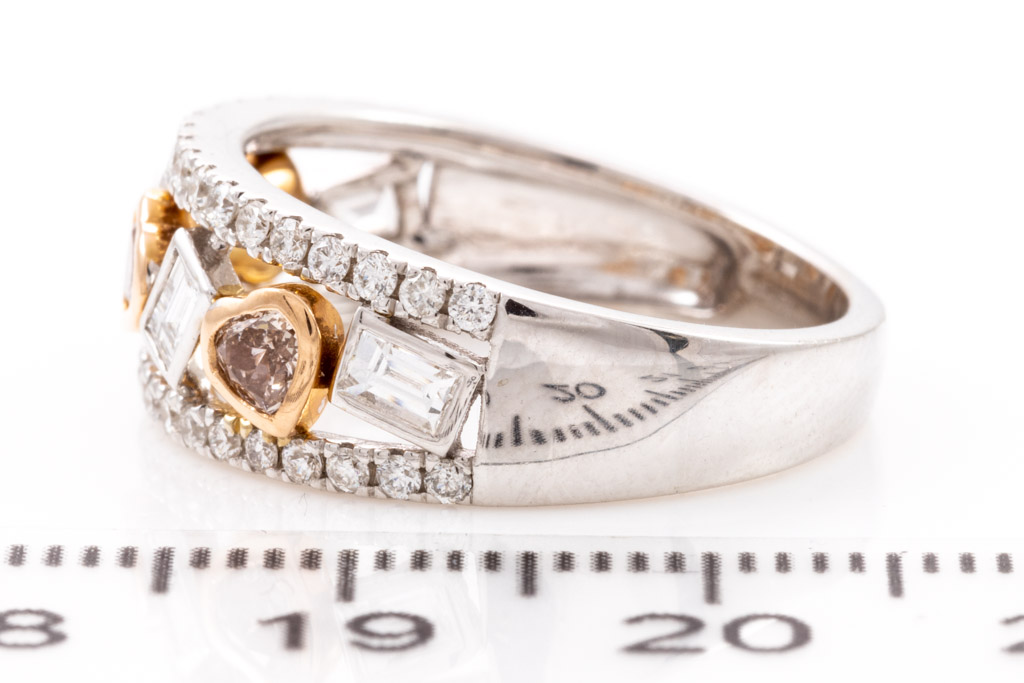 Diamond ring with heart shape Pink Diamonds totalling 0.28cts, baguette cut white Diamonds totalling 0.34cts (Estimated grading G-H VS) & surrounding Diamonds totalling 0.38cts (Estimated grading: G-H SI). 14ct rose gold and white gold. Ring size N - ring resizing is not recommended. Weight: 4.2g. With certificate #416446. (As new)