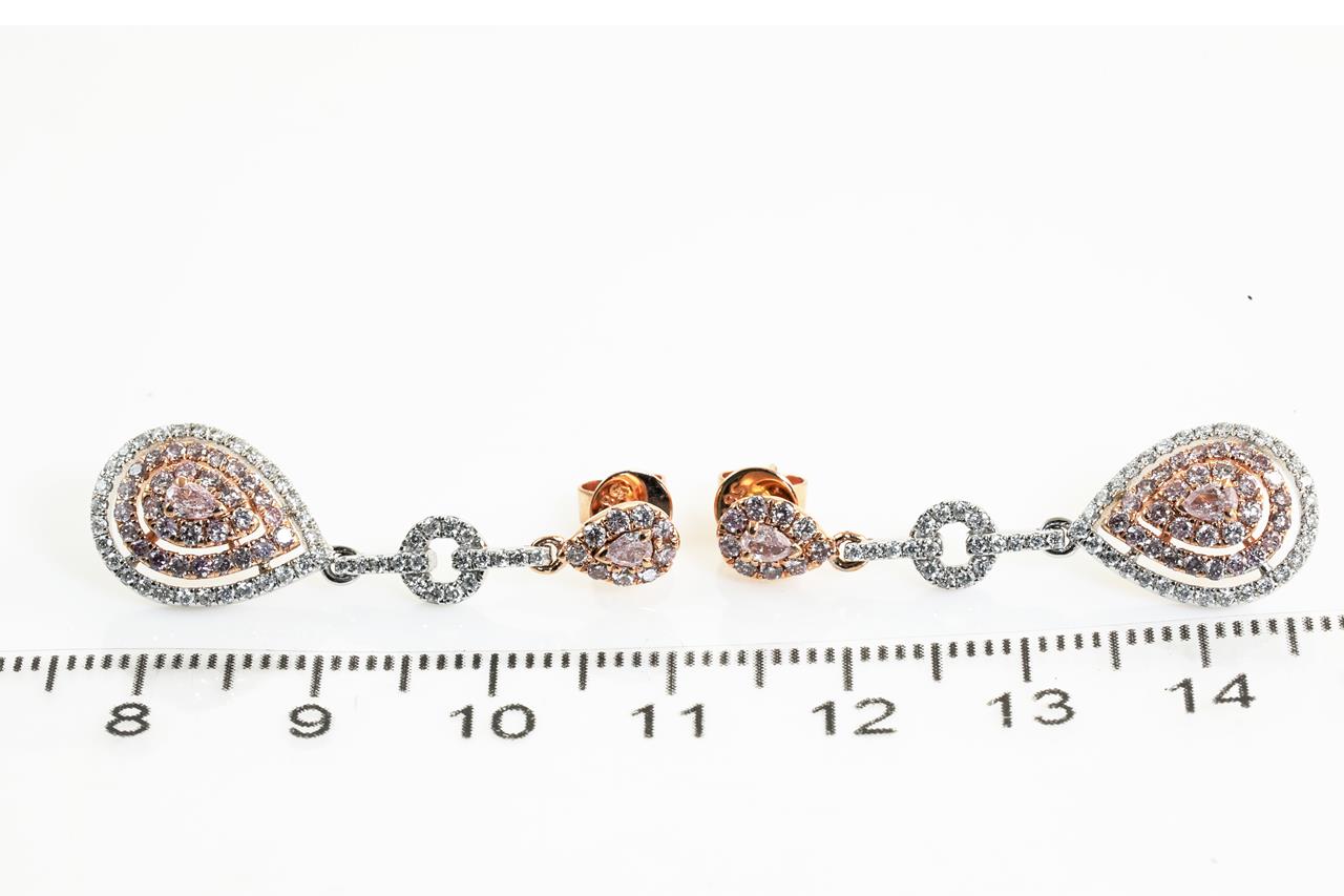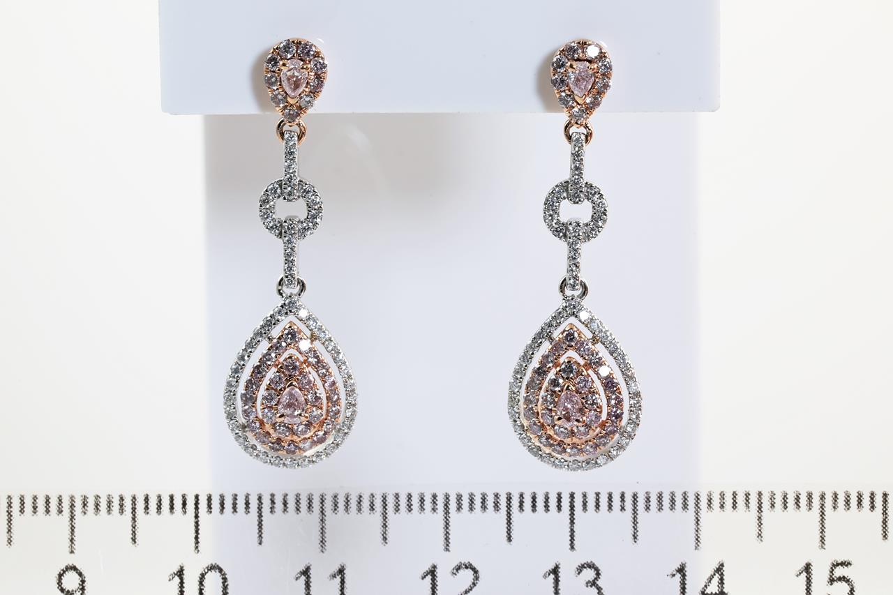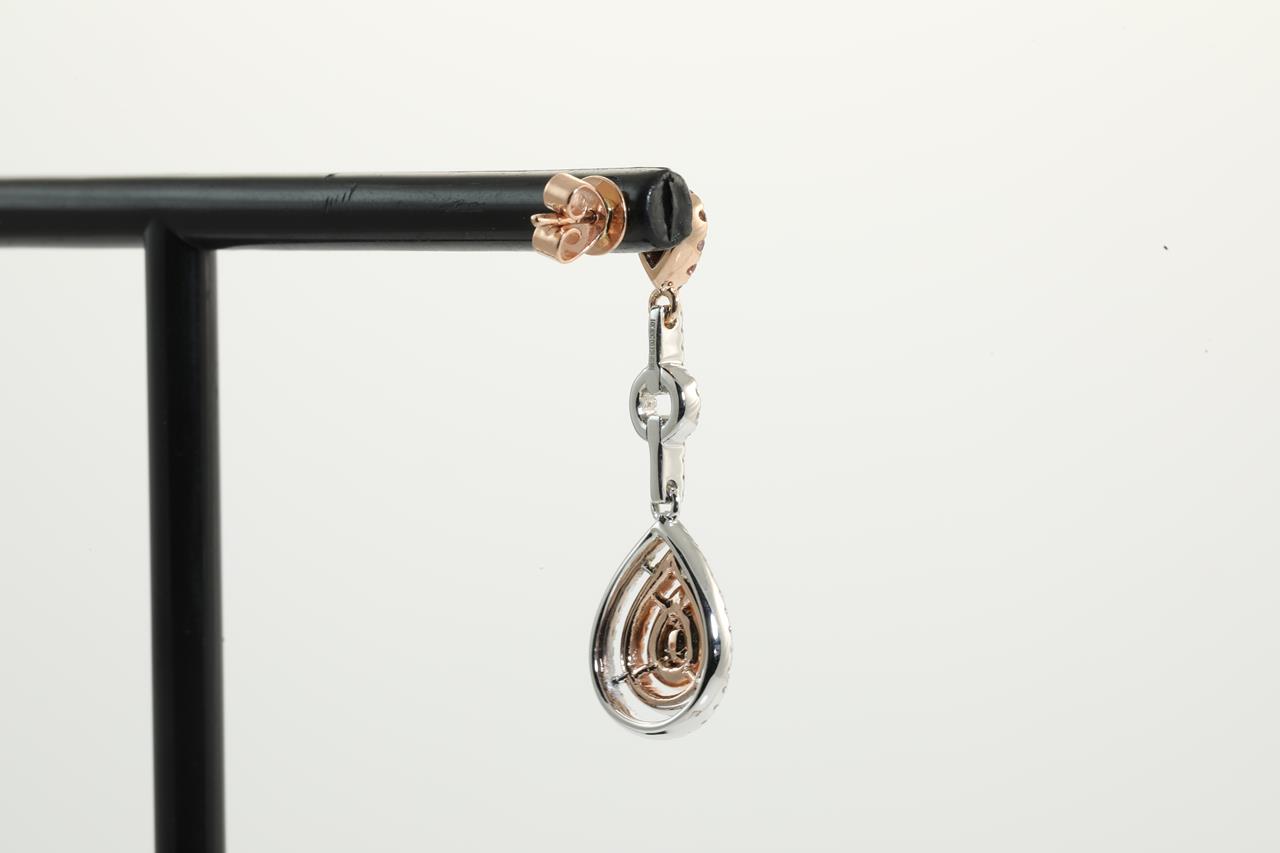 Diamond earrings with 4 pear shape pink Diamonds totalling 0.25cts and remaining pink and white Diamonds totalling 1.30cts (Estimated grading: H SI-P1). 14ct rose & white gold. Weight: 5.9g. (As new)
