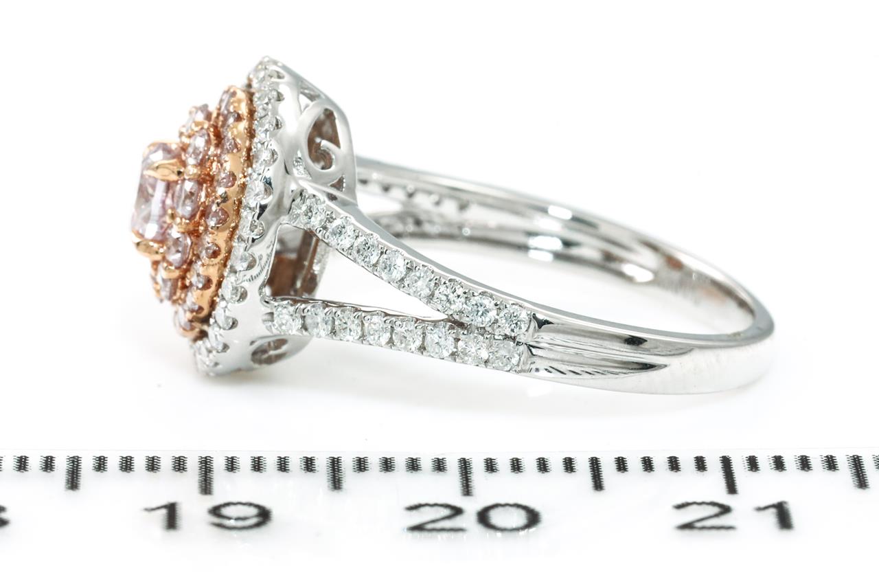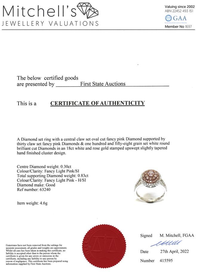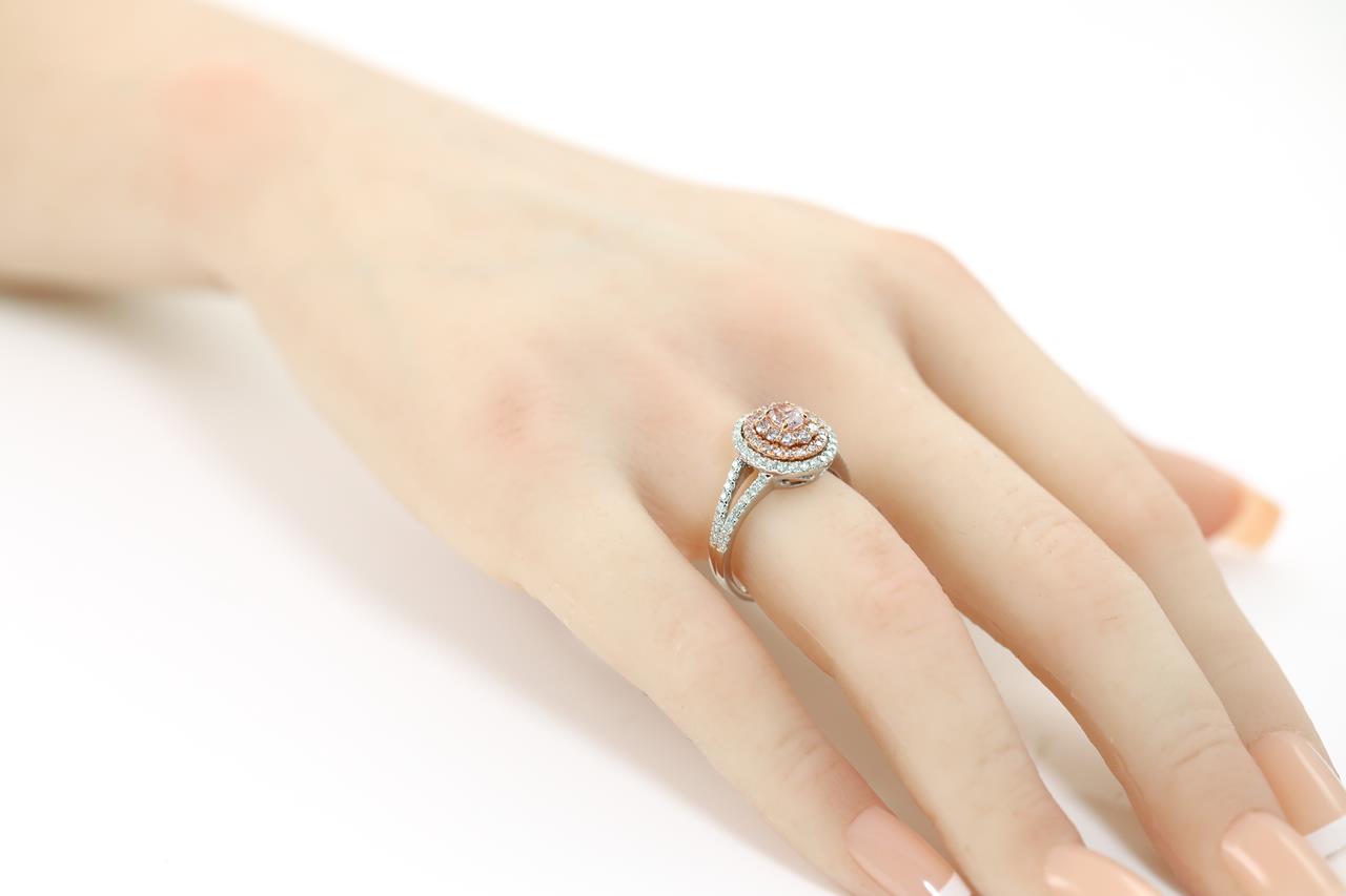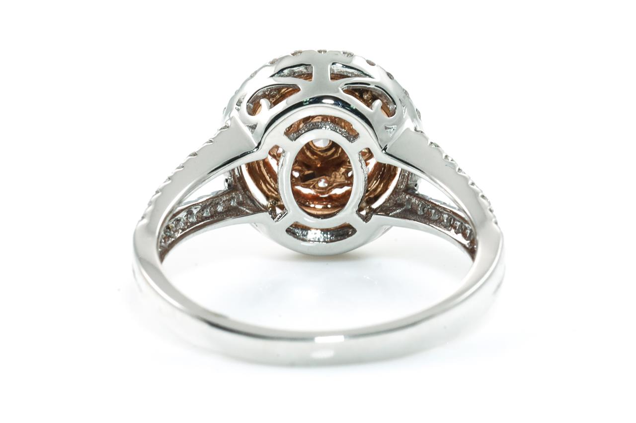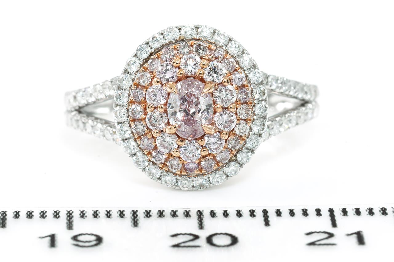 Diamond and Diamond halo ring with a centre oval shape Pink Diamonds totalling 0.30ct (Estimated grading: Fancy Light Pink SI) and remaining pink & white Diamonds totalling 0.83cts (Estimated grading: Fancy Light Pink - H SI). 18ct white and rose gold. Ring size: N - ring resizing is not recommended. Weight: 4.6g. With certificate #415595. (As new)