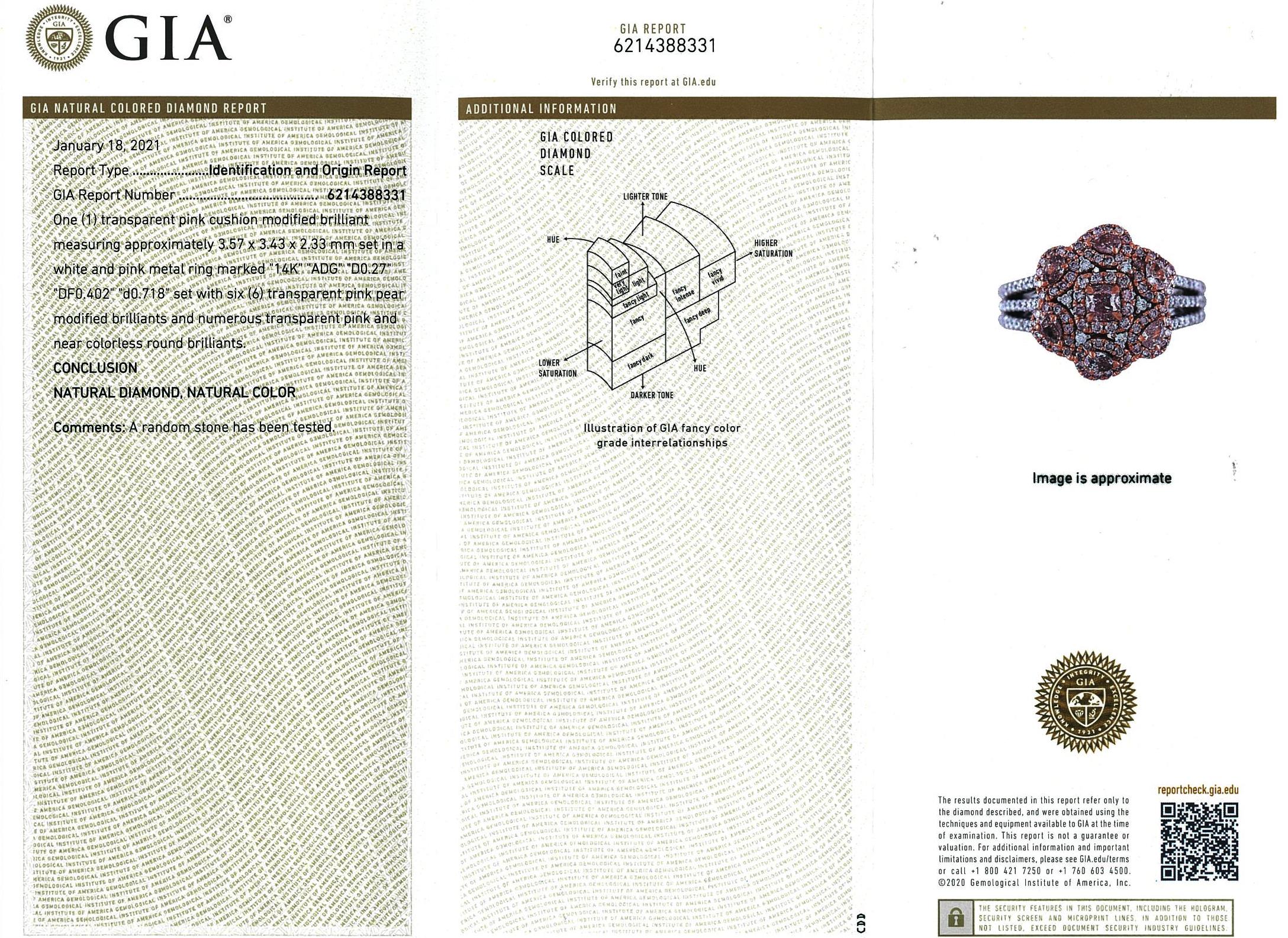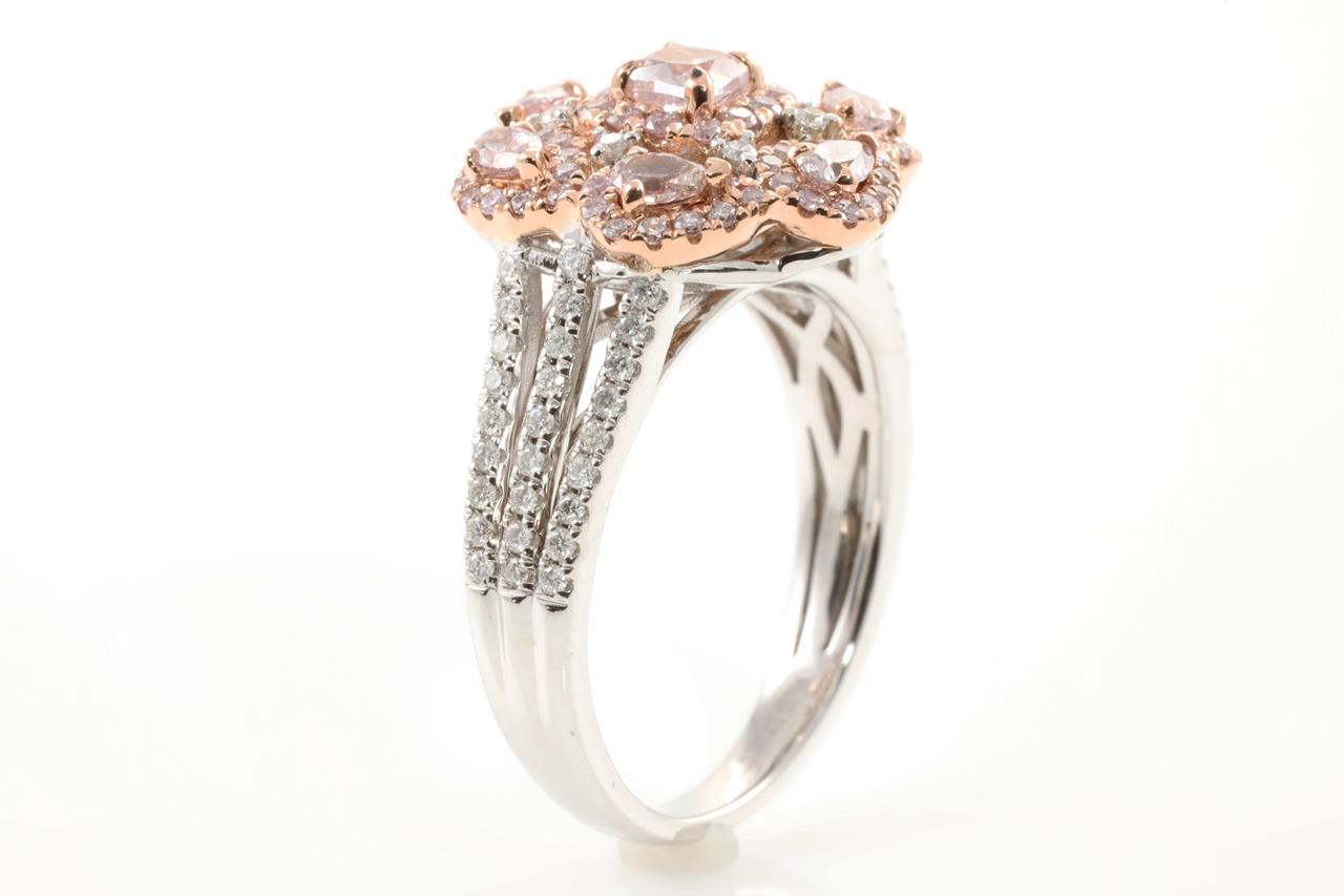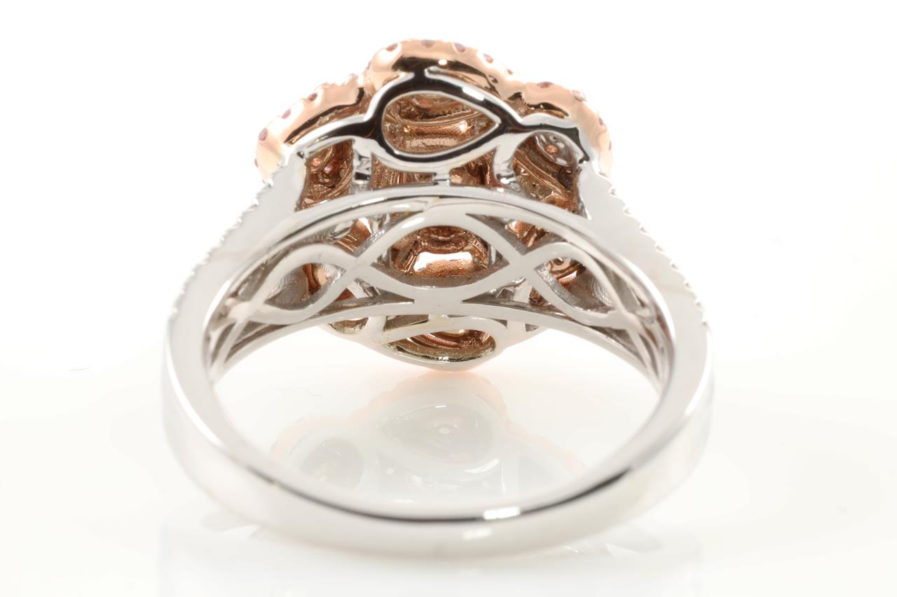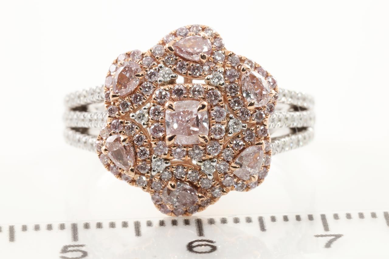 Diamond ring with centre pink Diamonds totalling 0.67cts and remaining Diamonds totalling 0.71cts. With GIA report #6214388331. 14ct rose & white gold. Ring size M1/2. Weight: 6.6g. (New)