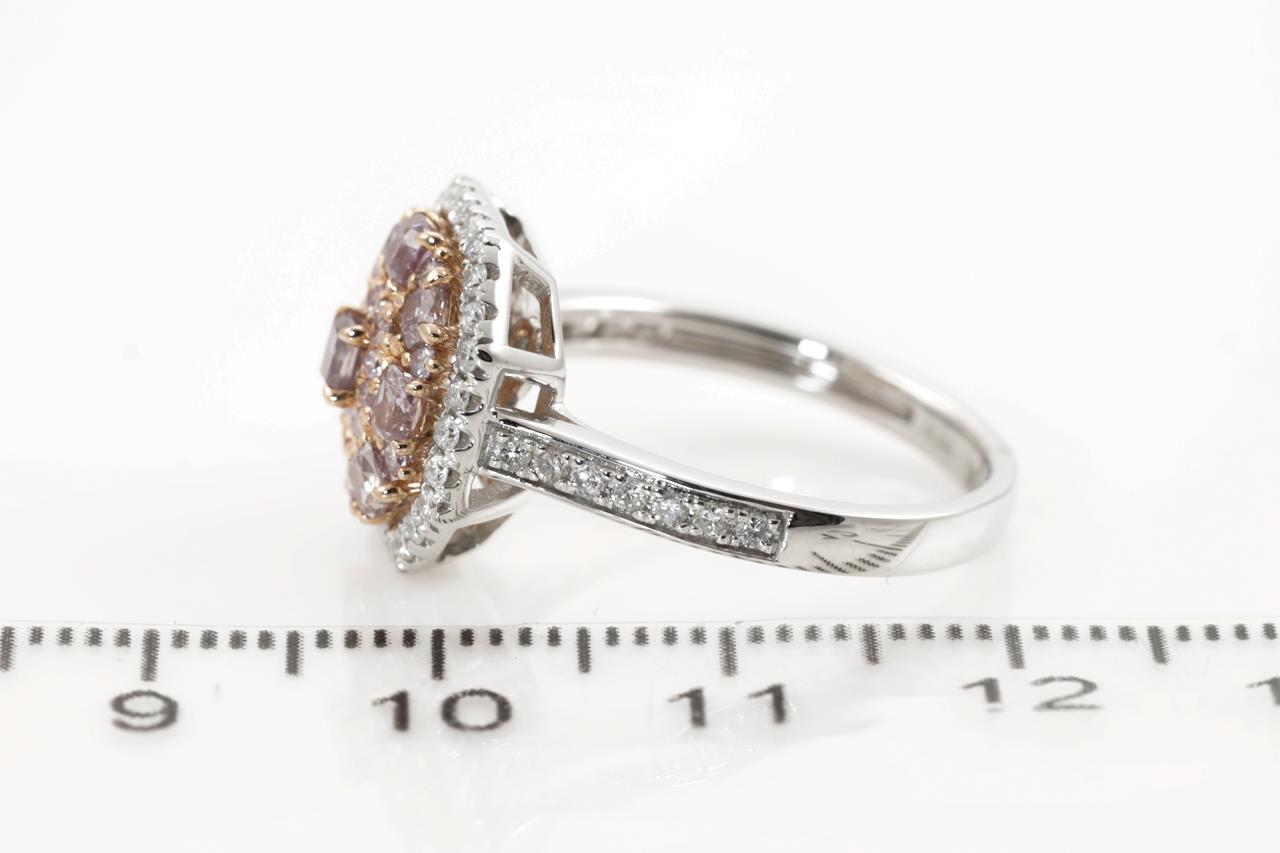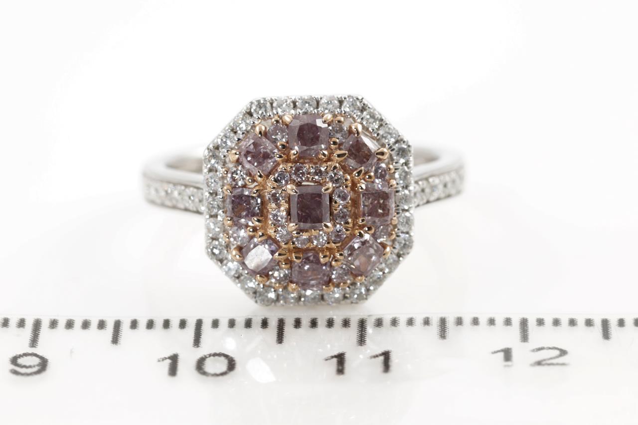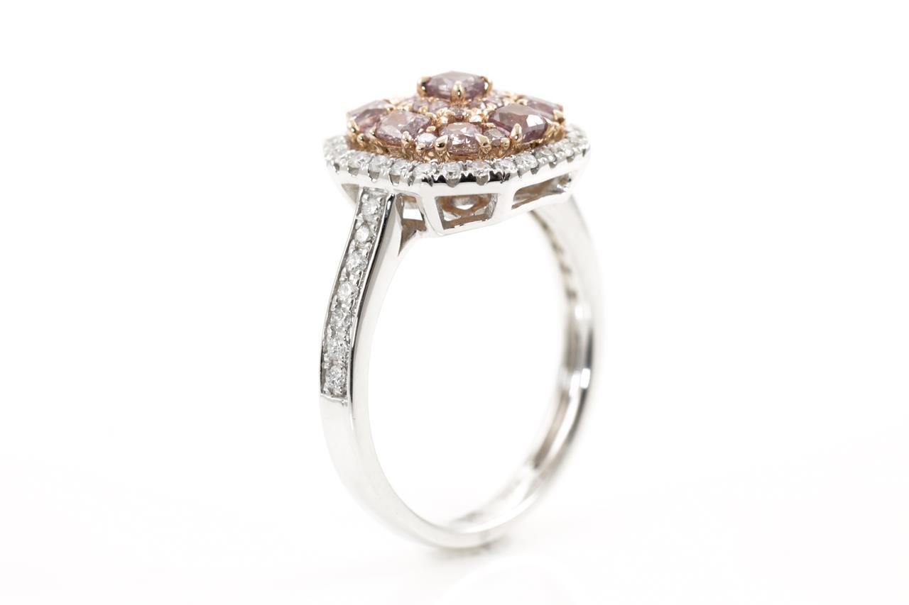 Diamond ring with 9 natural brownish purplish pink fancy Diamonds totalling 0.74cts (Estimated grading: Pink P1-2) and remaining Diamonds totalling 1.24cts (Estimated grading: G-H SI-P1). 14ct white & rose gold. Ring size N. Weight: 4.6g. With GIA report #5212491806 (As new)