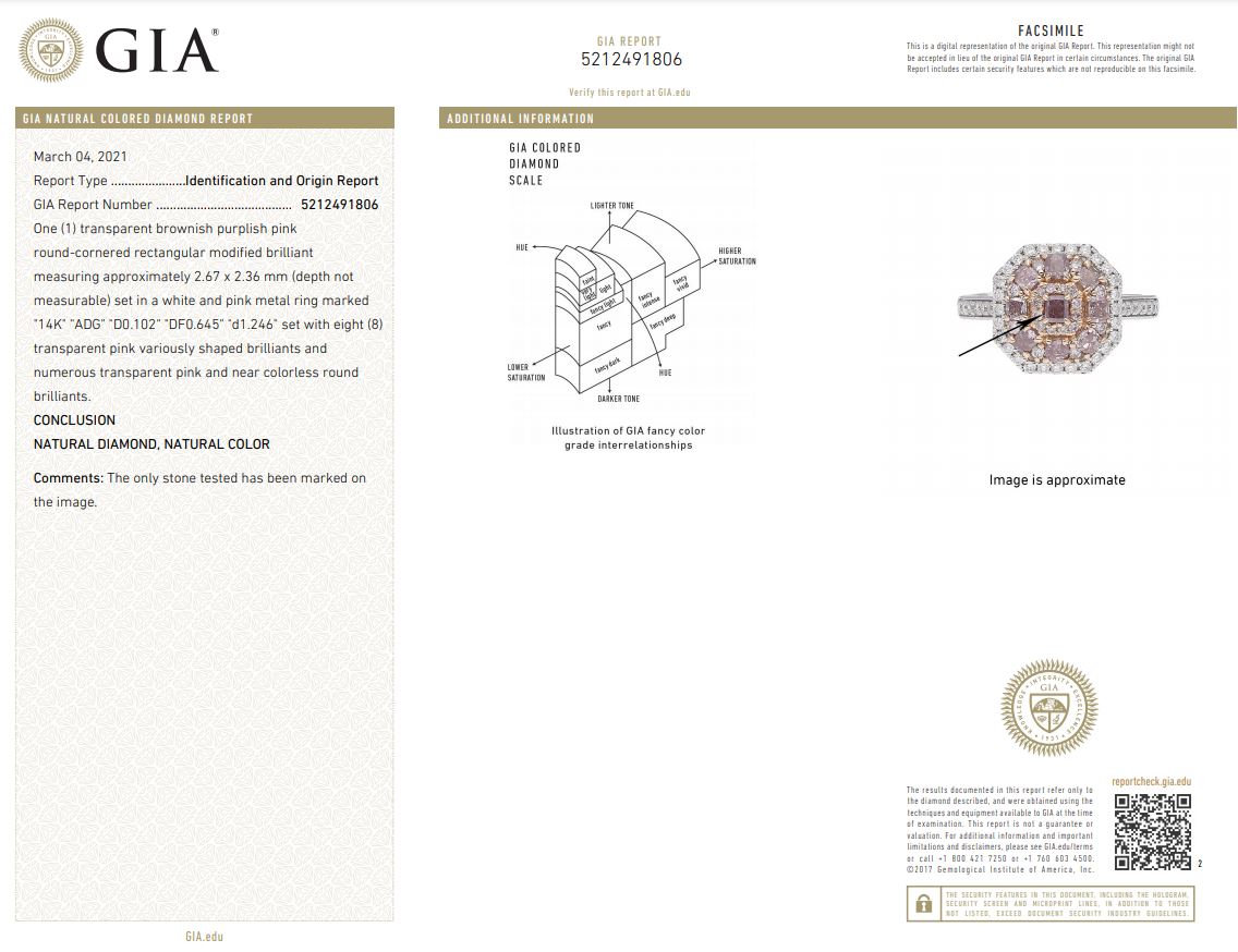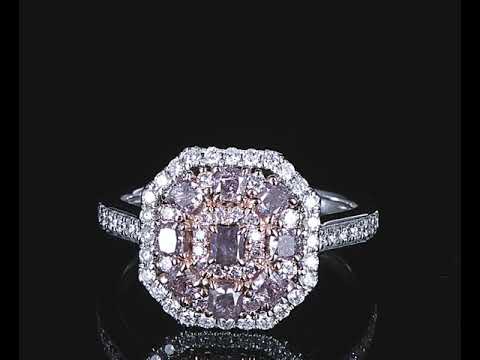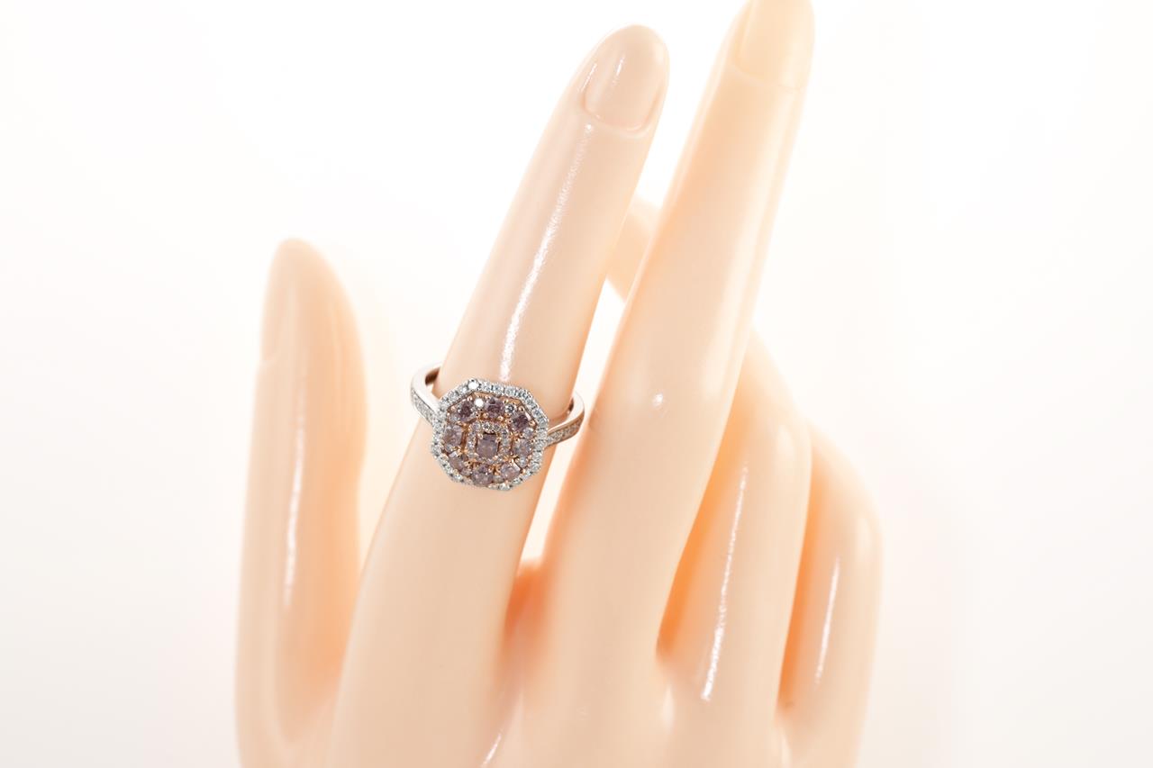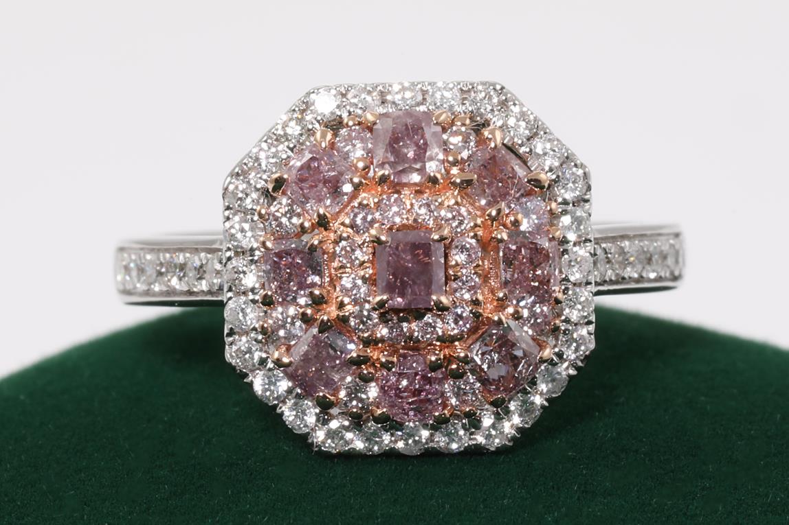 Diamond ring with 9 natural brownish purplish pink fancy Diamonds totalling 0.74cts (Estimated grading: Pink P1-2) and remaining Diamonds totalling 1.24cts (Estimated grading: G-H SI-P1). 14ct white & rose gold. Ring size N. Weight: 4.6g. With GIA report #5212491806 (As new)