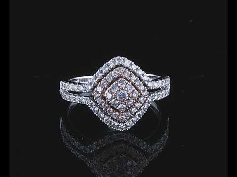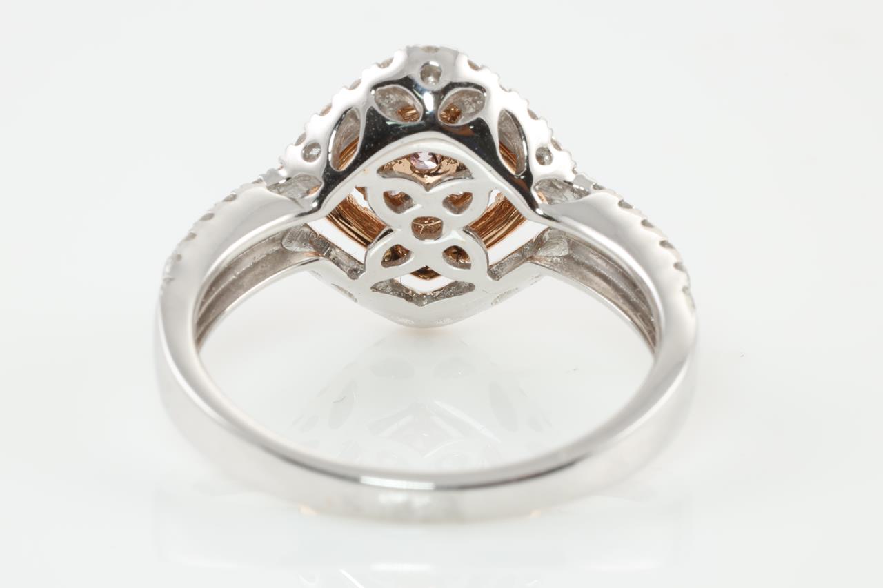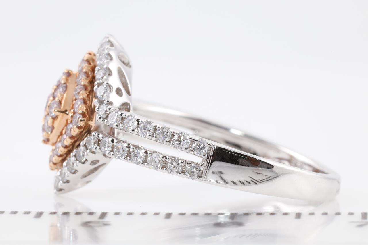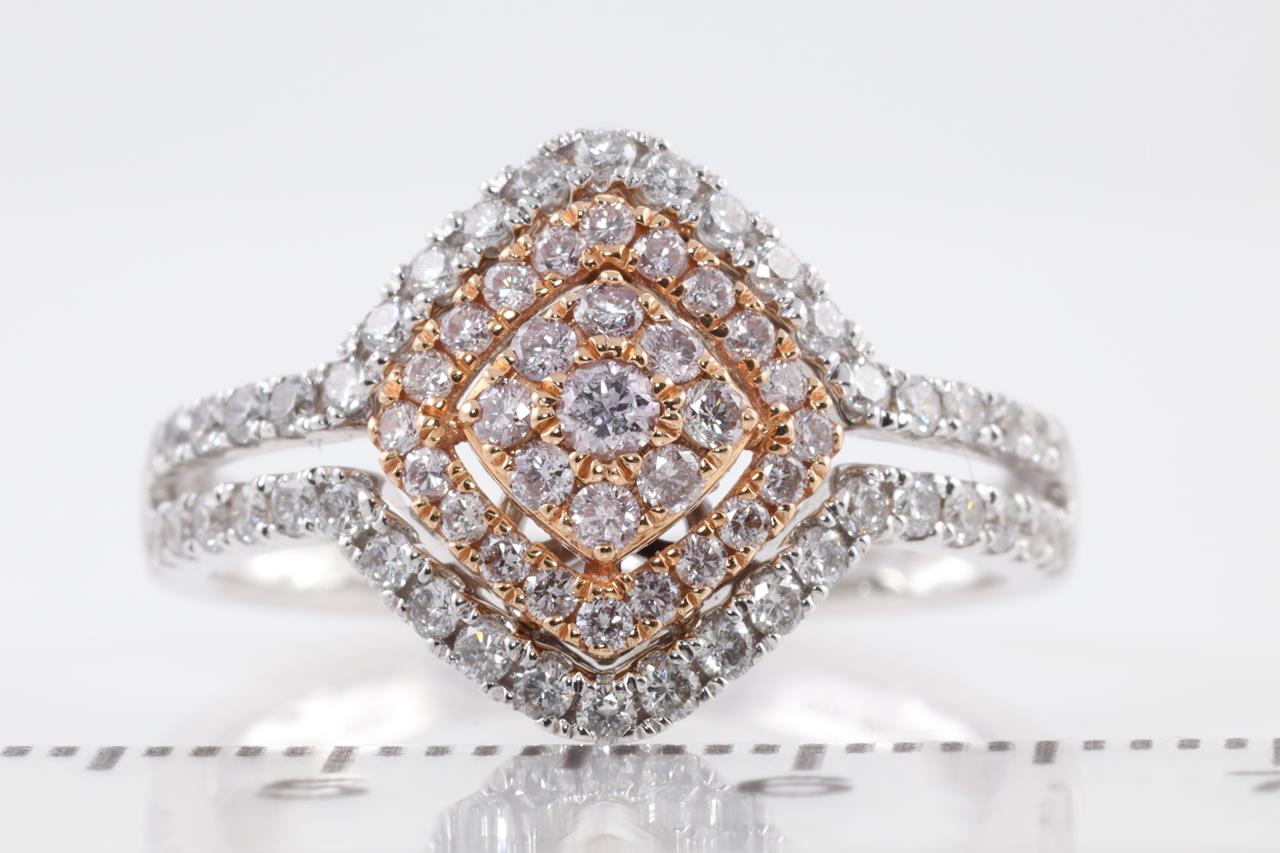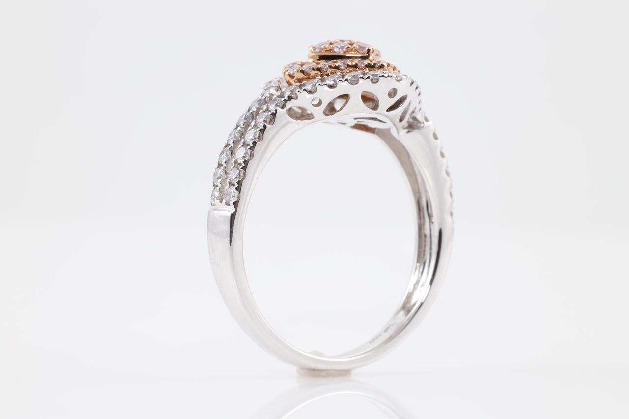Diamond ring with round pink Diamonds totalling 0.33cts (Estimated grading: Natural light pink P1) and white Diamonds totalling 0.49cts (Estimated grading: H SI). 18ct white and rose gold. Ring size N - ring resizing is not recommended. Weight: 4.3g (As New)