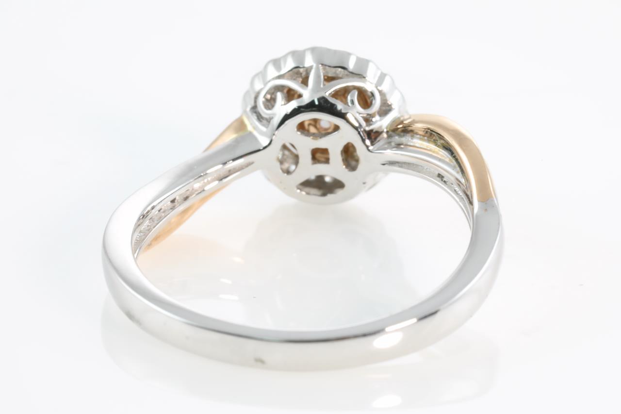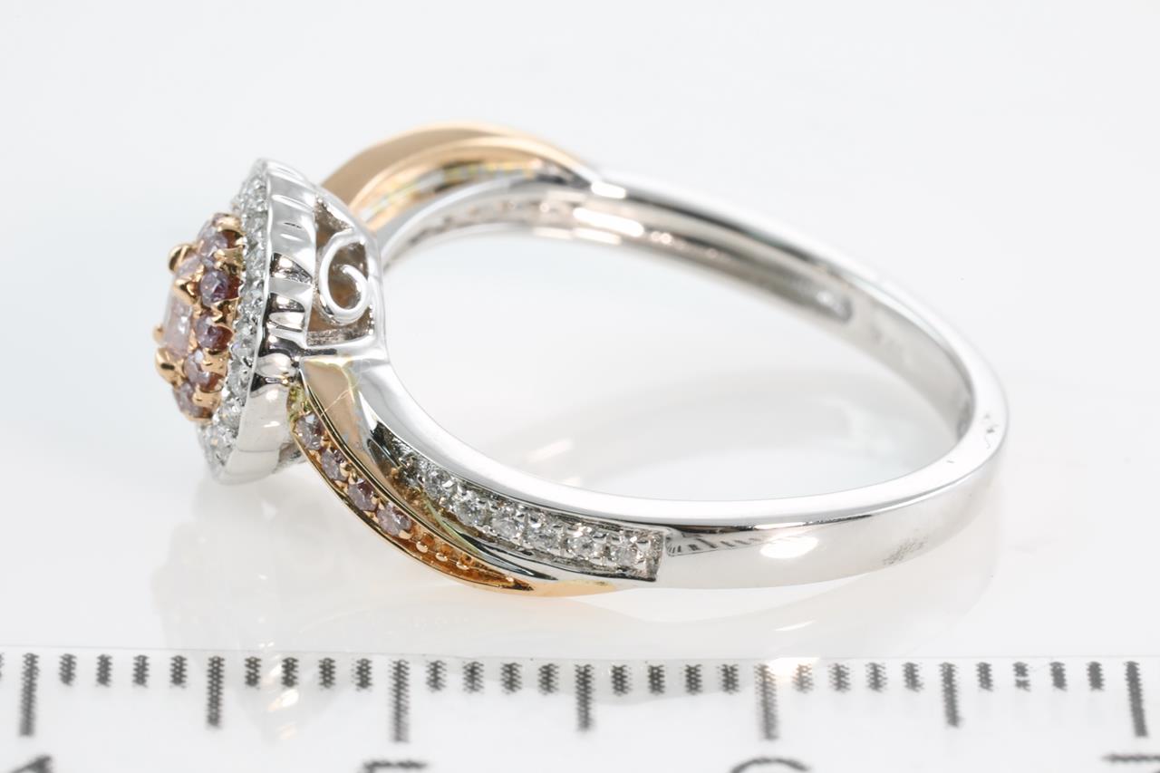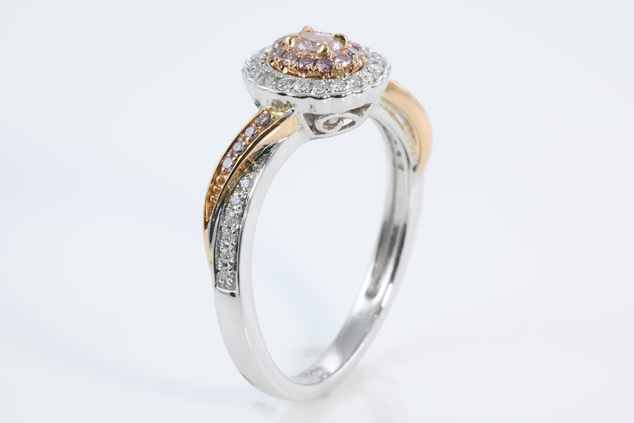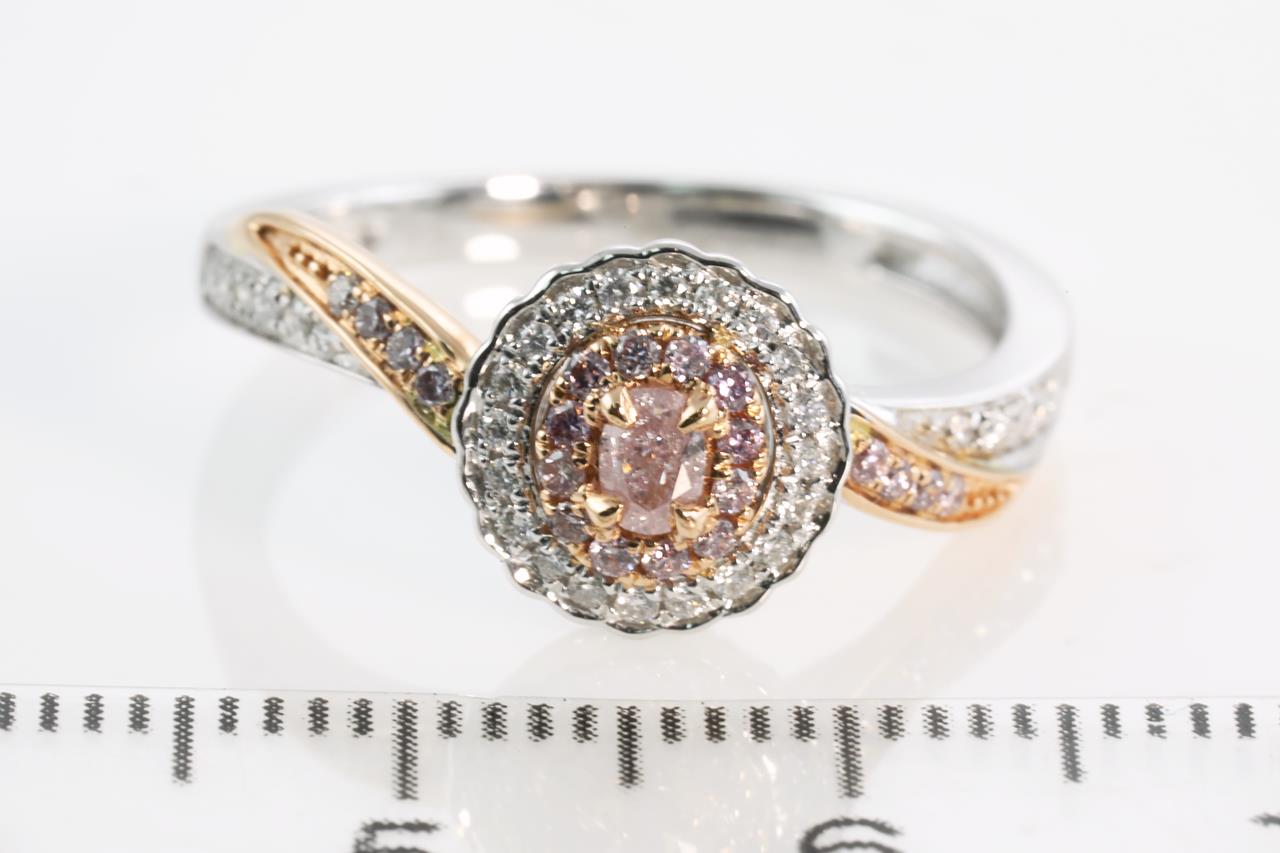 Diamond ring with centre oval Pink Diamond of 0.11ct and remaining pink and white Diamonds totalling 0.25cts (Estimated grading: H-I SI). 18ct white and rose gold. Ring size N1/2. Weight:4.0g (As New)