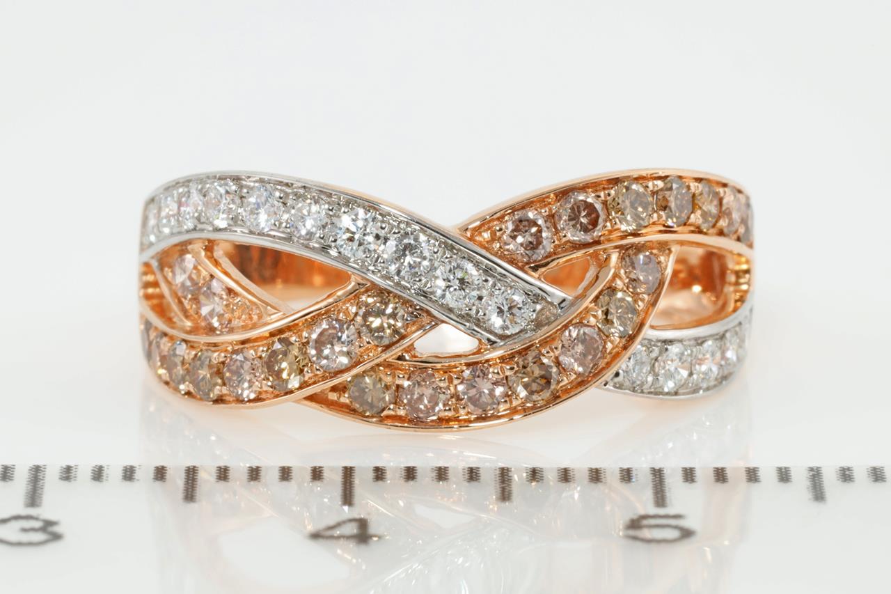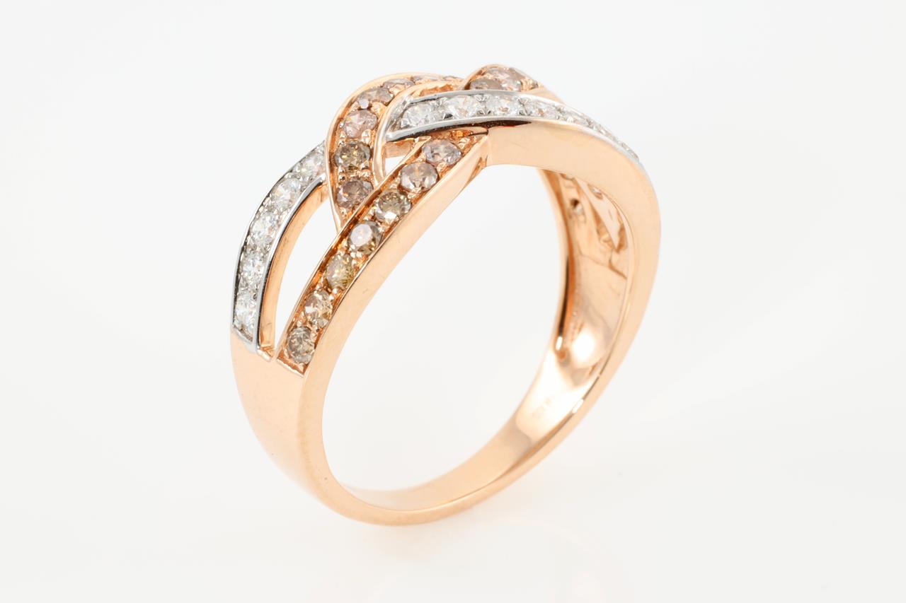 Diamond ring with round Diamonds totalling 0.57cts (Estimated grading: Champagne SI) and white Diamonds totalling 0.24cts. 14ct rose and white gold. Ring size N1/2 - ring resizing up is not recommended, can only be resized down with ring clip. Weight:3.8g (As New)