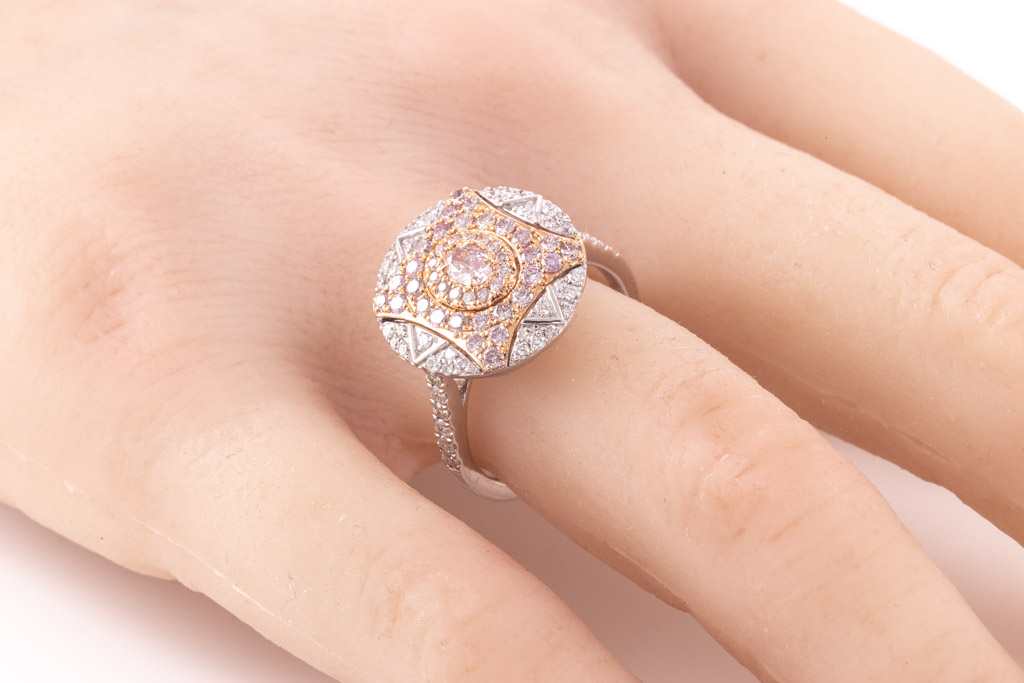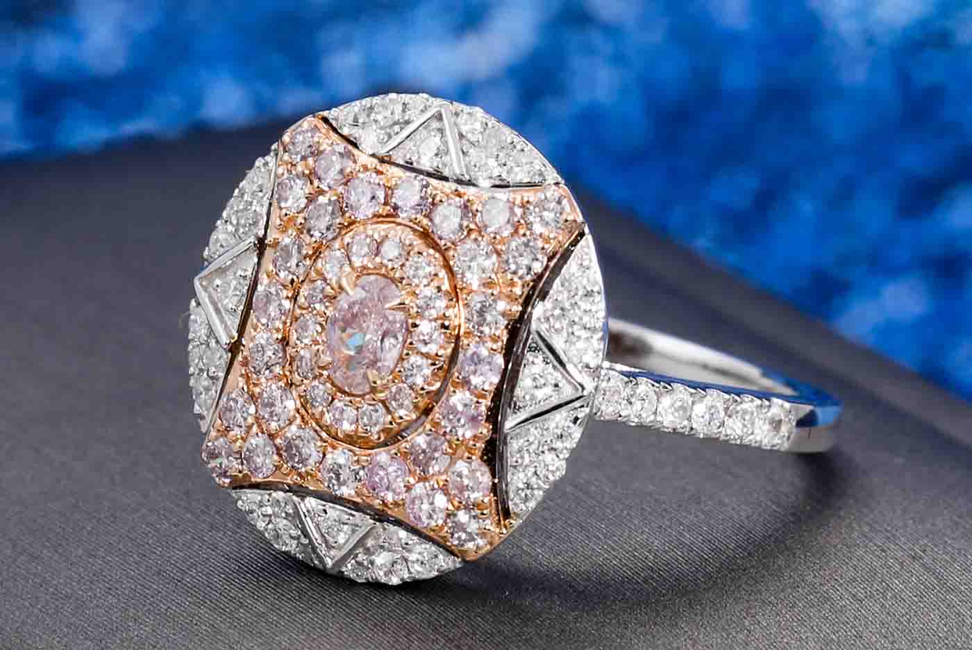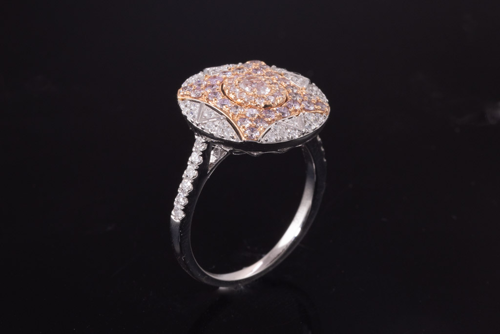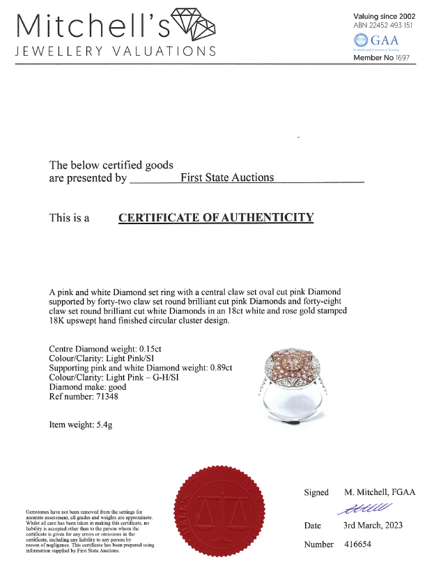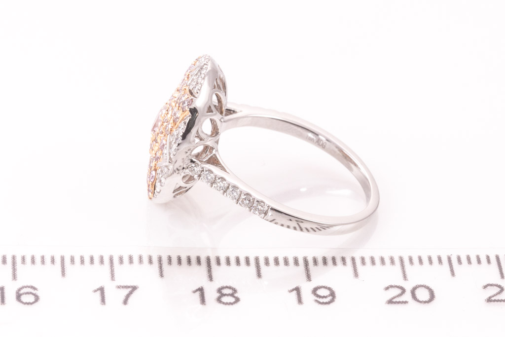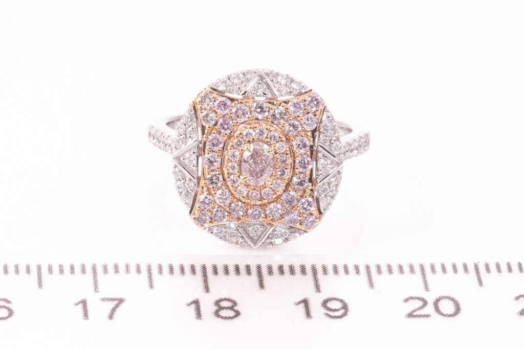 Diamond ring with a centre oval shape Light Pink Diamond of 0.15ct and surrounding round Diamonds totalling 0.89cts (Estimated grading: Light Pink & G-H SI). 18ct rose and white gold. Ring size N - ring resizing is not recommended. Weight: 5.4g. With certificate #416654. (As New)