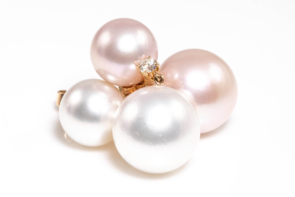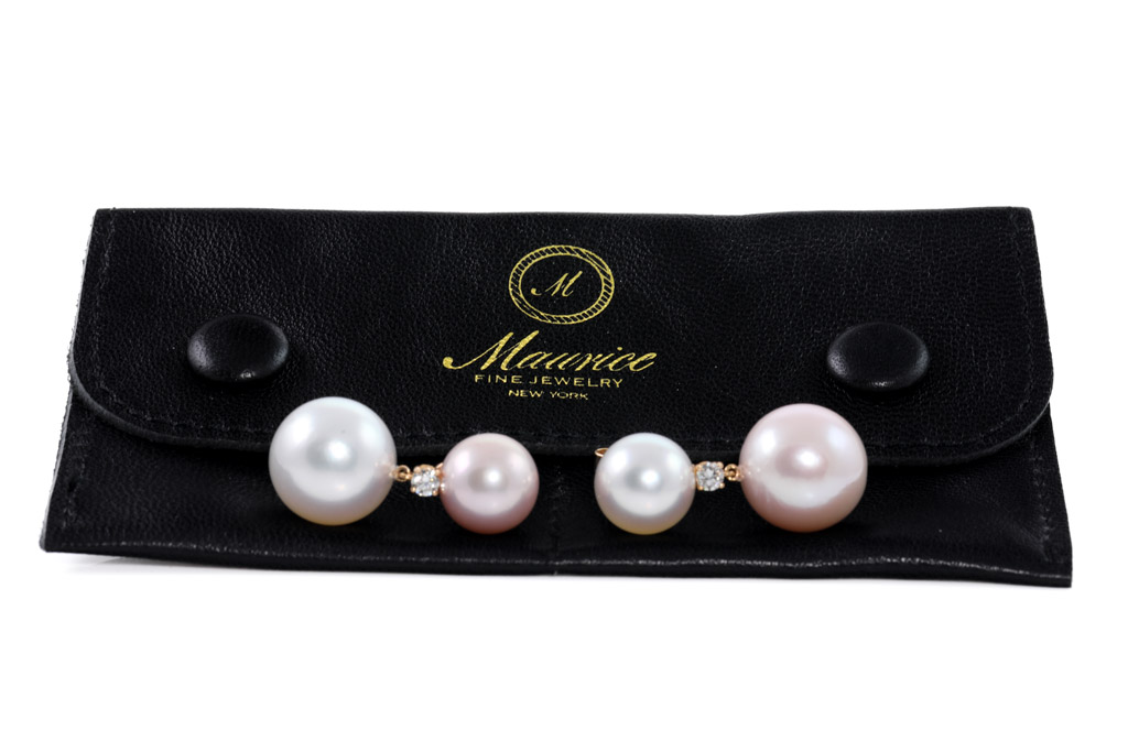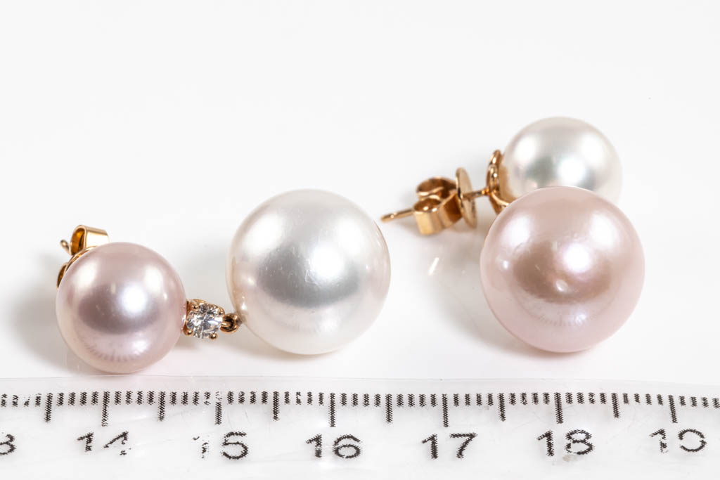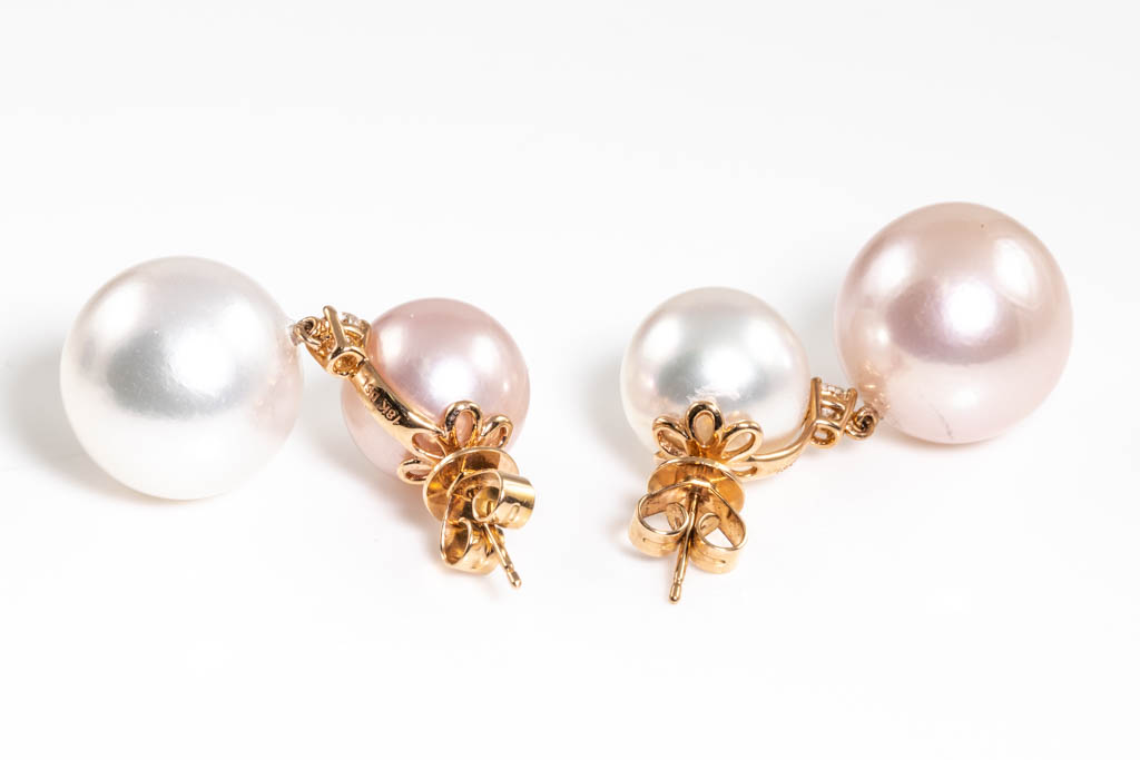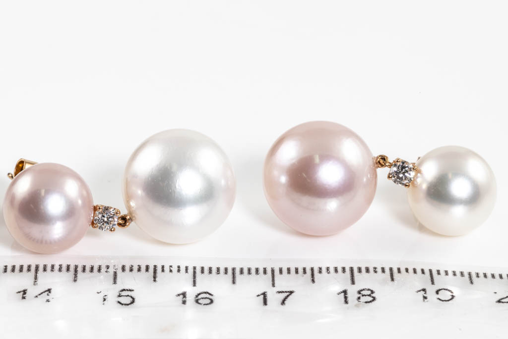Asymmetric Pearl drop earrings with round pink and white South Sea Pearls of 11.7-14mm. And round cut Diamond totalling approximately 0.24cts. 18ct rose gold. Weight 16.3g. With pouch. (Pre-owned)