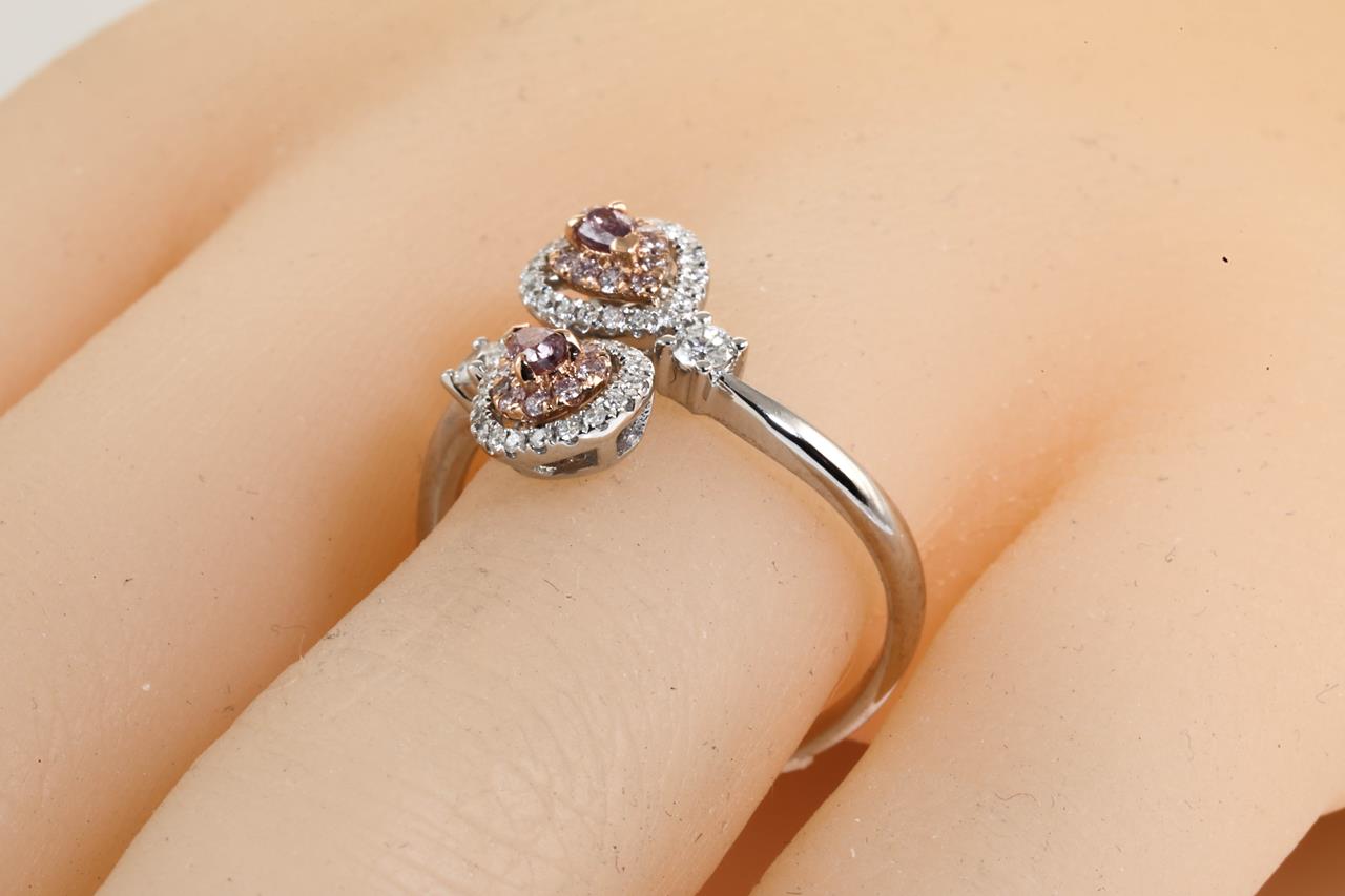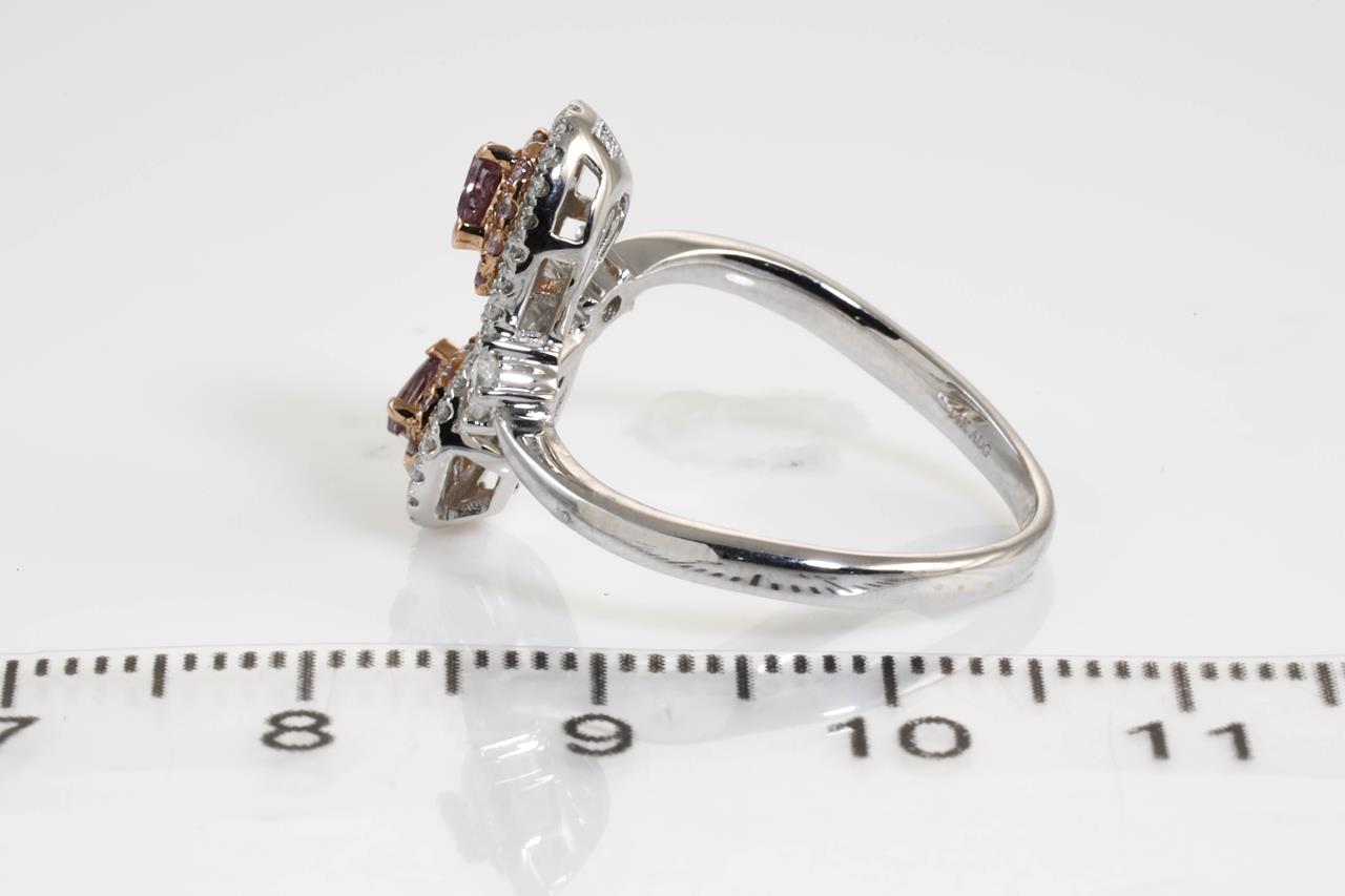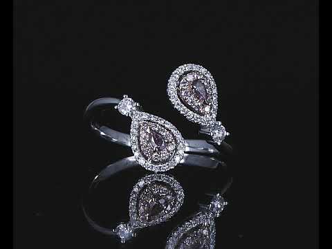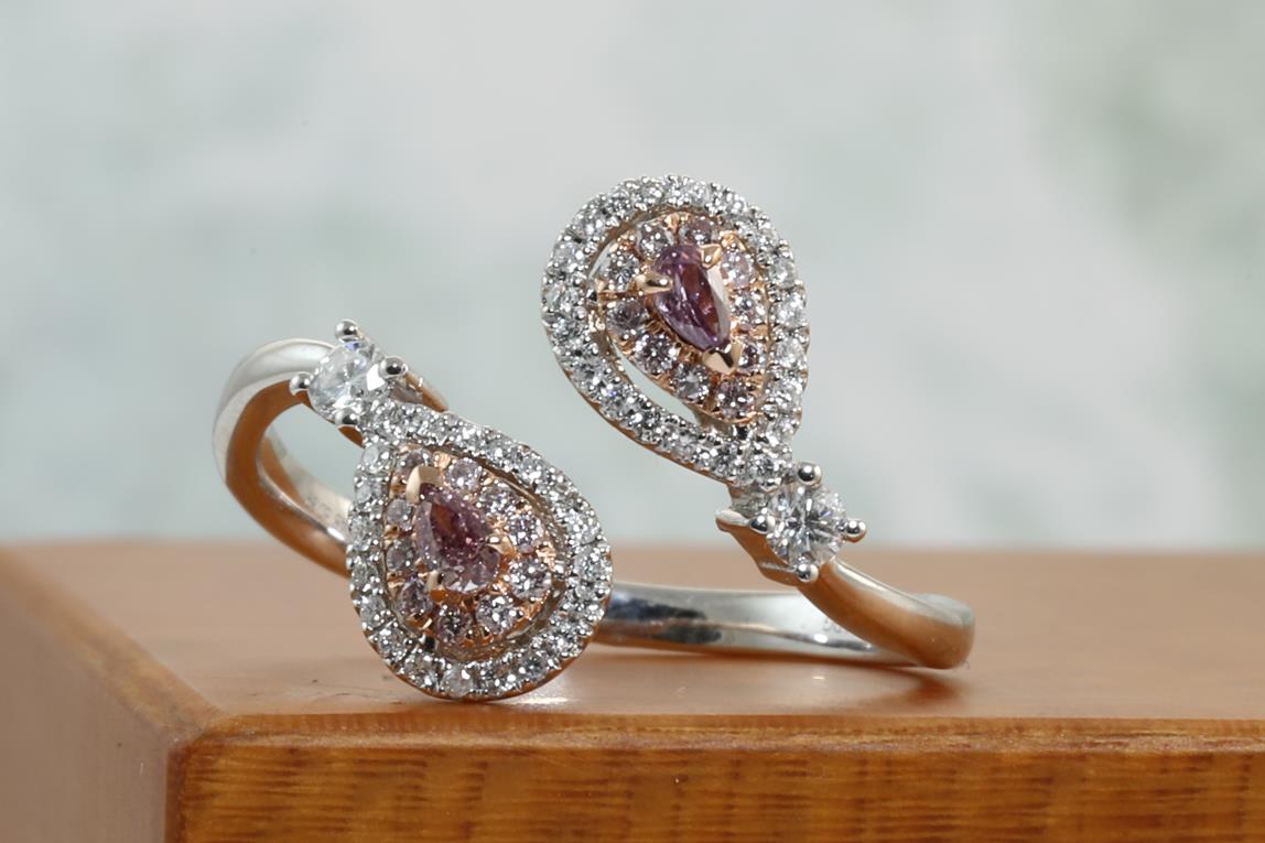 Diamond double halo ring with 2 centre pear shape Diamonds totalling 0.14cts and remaining Diamonds totalling 0.39cts (Estimated grading: Pink SI, G-H SI-P1). 14ct rose & white gold. Ring size N - self adjustable. Weight: 3.4g. (As new)