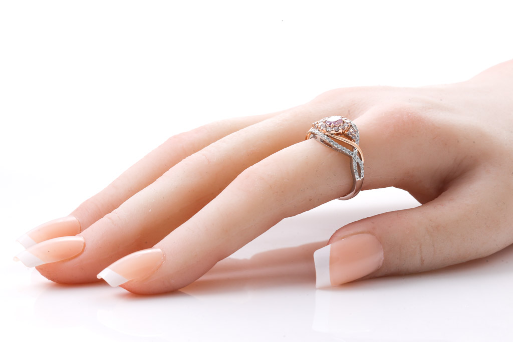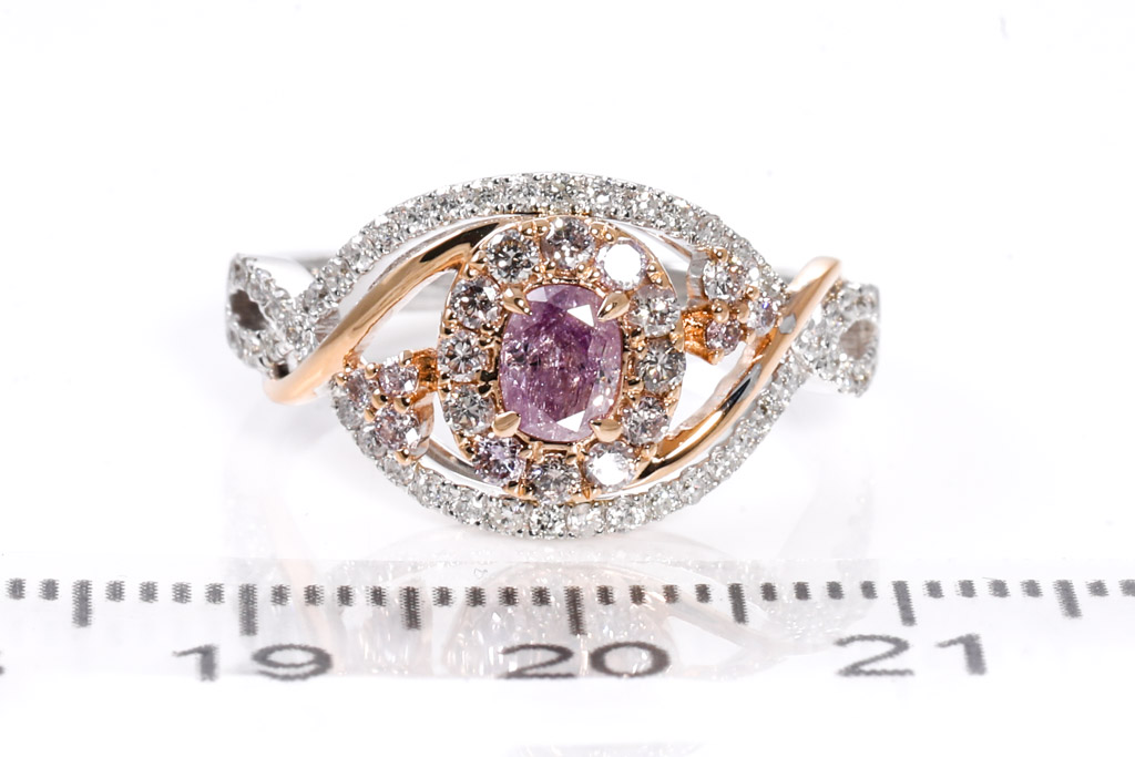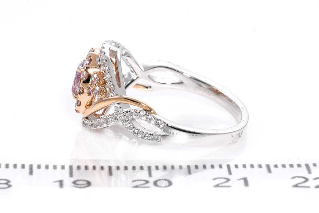 Diamond dress ring with oval pink Diamond of 0.37ct (Estimated grading: Brownish Pink P3) and sunrrounding round Diamonds totalling 0.63cts (Estimated grading: Light Light Pink & H-I P1-P2). 18ct rose and white gold. Ring size N. Weigth: 4.5g. (As new)