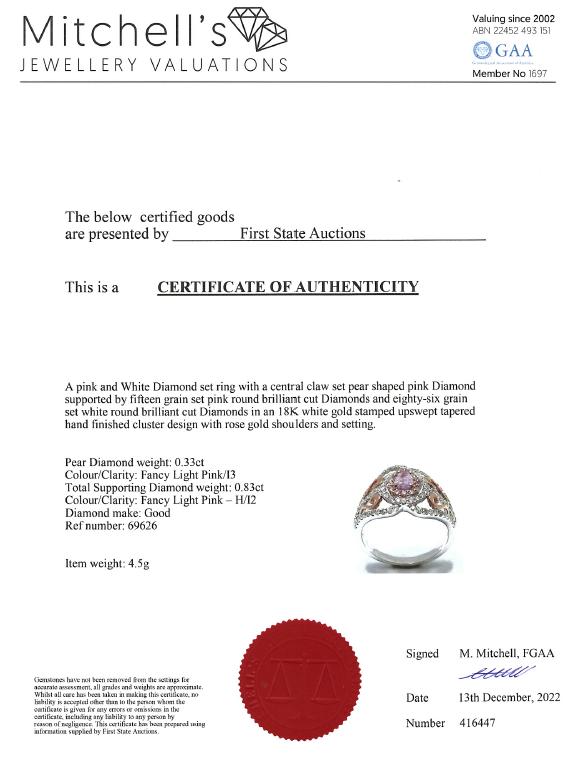 Diamond dress ring with a centre pear shape pink Diamond of 0.33ct (Estimated grading Fancy Light Pink P3) and surrounding pink & white Diamonds totalling 0.83cts (Estimated grading: Fancy Light Pink & H P2). 18ct white gold and rose gold. Ring size N - ring resizing is not recommended. Weight: 4.5g. With certificate #416447. (As new)